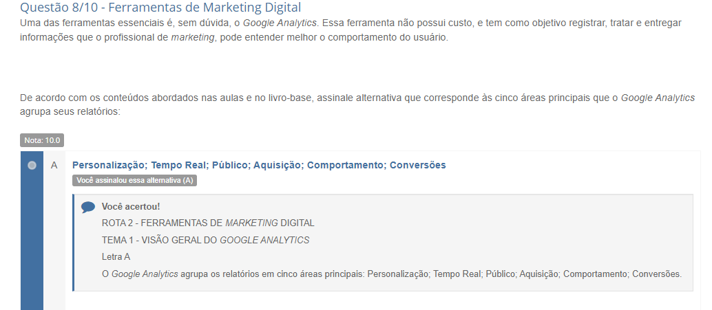 <p>Questão 8/10 - Ferramentas de Marketing Digital Uma das ferramentas essenciais é, sem dúvida, Google Analytics. Essa ferramenta não possui custo, e tem como objetivo registrar, tratar e entregar informações que profissional de pode entender melhor comportamento do De acordo com os conteúdos abordados nas aulas e no assinale alternativa que corresponde às cinco áreas principais que Google Analytics agrupa seus Nota: 10.0 A Tempo Público; Comportamento; Conversões Você assinalou essa alternativa (A) Você acertou! ROTA 2 FERRAMENTAS DE MARKETING DIGITAL TEMA 1 - VISÃO GERAL DO GOOGLE ANALYTICS Letra A Google Analytics agrupa os relatórios em cinco áreas principais: Tempo Público; Comportamento;</p>