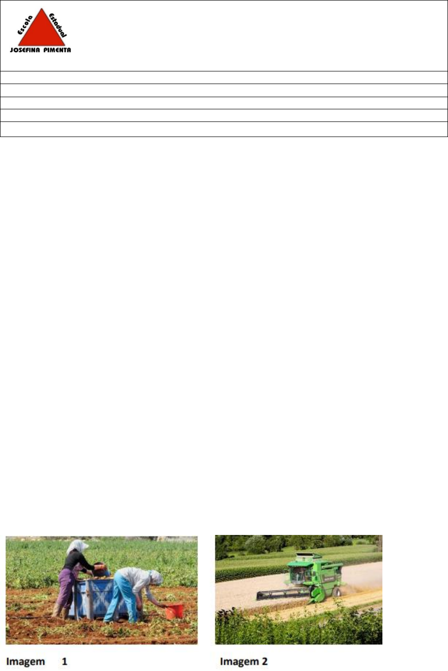 <p>ESCOLA ESTADUAL “JOSEFINA PIMENTA”</p><p>RUA DUVAL PIMENTA, N° 130 – CENTRO</p><p>SÃO JOÃO EVANGELISTA – MG</p><p>E-MAIL: escola.45284@educacao.mg.gov.br</p><p>AVALIAÇÃO –3º BIMESTRE – ANO LETIVO 2024</p><p>DISCIPLINA: GLOBALIZAÇÃO, TECNOLOGIA E TRABALHO TURMA: 1º EMTI</p><p>PROFESSOR: FABÍOLA MORAES VALOR: 10 PONTOS NOTA:</p><p>ALUNO(A):</p><p>ASSINATURA DA SUPERVISÃO:</p><p>1. Sobre a inovação tecnológica no sistema fabril na Inglaterra do século XVIII, é correto</p><p>afirmar que ela:</p><p>a) foi adotada não somente para promover maior eficácia da produção, como também</p><p>para realizar a dominação capitalista, à medida que as máquinas submeteram os traba-</p><p>lhadores a formas autoritárias de disciplina e a uma determinada hierarquia.</p><p>b) ocorreu graças ao investimento em pesquisa tecnológica de ponta, feito pelos in-</p><p>dustriais que participaram da Revolução Industrial.</p><p>c) nasceu do apoio dado pelo Estado à pesquisa nas universidades.</p><p>d) deu-se dentro das fábricas, cujos proprietários estimulavam os operários a desen-</p><p>volver novas tecnologias.</p><p>e) foi única e exclusivamente o produto da genialidade de algumas gerações de inven-</p><p>tores, tendo sido adotada pelos industriais que estavam interessados em aumentar a</p><p>produção e, por conseguinte, os lucros.</p><p>2. Como eram os meios de produção antes da Revolução Industrial?</p><p>_________________________________________________________________________</p><p>_________________________________________________________________________</p><p>_________________________________________________________________________</p><p>_________________________________________________________________________</p><p>3. Com o avanço da tecnologia, por meio da ação humana, o método de produção e</p><p>trabalho no campo sofreu muitas mudanças. Uma dessas mudanças foi a inserção de</p><p>máquinas, que realizam uma mesma função que os trabalhadores, porém de uma maneira</p><p>mais rápida. Observe as fotografias a seguir:</p><p>a) As fotografias acima demonstram dois métodos de colheita. O da imagem 1 é a colheita</p><p>manual e da imagem 2, mecanizada. Cite duas consequências geradas pela mecanização</p><p>do campo.</p><p>_________________________________________________________________________</p><p>4. Coloque V para Verdadeiro e F para Falso:</p><p>(___) Com o passar do tempo, novas tecnologias vão sendo desenvolvidas para que a</p><p>produção industrial se torne cada vez mais rentável e lucrativa.</p><p>(___) Processos modernos não aprimoram a eficiência da produção e nem a acelera.</p><p>(___) A modernização dos processos produtivos permitiu que cada vez mais produtos</p><p>customizados e únicos fossem produzidos sem custos extras.</p><p>(___) O mundo digital permitiu também a facilidade de captação dos desejos dos</p><p>consumidores, levando ao desenvolvimento mais rápido de novidades de acordo com as</p><p>necessidades das pessoas.</p><p>(___) Cada vez mais o ser humano possui mais poder sobre uma linha de produção.</p><p>(___) O ser humano não é mais necessário dentro das indústrias para manejar a</p><p>complexidade das operações.</p><p>(___) Com a amenização dos impactos refletidos pelas indústrias, torna-se mais viável</p><p>conciliar o crescimento humano e industrial com a preservação da natureza.</p><p>5. Observe as figuras abaixo e responda às questões abaixo:</p><p>a) Comparando as imagens e as transformações nas indústrias, o número de trabalhadores entre</p><p>elas é igual?</p><p>__________________________________________________________________________</p><p>b) Qual tipo de indústria precisa de mais trabalhadores, a moderna ou a antiga?</p><p>_________________________________________________________________________</p><p>c) Qual modelo de indústria utiliza informática e robôs?</p><p>_________________________________________________________________________</p><p>6. Quais foram as principais mudanças nos meios de produção trazidas pela Revolução</p><p>Industrial?</p><p>_________________________________________________________________________</p><p>_________________________________________________________________________</p><p>_________________________________________________________________________</p><p>_________________________________________________________________________</p><p>7. Quais são os principais desafios associados à implementação de automação e robótica</p><p>na indústria?</p><p>_________________________________________________________________________</p><p>_________________________________________________________________________</p><p>_________________________________________________________________________</p><p>_________________________________________________________________________</p><p>8. Marque (AM) para Agricultura Moderna e (AT) Agricultura Tradicional:</p><p>(....) Uso de diferentes inovações tecnológicas para aumentar a produtividade e melhorar</p><p>a gestão da propriedade rural.</p><p>(....) Uso intensivo de ferramentas de baixa tecnologia, como machado e enxada;</p><p>(....) Busca aprimorar continuamente suas práticas para elevar a produção, aumentando a</p><p>disponibilidade de alimentos para a sociedade e a rentabilidade da fazenda.</p><p>(....) Não existe produção excedente.</p><p>(....) Nem sempre os produtores conhecem manejos atuais que possam minimizar</p><p>eventuais impactos da atividade sobre o meio ambiente.</p><p>(....) Em sua grande maioria, é constituída por profissionais que estão sempre em busca de</p><p>aprendizado e desenvolvimento de habilidades, participando de eventos e se mantendo</p><p>antenados às inovações.</p><p>9. Como é chamado o processo político, econômico e cultural que marca as transforma-</p><p>ções advindas com a Terceira Revolução Industrial?</p><p>a) Metropolização b) Keynesianismo c) G