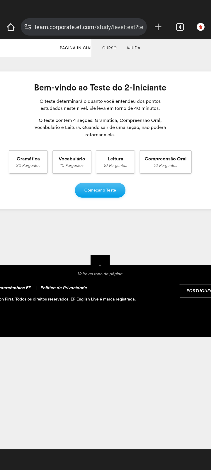 <p>+ 4 PÁGINA INICIAL CURSO AJUDA Bem-vindo ao Teste do 2-Iniciante teste determinará quanto você entendeu dos pontos estudados neste nível. Ele leva em torno de 40 minutos. teste contém 4 seções: Gramática, Compreensão Oral, Vocabulário e Leitura. Quando sair de uma seção, não poderá retornar a ela. Vocabulário Leitura Compreensão Oral 20 Perguntas 10 Perguntas 10 Perguntas 10 Perguntas Começar Teste Volte topo da página EF de Privacidade PORTUGUÊS on First. Todos os direitos reservados. EF English Live é marca registrada.</p>