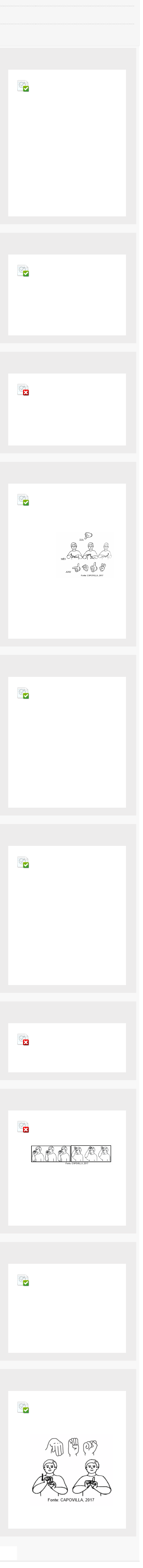 <p>Sábado, 21 de Setembro de 2024 11h00min39s GMT-03:00</p><p>Usuário PEDRO HENRIQUE DE J PIMENTEL</p><p>Curso LINGUA BRASILEIRA DE SINAIS (OPTATIVA)</p><p>Teste QUESTIONÁRIO UNIDADE I</p><p>Iniciado 21/09/24 10:20</p><p>Enviado 21/09/24 10:46</p><p>Status Completada</p><p>Resultado da</p><p>tentativa</p><p>7 em 10 pontos</p><p>Tempo</p><p>decorrido</p><p>26 minutos</p><p>Resultados</p><p>exibidos</p><p>Respostas enviadas, Perguntas respondidas</p><p>incorretamente</p><p>Pergunta 1</p><p>Resposta</p><p>Selecionada:</p><p>c.</p><p>A soletração em língua de sinais</p><p>(chamada de “datilologia”) serve para:</p><p>I- Fazer referência a nomes próprios de</p><p>pessoas ou lugares.</p><p>II- Fazer referência a elementos que não</p><p>possuem um sinal ainda.</p><p>III- Fazer referência a elementos</p><p>linguísticos que a Libras não compreende,</p><p>como preposições, artigos etc.</p><p>Assinale a alternativa correta:</p><p>I e II estão corretas.</p><p>Pergunta 2</p><p>Resposta</p><p>Selecionada:</p><p>e.</p><p>As frases na Libras possuem uma</p><p>estrutura diferente da ordem de frase no</p><p>Português. Assinale a alternativa correta</p><p>em relação à ordem de frase na Libras.</p><p>Objeto – sujeito –</p><p>verbo.</p><p>Pergunta 3</p><p>Resposta</p><p>Selecionada:</p><p>b.</p><p>As letras P, K e H se diferenciam por qual</p><p>parâmetro?</p><p>Con"guração das mãos e</p><p>orientação da palma da</p><p>mão.</p><p>Pergunta 4</p><p>Resposta</p><p>Selecionada:</p><p>d.</p><p>Assinale a alternativa que indica a data</p><p>correta:</p><p>7/junho/2015.</p><p>Pergunta 5</p><p>Resposta</p><p>Selecionada:</p><p>c.</p><p>Assinale verdadeiro (V) ou falso (F):</p><p>I- O surdo tem uma identidade e uma</p><p>cultura próprias.</p><p>II- Todos os surdos fazem leitura labial e</p><p>utilizam a Língua de Sinais.</p><p>III- O surdo precisa ser oralizado para se</p><p>integrar na sociedade ouvinte.</p><p>IV- O uso da Língua de Sinais atrapalha a</p><p>aprendizagem da língua oral.</p><p>Qual alternativa indica somente as frases</p><p>corretas?</p><p>Somente a I.</p><p>Pergunta 6</p><p>Resposta</p><p>Selecionada:</p><p>d.</p><p>Com relação à Língua Brasileira de Sinais,</p><p>assinale verdadeiro (V) ou falso (F):</p><p>I- É uma língua universal, usada por todas</p><p>as pessoas surdas.</p><p>II- Tem vários gestos iguais, que são</p><p>utilizados dependendo do contexto.</p><p>III- É uma forma reduzida da Língua</p><p>Portuguesa.</p><p>IV- A lei que a o"cializou no Brasil foi a Lei</p><p>10.436/2002.</p><p>Qual alternativa indica somente as frases</p><p>corretas?</p><p>Somente a IV.</p><p>Pergunta 7</p><p>Resposta Selecionada: e.</p><p>Das letras a seguir, quais possuem a</p><p>mesma con"guração das mãos?</p><p>M e N.</p><p>Pergunta 8</p><p>Resposta</p><p>Selecionada:</p><p>c.</p><p>Observe os sinais e assinale a alternativa</p><p>que contempla o parâmetro que os</p><p>diferem.</p><p>Movimento.</p><p>Pergunta 9</p><p>Resposta</p><p>Selecionada:</p><p>c.</p><p>Quem é o pro"ssional que garante a</p><p>acessibilidade comunicativa para os</p><p>alunos surdos usuários de Língua de</p><p>Sinais que estão incluídos no Ensino</p><p>Regular?</p><p>O tradutor e intérprete</p><p>de Libras.</p><p>Pergunta 10</p><p>Resposta Selecionada: c.</p><p>Relacione as palavras soletradas com o</p><p>sinal correspondente em Libras.</p><p>MÊS.</p><p>← OK</p><p>Revisar envio do teste: QUESTIONÁRIO UNIDADE I›</p><p>UNIP</p><p>1 em 1 pontos</p><p>1 em 1 pontos</p><p>0 em 1 pontos</p><p>1 em 1 pontos</p><p>1 em 1 pontos</p><p>1 em 1 pontos</p><p>0 em 1 pontos</p><p>0 em 1 pontos</p><p>1 em 1 pontos</p><p>1 em 1 pontos</p><p>Terminar Sessão</p><p>https://ava.ead.unip.br/webapps/assessment/review/review.jsp?attempt_id=_107478911_1&course_id=_357444_1&content_id=_4072156_1&return_content=1&step=#</p>