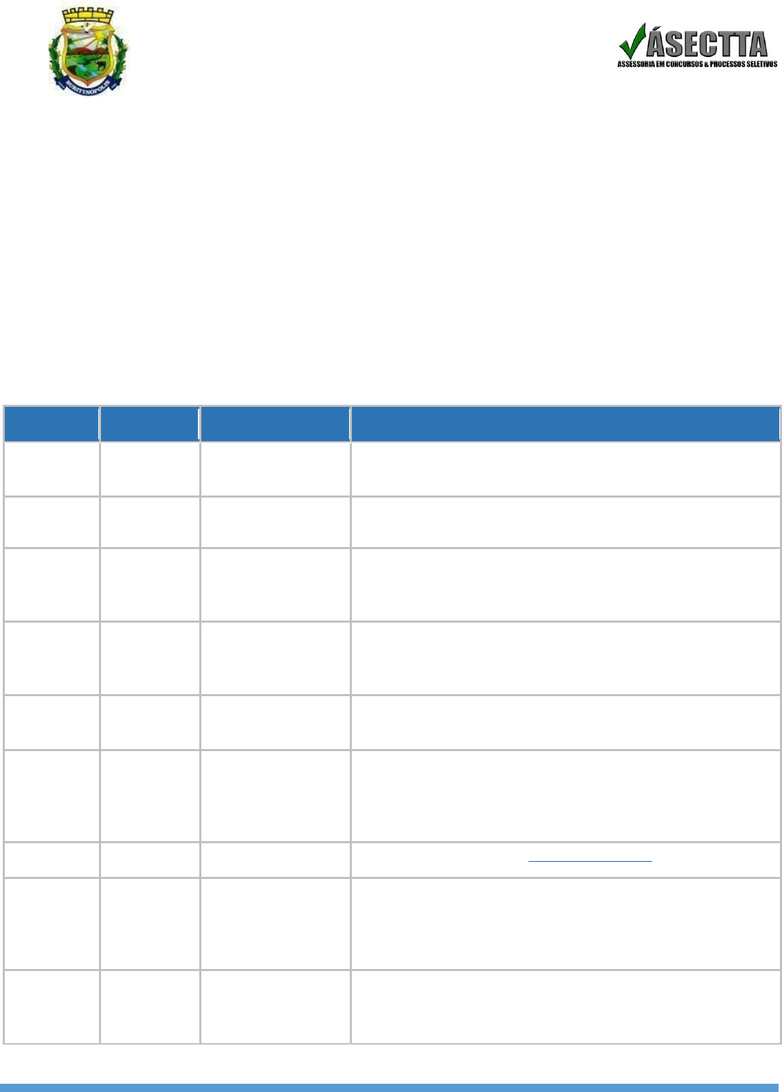 <p>ÁSECTTA - ASSESSORIA EM CONCURSOS & PROCESSOS SELETIVOS - LTDA 1</p><p>CONCURSO PÚBLICO</p><p>PREFEITURA MUNICIPAL DE BURITINOPOLIS</p><p>EDITAL Nº 01/2024</p><p>A Prefeitura Municipal de Buritinópolis – GO, representado pela Prefeita Municipal, no exercício de suas atribuições</p><p>legais, torna público que realizará Concurso Público de Provas para o preenchimento de vagas existentes no quadro</p><p>permanente de servidores, em conformidade com as normas estabelecidas pelo Tribunal de Contas dos Municípios do</p><p>Estado de Goiás. A comissão responsável foi nomeada pelo decreto 1626/2023, seguindo as diretrizes da Legislação</p><p>Municipal, Lei Orgânica do Município, Estatuto dos Servidores Municipais, Plano de Cargos e Salários, e suas</p><p>alterações posteriores, conforme especificado neste edital.</p><p>É obrigação do candidato acompanhar todos os editais referentes ao andamento do presente Concurso Público.</p><p>Retificação</p><p>Onde Se Le.</p><p>ANEXO III</p><p>DO CRONOGRAMA DO CONCURSO PÚBLICO</p><p>DATA HORÁRIO ATIVIDADE DIVULGAÇÃO</p><p>18/03/2024 - Publicação do Edital</p><p>Imprensa Oficial, quadro de avisos da Prefeitura Municipal de</p><p>Buritinópolis - GO e www.asectta.com.br e</p><p>18/04/2024 13hs00min Início das Inscrições Pelos endereços eletrônicos: www.asectta.com.br</p><p>18/04/2024 13hs00min</p><p>Início de Pedido de</p><p>Isenção da taxa de</p><p>inscrição</p><p>Pelos endereços eletrônicos: www.asectta.com.br</p><p>21/04/2024 13hs00min</p><p>Término do Pedido de</p><p>Isenção da Taxa de</p><p>Inscrição</p><p>Pelos endereços eletrônicos: www.asectta.com.br</p><p>22/04/2024</p><p>até às</p><p>23h59min</p><p>Publicação do Pedido</p><p>de Isenção</p><p>Pelos endereços eletrônicos: www.asectta.com.br</p><p>23/04/2024</p><p>até às</p><p>23h59min</p><p>Publicação do Recurso</p><p>de Pedido de Isenção</p><p>Deferimento ou</p><p>Indeferimento</p><p>Pelos endereços eletrônicos: www.asectta.com.br</p><p>15/05/2024 13h00min Término das Inscrições Pelos endereços eletrônicos: www.asectta.com.br</p><p>16/05/2024</p><p>até às</p><p>23h59min</p><p>Publicação da relação</p><p>de candidatos inscritos</p><p>e indeferimentos de</p><p>Inscrições</p><p>Quadro de Avisos do quadro de avisos da Prefeitura Municipal de</p><p>Buritinópolis - GO e www.asectta.com.br e</p><p>www.buritinopolis.go.gov.br.</p><p>03/06/2024</p><p>até às</p><p>23h59min</p><p>Divulgação Local das</p><p>provas</p><p>Quadro de Avisos do quadro de avisos da Prefeitura Municipal de</p><p>Buritinópolis - GO e www.asectta.com.br e</p><p>www.buritinopolis.go.gov.br.</p><p>http://www.asectta.com.br/</p><p>ÁSECTTA - ASSESSORIA EM CONCURSOS & PROCESSOS SELETIVOS - LTDA 2</p><p>CONCURSO PÚBLICO</p><p>PREFEITURA MUNICIPAL DE BURITINOPOLIS</p><p>EDITAL Nº 01/2024</p><p>23/06/2024 Manhã</p><p>08h30min</p><p>Fechamento dos</p><p>Portões para realização</p><p>de provas objetivas</p><p>Quadro de Avisos do quadro de avisos da Prefeitura Municipal de</p><p>Buritinópolis - GO e www.asectta.com.br e</p><p>www.buritinopolis.go.gov.br Local da Prova: A DEFINIR</p><p>24/06/2024</p><p>até às</p><p>23h59min</p><p>Publicação do gabarito</p><p>das provas e inicio do</p><p>Prazo de Recurso</p><p>Quadro de Avisos do quadro de avisos da Prefeitura Municipal de</p><p>Buritinópolis - GO e www.asectta.com.br e</p><p>www.buritinopolis.go.gov.br</p><p>27/06/2024 16h00min</p><p>Encerramento do prazo</p><p>para recursos sobre</p><p>questões das provas</p><p>Quadro de Avisos do quadro de avisos da Prefeitura Municipal de</p><p>Buritinópolis - GO e www.asectta.com.br e</p><p>www.buritinopolis.go.gov.br</p><p>04/07/2024</p><p>até às</p><p>23h59min</p><p>Publicação de decisões</p><p>sobre recursos das</p><p>provas objetivas</p><p>Publicação do</p><p>Resultado Preliminar /</p><p>Inicio do Prazo de</p><p>Recurso do Resultado</p><p>Preliminar</p><p>Quadro de Avisos do quadro de avisos da Prefeitura Municipal de</p><p>Buritinópolis - GO e www.asectta.com.br e</p><p>www.buritinopolis.go.gov.br</p><p>10/07/2024</p><p>até às</p><p>23h59min</p><p>Divulgação do</p><p>Resultado Oficial</p><p>Definitivo apto à</p><p>homologação pelo</p><p>Presidente da</p><p>Prefeitura Municipal de</p><p>Buritinópolis - GO.</p><p>Quadro de Avisos do quadro de avisos da Prefeitura Municipal de</p><p>Buritinópolis - GO e www.asectta.com.br e</p><p>www.buritinopolis.go.gov.br</p><p>http://www.buritinopolis.go.gov.br/</p><p>http://www.buritinopolis.go.gov.br/</p><p>http://www.buritinopolis.go.gov.br/</p><p>http://www.buritinopolis.go.gov.br/</p><p>ÁSECTTA - ASSESSORIA EM CONCURSOS & PROCESSOS SELETIVOS - LTDA 3</p><p>CONCURSO PÚBLICO</p><p>PREFEITURA MUNICIPAL DE BURITINOPOLIS</p><p>EDITAL Nº 01/2024</p><p>Leia – se.</p><p>ANEXO III</p><p>DO CRONOGRAMA DO CONCURSO PÚBLICO</p><p>DATA HORÁRIO ATIVIDADE DIVULGAÇÃO</p><p>18/03/2024 - Publicação do Edital</p><p>Imprensa Oficial, quadro de avisos da Prefeitura Municipal de</p><p>Buritinópolis - GO e www.asectta.com.br e</p><p>18/04/2024 13hs00min Início das Inscrições Pelos endereços eletrônicos: www.asectta.com.br</p><p>18/04/2024 13hs00min</p><p>Início de Pedido de</p><p>Isenção da taxa de</p><p>inscrição</p><p>Pelos endereços eletrônicos: www.asectta.com.br</p><p>21/04/2024 13hs00min</p><p>Término do Pedido de</p><p>Isenção da Taxa de</p><p>Inscrição</p><p>Pelos endereços eletrônicos: www.asectta.com.br</p><p>22/04/2024</p><p>até às</p><p>23h59min</p><p>Publicação do Pedido</p><p>de Isenção</p><p>Pelos endereços eletrônicos: www.asectta.com.br</p><p>23/04/2024</p><p>até às</p><p>23h59min</p><p>Publicação do Recurso</p><p>de Pedido de Isenção</p><p>Deferimento ou</p><p>Indeferimento</p><p>Pelos endereços eletrônicos: www.asectta.com.br</p><p>15/05/2024 13h00min Término das Inscrições Pelos endereços eletrônicos: www.asectta.com.br</p><p>16/05/2024</p><p>até às