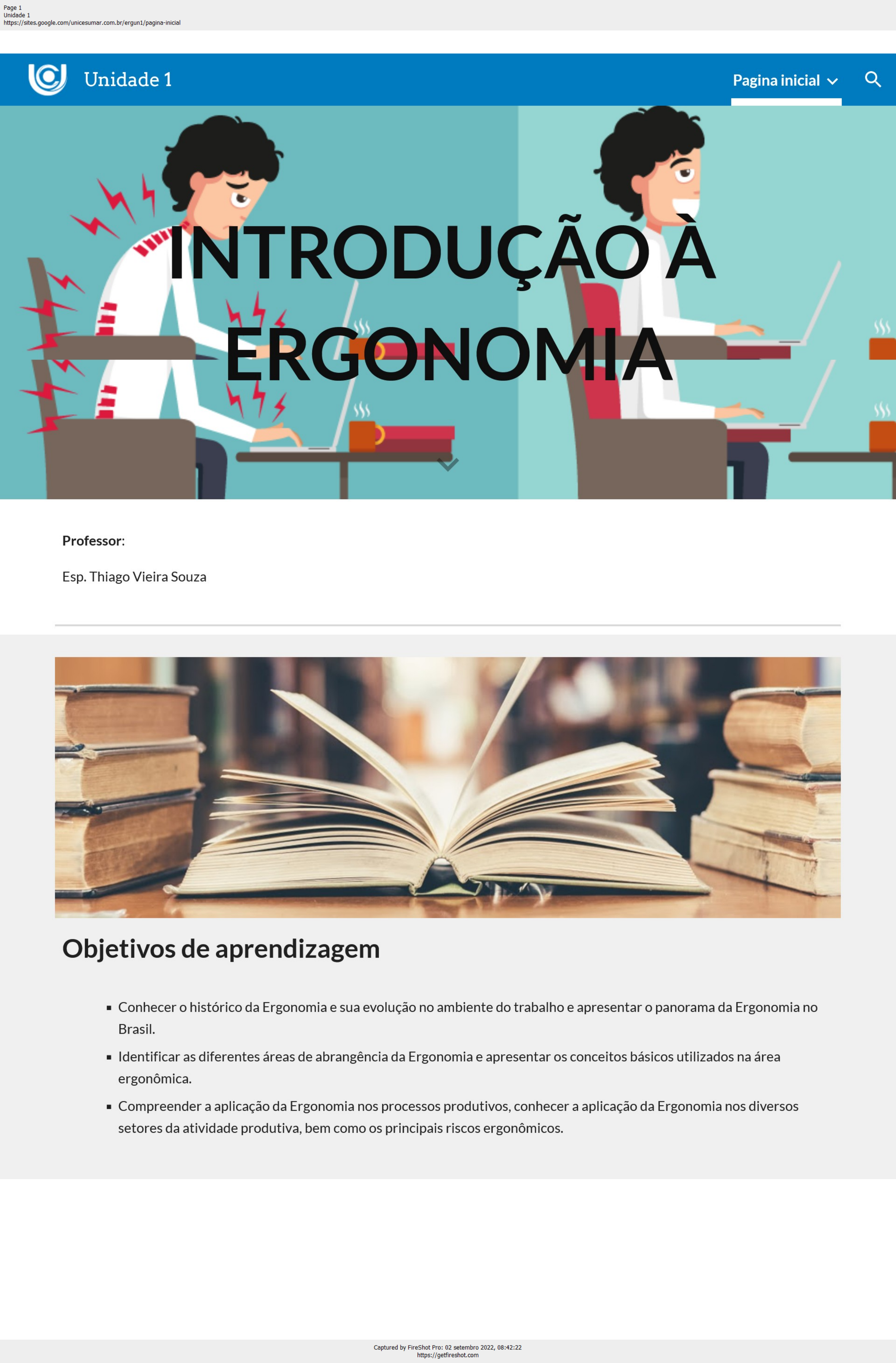 <p>Unidade 1 Pagina inicial</p><p>Pular para o conteúdo principal Pular para a navegação</p><p>INTRODUÇÃO À</p><p>ERGONOMIA</p><p>Professor :</p><p>Esp. Thiago Vieira Souza</p><p>Objetivos de aprendizagem</p><p>Conhecer o histórico da Ergonomia e sua evolução no ambiente do trabalho e apresentar o panorama da Ergonomia no</p><p>Brasil.</p><p>Identificar as diferentes áreas de abrangência da Ergonomia e apresentar os conceitos básicos utilizados na área</p><p>ergonômica.</p><p>Compreender a aplicação da Ergonomia nos processos produtivos, conhecer a aplicação da Ergonomia nos diversos</p><p>setores da atividade produtiva, bem como os principais riscos ergonômicos.</p><p>Plano de estudo</p><p>A seguir, apresentam-se os tópicos que você estudará nesta unidade:</p><p>Definição e evolução da ergonomia</p><p>Áreas de abrangência da ergonomia</p><p>Ergonomia aplicada ao trabalho</p><p>Introdução</p><p>Caro(a) aluno(a), neste encontro teremos o prazer de iniciar os nossos estudos em Ergonomia. Nas aulas a seguir, serão abordados</p><p>diversos assunto que serão fundamentais para sua atuação ergonômica, assim como prepará-lo para exercer com excelência a sua</p><p>profissão. Nos nossos encontros, serão respondidas questões, como: afinal, o que é Ergonomia? Para que utilizá-la? Para que serve?</p><p>Ela é empregada nas atividades produtivas e nos processos de produção?</p><p>Sendo assim, estudaremos toda a trajetória percorrida por essa ciência no Brasil e mundo, entendendo como foi ocorrida a sua</p><p>evolução ao longo dos anos. Além disso, serão apresentados os conceitos de Ergonomia no campo acadêmico Então, você, caro(a)</p><p>aluno(a), perceberá que não existe um único conceito, na verdade, são diversos conceitos aplicados a essa ciência. Entretanto, não</p><p>há certo ou errado, mas sim um complemento de informações para permitir ao aluno um melhor aprofundamento do tema.</p><p>Além disso, aprenderemos as áreas de abrangência da Ergonomia e os principais conceitos utilizados nessa disciplina, para que nos</p><p>nossos próximos encontros você consiga compreender os “jargões” usados nessa temática, como: acidente de trabalho, atividade e</p><p>tarefa.</p><p>Para finalizar o nosso estudo, serão apresentas as diversas atuações da Ergonomia no mundo do trabalho - e você, caro(a) aluno(a),</p><p>verá que ela está presente em variadas áreas da atividade produtiva, como a indústria, comércio, agricultura e, inclusive, no seu dia</p><p>a dia – bem como os riscos ergonômicos reconhecidos pelo Ministério do Trabalho e Previdência Social.</p><p>Pronto(a) para se aventurar nessa importante temática? Espero que, nessas aulas, possamos compartilhar muitos conhecimentos e</p><p>que você consiga absorver o máximo de informação possível.</p><p>Bons estudos!</p><p>Avançar</p><p>UNICESUMAR | UNIVERSO EAD</p><p>Unidade 1 Pagina inicial</p><p>Pular para o conteúdo principal Pular para a navegação</p><p>DEFINIÇÃO E EVOLUÇÃO</p><p>DA ERGONOMIA</p><p>Caro(a) aluno(a), antes de iniciar qualquer estudo é importante entender a origem e o objetivo daquela temática. Com esse</p><p>propósito, nesse encontro, estudaremos a origem da Ergonomia e sua respectiva evolução no contexto laboral, seu panorama no</p><p>Brasil e as suas principais definições.</p><p>A EVOLUÇÃO DA ERGONOMIA NO MUNDO</p><p>A presença da Ergonomia no dia a dia da sociedade, apesar de não notada, é constante desde os tempos do Homem das Cavernas.</p><p>Dado que, ao descobrir que uma simples pedra poderia ser afiada até ficar pontiaguda e se transformar em uma lança ou um</p><p>machado, ou ainda, quando posicionava galhos ou troncos de árvores sob rochas ou outros obstáculos resultando em uma</p><p>alavanca, estavam empregando, nesses exemplos, ferramentas ergonômicas.</p><p>Mas, por que considerar a presença da Ergonomia nesses exemplos?</p><p>Essa pergunta é respondida por meio do significado do nome Ergonomia. O termo ergonomia foi utilizado pela primeira vez, em</p><p>1857, pelo cientista e biólogo polonês Woitej Yastembowky. Por meio da publicação de um artigo intitulado“Ensaios de ergonomia</p><p>ou ciência do trabalho, baseado nas leis objetivas da ciência sobre a natureza”, Yastembowky apresentou o significado da</p><p>ergonomia que se derivou de duas palavras gregas, sendo: ergos (trabalho) e nomos (leis, normas e regras). Dessa forma,</p><p>inicialmente foi classificada como uma ciência que pesquisa, estuda, desenvolve e aplica regras e normas a fim de organizar o</p><p>trabalho, tornando este último compatível com as características físicas e psíquicas do ser humano (BARBOSA FILHO, 2010).</p><p>Mas espera, ainda não consegui compreender o porquê da Ergonomia estar “envolvida” nessa história do homem das cavernas,</p><p>pode explicar melhor?</p><p>Claro, caro(a) aluno(a)! A importante contribuição advinda do estudo apresentado pelo cientista polonês transformou a</p><p>Ergonomia em uma ciência aplicada à facilitar o trabalho executado pelo homem, sendo que se interpreta aqui a palavra “trabalho”</p><p>como algo muito abrangente, em todos os ramos e áreas de atuação. Dessa forma, todas as estratégias adotadas pelo homem da</p><p>caverna foram para facilitar o trabalho dele, como exemplo a caça que era uma das suas atividades principais.</p><p>Másculo (2008) aponta que Woitej Yastembowky propôs uma disciplina com um escopo bastante extenso e com grande</p><p>magnitude de interesses e aplicações, englobando todos os aspectos da atividade humana. A partir da Revolução Industrial é que</p><p>se ressentiu da falta de compatibilidade entre o projeto das máquinas e o operador humano, o que se tornou questão estratégica</p><p>de vital importância na II Guerra Mundial.</p><p>E foi nesse movimento que segundo Iida (2005), a ergonomia tem uma data “oficial” de nascimento, ou seja, 12 de