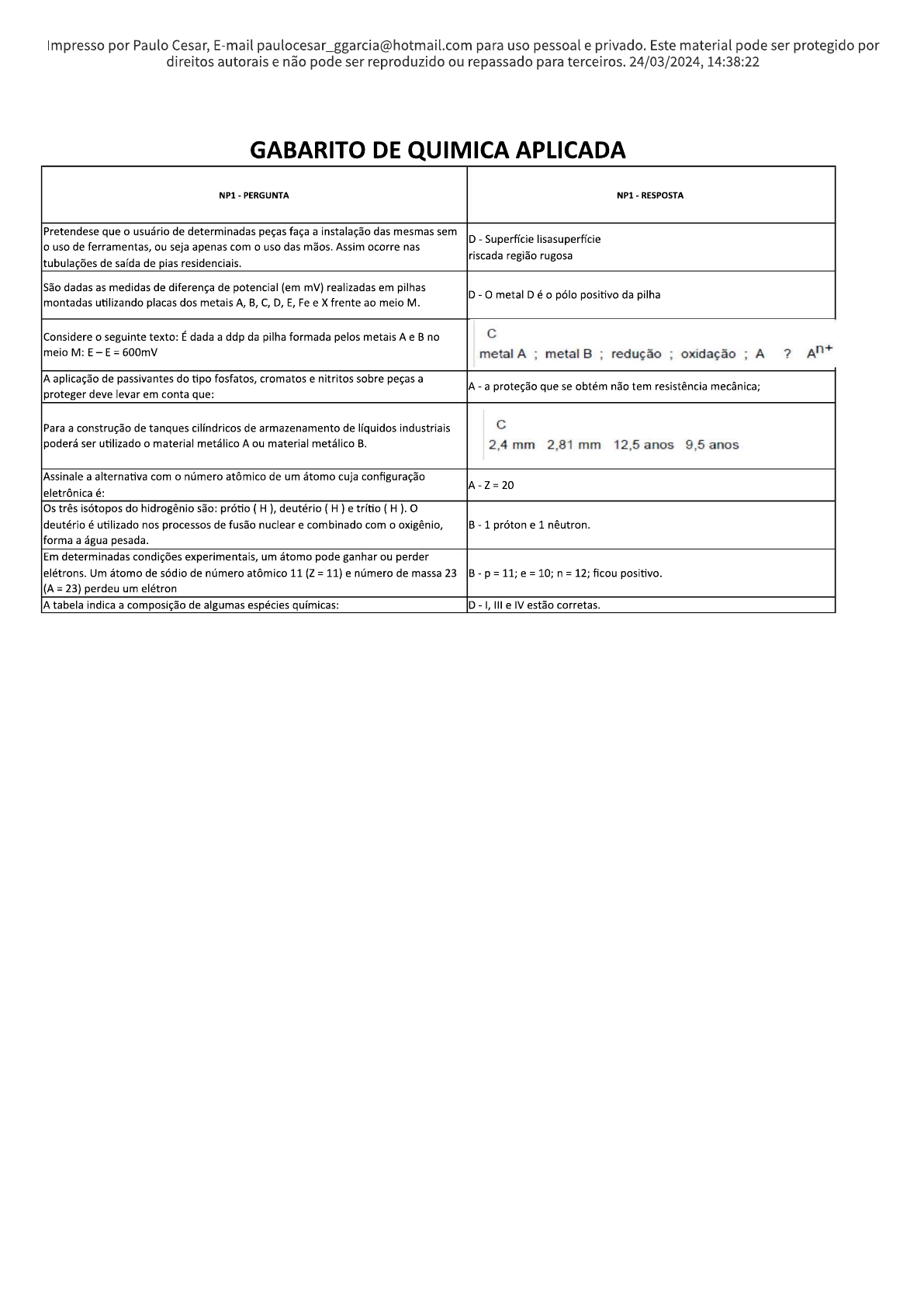 <p>Impresso por Paulo Cesar, E-mail paulocesar_ggarcia@hotmail.com para uso pessoal e privado. Este material pode ser protegido por direitos autorais e não pode ser reproduzido ou repassado para terceiros. 24/03/2024, 14:38:22 GABARITO DE QUIMICA APLICADA NP1 PERGUNTA NP1 RESPOSTA Pretendese que o usuário de determinadas peças faça a instalação das mesmas sem D Superfície lisasuperfície o uso de ferramentas, ou seja apenas com o uso das mãos. Assim ocorre nas riscada região rugosa tubulações de saída de pias residenciais. São dadas as medidas de diferença de potencial (em mV) realizadas em pilhas D o metal D é o pólo positivo da pilha montadas utilizando placas dos metais A, B, C, D, E, Fe e X frente ao meio M. Considere o seguinte texto: É dada a ddp da pilha formada pelos metais A e B no C meio M: E E 600mV metal A ; metal B ; redução ; oxidação ; A ? An+ A aplicação de passivantes do tipo fosfatos, cromatos e nitritos sobre peças a A a proteção que se obtém não tem resistência mecânica; proteger deve levar em conta que: Para a construção de tanques cilíndricos de armazenamento de líquidos industriais C poderá ser utilizado o material metálico A ou material metálico B. 2,4 mm 2,81 mm 12,5 anos 9,5 anos Assinale a alternativa com o número atômico de um átomo cuja configuração eletrônica é: Os três isótopos do hidrogênio são: prótio (H), deutério (H) e trítio (H). o deutério é utilizado nos processos de fusão nuclear e combinado com o oxigênio, B - 1 próton e 1 forma a água pesada. Em determinadas condições experimentais, um átomo pode ganhar ou perder elétrons. Um átomo de sódio de número atômico 11 (Z = 11) e número de massa 23 B p = e = 10; n = ficou positivo. (A = 23) perdeu um elétron A tabela indica a composição de algumas espécies químicas: D I, III e IV estão corretas.</p><p>Impresso por Paulo Cesar, E-mail aulocesar_ggarcia@hotmail.com para uso pessoal e privado. Este material pode ser protegido por direitos autorais e não pode ser reproduzido ou repassado para terceiros. 24/03/2024, 14:38:22 A medida do potencial relativo de diversos metais, num dado meio eletrolítico M, foi realizada conectandose D de Y para U e de U para Y o metal T ao pólo positivo do milivoltímetro. Os dados obtidos constam na tabela abaixo Para executar um projeto hidráulico, um engenheiro dispões dos materiais metálicos A, B, C, D e E. o projeto consiste numa tubulação que será embutida nas D se as válvulas forem construídas com o material E, a tubulação paredes por onde passar e válvulas externas que serão acopladas à mesma. As poderá ser construída com qualquer dos materiais A, B ou C válvulas somente podem ser construídas nos materiais D ou E. Os materiais A, B e poderão ser usados na construção da tubulação São realizadas medidas de potencial de diversos metais frente ao meio M, C D na tubulação e G nas torneiras obtendose: Um projeto adequado de tubulação para distribuição de água de abastecimento público deve incluir uma previsão do tempo de vida útil baseada na taxa de corrosão A 19mm e 19,5mm; 10 anos. do Que relações deve haver, respectivamente, entre os potenciais de redução dos D A<B; A>B; A>B; A<B metais A e B para que A Um reservatório retangular sujeito internamente a corrosão uniforme, possui as F 4, 33 anos. Espessuras: parede lateral = 2,7 mm base: seguintes dimensões: 8,6 mm A resistência média B resistência média Inibidores de Corrosão B e IV Um aluno deseja aplicar uma proteção catódica forçada a uma determinada peça A ligar na peça a proteger o polo negativo da fonte de corrente que deseja proteger, para tanto, deve: contínua, que é o polo de onde saem os elétrons; Por meio de medidas de diferenças de potencial, os metais X, Y, Z, W, U e T foram D fazer um revestimento catódico depositando o metal Z sobre o metal ordenados de acordo com seus potenciais de oxidação crescentes Na armadura de uma estrutura de concreto foram aplicadas barras quadradas de ferro com 2,02 cm de lado. Devido a falhas no lançamento e cura do concreto, uma infiltração permite o contato da água da chuva com a armadura e provoca a B - 4 corrosão uniforme da mesma. As características do material estão na tabela abaixo, e devem ser usados os valores especificados para o material B. São montadas as pilhas indicadas na tabela abaixo e o valor absoluto das respectivas D 130 mV sim 380 Mv forças eletromotrizes;</p><p>Impresso por Paulo Cesar, E-mail paulocesar_ggarcia@hotmail.com para uso pessoal e privado. Este material pode ser protegido por direitos autorais e não pode ser reproduzido ou repassado para terceiros. 24/03/2024, 14:38:22 Por meio de medidas de diferenças de potencial, os metais X, Y, Z, W, U e T foram B catódico anódico ordenados de acordo com seus potenciais de oxidação crescentes. A ordem obtida anódico foi: XYWZTU (o metal que está mais a direita no par analisado sofre corrosão). NP2 PERGUNTA NP2 RESPOSTA Na fixação de elementos em estruturas metálicas por meio de elementos de união como parafusos e soldas devese aplicar uma vedação para evitar a permanência de B Aeração diferencial frestas A aplicação localizada de filmes protetivos à base de fosfatos, nitritos e fosfatos apenas nas regiões formação de pilhas do tipo ativopassivo atacadas por processos corrosivos implica em: São montadas as pilhas indicadas na tabela abaixo e o valor absoluto das respectivas A A/M//M/D forças eletromotrizes; São realizadas medidas de potencial de diversos metais frente ao meio M, D D nos parafusos e B nas chapas obtendose: São realizadas medidas de potencial de diversos metais frente ao meio M, C D na tubulação e G nas torneiras obtendose: São montadas as pilhas indicadas na tabela abaixo e o valor absoluto das respectivas D (-330) forças eletromotrizes; São características da proteção catódica forçada ou por corrente impressa A II, VI 