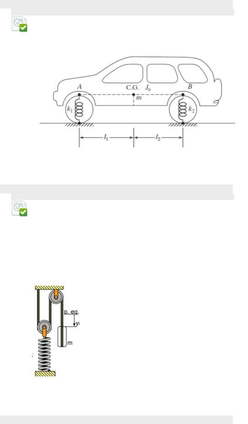 <p>· Pergunta 1</p><p>0,25 em 0,25 pontos</p><p>A figura a seguir representa um sistema de quantos graus de liberdade?</p><p>Resposta Selecionada:</p><p>b.</p><p>2.</p><p>· Pergunta 2</p><p>0,25 em 0,25 pontos</p><p>No sistema ilustrado a seguir, as duas polias são leves e sem atrito. A polia superior tem eixo fixo. A polia inferior está ligada a uma mola de rigidez k = 8,0 kN/m. A mola é ancorada ao piso. Um fio ideal (leve, flexível e inextensível) que passa pelas polias e não escorrega em relação às mesmas liga-se a um bloco de massa m = 10,0 kg e ao teto. A partir da posição de equilíbrio, descola-se o bloco de a0 = 0,3 m e o abandona em repouso. Determine a fase inicial do movimento. Qual a frequência de vibração do sistema?</p><p>Resposta Selecionada:</p><p>d.</p><p>14,4 rad/s.</p><p>· Pergunta 3</p><p>0,25 em 0,25 pontos</p><p>No sistema ilustrado a seguir, as duas polias são leves e sem atrito. A polia superior tem eixo fixo. A polia inferior está ligada a uma mola de rigidez k = 8,0 kN/m. A mola é ancorada ao piso. Um fio ideal (leve, flexível e inextensível) que passa pelas polias e não escorrega em relação às mesmas liga-se a um bloco de massa m = 10,0 kg e ao teto. A partir da posição de equilíbrio, descola-se o bloco de a0 = 0,3 m e o abandona em repouso. Qual a energia mecânica do sistema?</p><p>Resposta Selecionada:</p><p>b.</p><p>90 J.</p><p>· Pergunta 4</p><p>0,25 em 0,25 pontos</p><p>No sistema ilustrado a seguir, a polia de eixo fixo possui raio R = 0,3 m, momento de inércia em relação ao seu centro I = 0,113 kg.m2, gira livremente (sem atrito). Um fio ideal (leve, flexível e inextensível) que passa pela polia e não escorrega em relação à mesma liga-se a um bloco de massa m = 1,5 kg. Outro fio de mesmas características liga o ponto da polia distante d = 0,2 m de seu centro a uma mola de rigidez k = 1.000 N/m. A mola é ancorada a uma parede. A partir da posição de equilíbrio, descola-se o bloco de a0 = 0,01 m e o abandona em repouso. Qual a pulsação do movimento?</p><p>Resposta Selecionada:</p><p>e.</p><p>12,7 rad/s.</p><p>· Pergunta 5</p><p>0,25 em 0,25 pontos</p><p>No sistema ilustrado a seguir, a polia de eixo fixo possui raio R = 0,3 m, momento de inércia em relação ao seu centro I = 0,113 kg.m2, gira livremente (sem atrito). Um fio ideal (leve, flexível e inextensível) que passa pela polia e não escorrega em relação à mesma liga-se a um bloco de massa m = 1,5 kg. Outro fio de mesmas características liga o ponto da polia distante d = 0,2 m de seu centro a uma mola de rigidez k = 1.000 N/m. A mola é ancorada a uma parede. A partir da posição de equilíbrio, descola-se o bloco de a0 = 0,01 m e o abandona em repouso. Qual a energia mecânica do movimento?</p><p>Resposta Selecionada:</p><p>a.</p><p>0,022 J.</p><p>· Pergunta 6</p><p>0,25 em 0,25 pontos</p><p>No sistema ilustrado a seguir, a polia de eixo fixo possui raio R = 0,3 m, momento de inércia em relação ao seu centro I = 0,113 kg.m2, gira livremente (sem atrito). Um fio ideal (leve, flexível e inextensível) que passa pela polia e não escorrega em relação à mesma liga-se a um bloco de massa m = 1,5 kg. Outro fio de mesmas características liga o ponto da polia distante d = 0,2 m de seu centro a uma mola de rigidez k = 1.000 N/m. A mola é ancorada a uma parede. A partir da posição de equilíbrio, descola-se o bloco de a0 = 0,01 m e o abandona em repouso. Qual a equação horária do movimento?</p><p>Resposta Selecionada:</p><p>a.</p><p>y¨ + 161,29 ⋅ y = 0.</p><p>· Pergunta 7</p><p>0,25 em 0,25 pontos</p><p>Um canhão possui cano com massa de 700 kg, cujo recuo se faz por meio de um sistema com mola e amortecedor. Sabendo que a rigidez da mola é de 80.000 N/m, determine a rigidez equivalente do sistema em kN.m.</p><p>Resposta Selecionada:</p><p>b.</p><p>80.</p><p>· Pergunta 8</p><p>0,25 em 0,25 pontos</p><p>Um canhão possui cano com massa de 700 kg, cujo recuo se faz por meio de um sistema com mola e amortecedor. Sabendo que a rigidez da mola é de 80.000 N/m, determine a frequência amortecida</p><p>Resposta Selecionada:</p><p>e.</p><p>N.D.A.</p><p>· Pergunta 9</p><p>0,25 em 0,25 pontos</p><p>Assinale a alternativa incorreta:</p><p>Resposta Selecionada:</p><p>a.</p><p>O amortecimento pode ser feito apenas por molas.</p><p>· Pergunta 10</p><p>0,25 em 0,25 pontos</p><p>Um corpo de massa m, ligado a uma mola de constante elástica k, está animado de um movimento harmônico simples. Na origem das coordenadas:</p><p>Resposta Selecionada:</p><p>d.</p><p>A energia cinética é máxima e a energia potencial é mínima.</p><p>image1.gif</p><p>image2.png</p><p>image3.png</p><p>image4.png</p><p>image5.png</p>