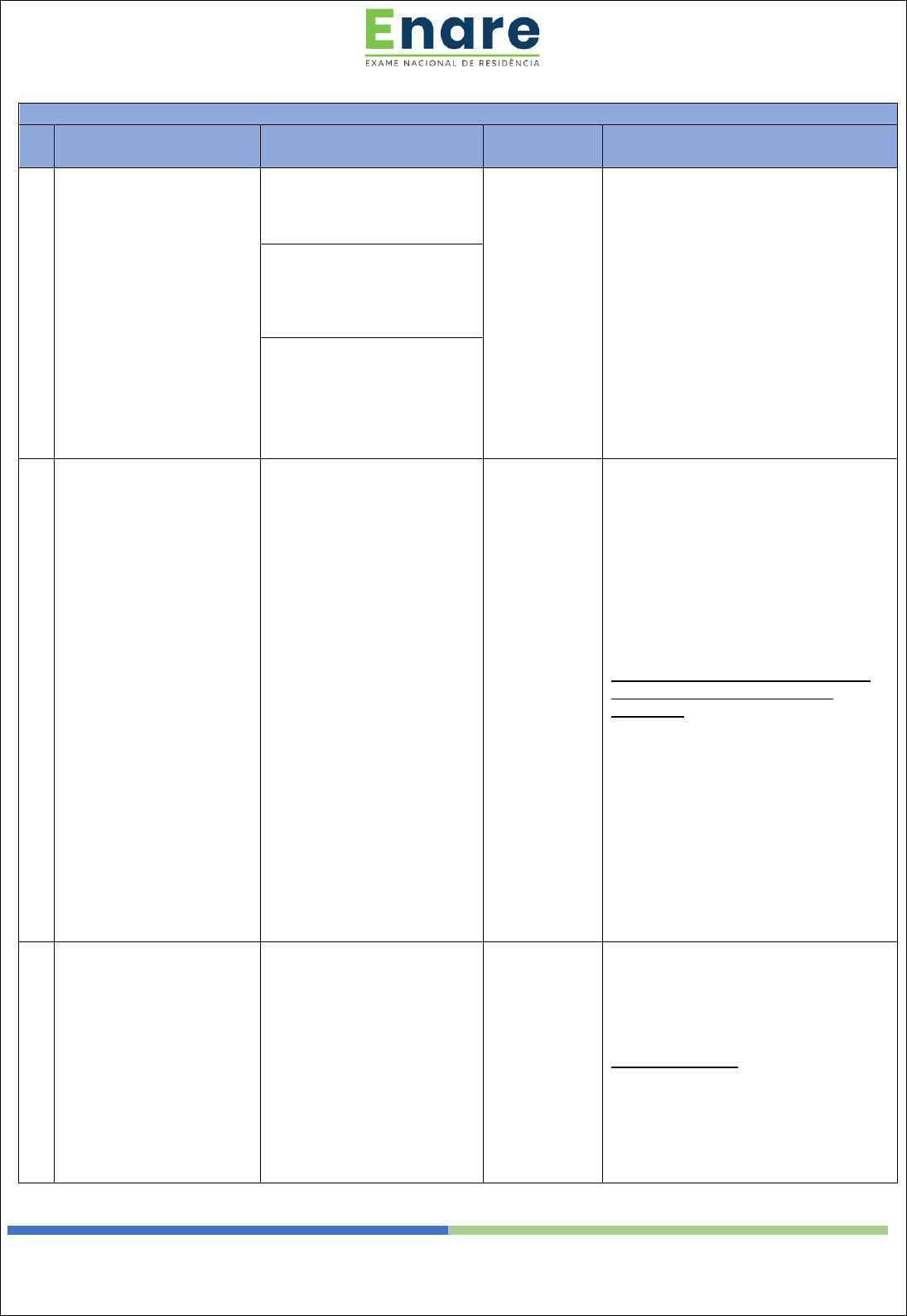 <p>EDITAL Nº 03/2024 - ENARE 2024/2025 (Residência Médica) 21</p><p>TABELA 1</p><p>RESIDÊNCIA MÉDICA – ACESSO DIRETO</p><p>COMPONENTE DO</p><p>CURRÍCULO</p><p>PONTUAÇÃO POR ITEM PONTUAÇÃO</p><p>MÁXIMA</p><p>DOCUMENTO COMPROBATÓRIO</p><p>1</p><p>Histórico Escolar da</p><p>graduação em medicina.</p><p>Frequência de nota/menção:</p><p>Pelo menos 50% de menção</p><p>“A” ou “SS”, ou nota 9 a 10</p><p>ou 90 a 100 – 50 pontos.</p><p>50</p><p>Cópia do Histórico escolar assinado</p><p>pelo representante da IES (Instituição</p><p>de Educação Superior) com o nome</p><p>das disciplinas e respectivas notas.</p><p>*Não serão pontuadas declarações</p><p>apenas com a média/coeficiente de</p><p>rendimento.</p><p>Na ausência do Histórico Escolar, este</p><p>item não será pontuado.</p><p>Para alunos concluintes do curso até</p><p>02/2025 será considerado o histórico</p><p>atualizado até a data do último</p><p>semestre concluído.</p><p>Frequência de nota/menção:</p><p>Pelo menos 50% de menção</p><p>“A e B” ou “SS e MS”, ou</p><p>nota 7 a 10 ou 70 a 100 – 40</p><p>pontos.</p><p>Frequência de nota/menção:</p><p>Pelo menos 50% de menção</p><p>“A, B ou C” ou “SS, MS e</p><p>MM”, ou nota 5 a 10 ou 50 a</p><p>100 – 30 pontos.</p><p>2</p><p>Programa ou projeto de</p><p>Extensão na área da</p><p>saúde devidamente</p><p>cadastrado na Pró- reitoria</p><p>ou Coordenação de</p><p>Extensão da IES (no</p><p>mínimo 30 horas por</p><p>programa ou projeto).</p><p>(Exceto Liga Acadêmica e</p><p>cursos de extensão)</p><p>4,0 pontos por programa ou</p><p>projeto</p><p>8</p><p>Certificado ou declaração emitido e</p><p>assinado pela Pró-reitoria de Extensão</p><p>ou órgão equivalente da IES específico</p><p>para atividades na modalidade de</p><p>extensão, com a carga horária e o</p><p>nome do projeto.</p><p>Pontuação considerada para programa</p><p>ou projeto com no mínimo 30 horas na</p><p>modalidade extensão.</p><p>Não serão aceitos participação em</p><p>ligas acadêmicas e cursos de</p><p>extensão.</p><p>Apenas será aceito certificado ou</p><p>declaração, emitido e assinado pela</p><p>Pró-reitoria de Extensão ou órgão</p><p>equivalente da IES específico, de</p><p>programas ou projetos concluídos nos</p><p>últimos 5 (cinco) anos, até a data-limite</p><p>para análise curricular, prevista no</p><p>anexo VI- cronograma deste edital.</p><p>Será pontuada a participação de</p><p>bolsista e voluntário.</p><p>3</p><p>Participação em eventos,</p><p>prestação de serviços,</p><p>oficinas de extensão,</p><p>cursos de</p><p>extensão e Vivências no</p><p>SUS: VER-SUS,</p><p>ViverSUS, SEVI SUS e</p><p>EV-SUS (mínimo 20</p><p>horas).</p><p>0,5 por evento.</p><p>3</p><p>Certificado ou declaração emitido e</p><p>assinado pelo representante da IES</p><p>específico para atividades de eventos,</p><p>prestação de serviços e oficinas na</p><p>modalidade de extensão.</p><p>Vivências no SUS</p><p>Certificado ou declaração emitido e</p><p>assinado pelo representante da IES</p><p>e/ou Escola de Saúde Pública e/ou</p><p>representante legal da instituição</p><p>organizadora e/ou Secretarias</p><p>EDITAL Nº 03/2024 - ENARE 2024/2025 (Residência Médica) 22</p><p>RESIDÊNCIA MÉDICA – ACESSO DIRETO</p><p>COMPONENTE DO</p><p>CURRÍCULO</p><p>PONTUAÇÃO POR ITEM PONTUAÇÃO</p><p>MÁXIMA</p><p>DOCUMENTO COMPROBATÓRIO</p><p>Estaduais ou Municipais de Saúde e/ou</p><p>Ministério da Saúde.</p><p>Apenas será aceito certificado de</p><p>participação realizados nos últimos 5</p><p>(cinco) anos, até a data-limite para</p><p>análise curricular, prevista no anexo</p><p>VI- cronograma deste edital.</p><p>4</p><p>Monitoria em componente</p><p>curricular regulares da</p><p>graduação devidamente</p><p>cadastrada na Pró-reitoria</p><p>ou Coordenação de</p><p>Graduação da IES.</p><p>Será considerado o</p><p>semestre letivo. (entende-</p><p>se por semestre</p><p>acadêmico o período igual</p><p>ou superior a 90 dias</p><p>letivos, e cada 1 ano</p><p>corresponde a 2</p><p>semestres).</p><p>3,0 pontos por semestre</p><p>letivo.</p><p>9</p><p>Certificado ou declaração emitido e</p><p>assinado pela Pró-reitoria de</p><p>Graduação ou órgão equivalente da</p><p>IES, com o nome da disciplina e</p><p>período de participação.</p><p>Somente serão considerados</p><p>certificado com carga horária de 12</p><p>horas semanais e com o nome do</p><p>componente curricular.</p><p>Será pontuada a participação de</p><p>bolsista e voluntário.</p><p>5</p><p>Atividade de Pesquisa nas</p><p>modalidades Programa</p><p>Institucional de Bolsas de</p><p>Iniciação Cientifica/PIBIC,</p><p>Programa Institucional de</p><p>Bolsas de Iniciação à</p><p>Docência/ PIBID,</p><p>Programa Institucional de</p><p>Bolsas de Iniciação em</p><p>Desenvolvimento</p><p>Tecnológico e Inovação/</p><p>PIBITI, Iniciação Científica</p><p>Voluntária/ICV, Iniciação</p><p>em Desenvolvimento</p><p>Tecnológico Voluntário/</p><p>ITV ou atividade de</p><p>Pesquisa e Inovação</p><p>Tecnológica, período ≥ 1</p><p>ano, devidamente</p><p>registrada na IES ou em</p><p>Instituição Científica,</p><p>Tecnológica e de</p><p>Inovação (ICT).</p><p>6,0 pontos por atividade.</p><p>12</p><p>Certificado ou declaração emitido e</p><p>assinado pelo pela Pró-reitoria de</p><p>pesquisa ou órgão equivalente da IES</p><p>ou Instituição Científica, Tecnológica e</p><p>de Inovação (ICT), contendo o período</p><p>de participação e nome do projeto.</p><p>Será pontuada a participação de</p><p>bolsista e voluntário.</p><p>6</p><p>Trabalhos científicos</p><p>apresentados em</p><p>Congresso, Seminários,</p><p>Simpósios, Fóruns e</p><p>Jornada Científica</p><p>Regional / Local.</p><p>0,3 pontos por trabalho.</p><p>1,5</p><p>Certificado de apresentação do</p><p>trabalho emitido pelo</p><p>Congresso,Seminários, Simpósios,<