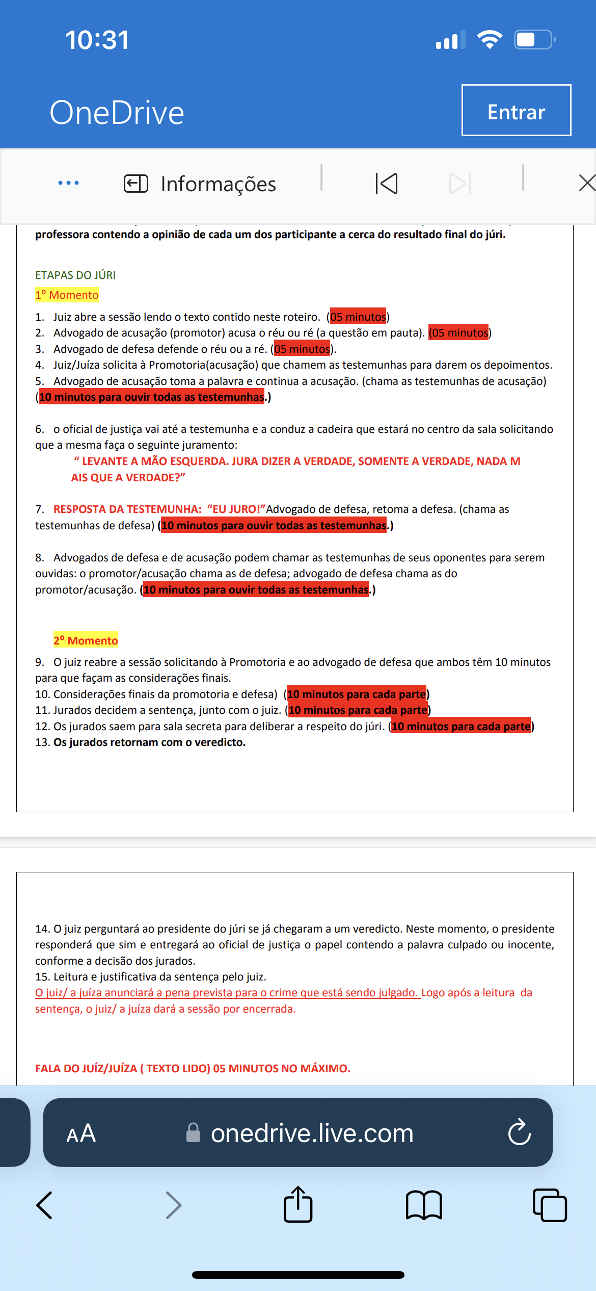 <p>10:31 OneDrive Entrar Informações professora contendo a opinião de cada um dos participante a cerca do resultado final do júri. ETAPAS DO 1° Momento 1. Juiz abre a sessão lendo o texto contido neste roteiro. 05 minutos) 2. Advogado de acusação (promotor) acusa o réu ou ré (a questão em pauta). minutos 3. Advogado de defesa defende o réu ou a ré. (05 minutos). 4. Juiz/Juíza solicita à que chamem as testemunhas para darem os depoimentos. 5. Advogado de acusação toma a palavra e continua a acusação. (chama as testemunhas de acusação) (10 minutos para ouvir todas as testemunhas.) 6. o oficial de justiça vai até a testemunha e a conduz a cadeira que estará no centro da sala solicitando que a mesma faça o seguinte juramento: " LEVANTE A MÃO ESQUERDA. JURA DIZER A VERDADE, SOMENTE A VERDADE, NADA M AIS QUE A VERDADE?" 7. RESPOSTA DA TESTEMUNHA: "EU JURO!"Advogado de defesa, retoma a defesa. (chama as testemunhas de defesa) (10 minutos para ouvir todas as testemunhas.) 8. Advogados de defesa e de acusação podem chamar as testemunhas de seus oponentes para serem ouvidas: o promotor/acusação chama as de defesa; advogado de defesa chama as do promotor/acusação. (10 minutos para ouvir todas as testemunhas.) 2° Momento 9. o juiz reabre a sessão solicitando à Promotoria e ao advogado de defesa que ambos têm 10 minutos para que façam as considerações finais. 10. Considerações finais da promotoria e defesa) (10 minutos para cada parte) 11. Jurados decidem a sentença, junto com o juiz. (10 minutos para cada parte) 12. Os jurados saem para sala secreta para deliberar a respeito do júri. (10 minutos para cada parte) 13. Os jurados retornam com o veredicto. 14. o juiz perguntará ao presidente do júri se já chegaram a um veredicto. Neste momento, o presidente responderá que sim e entregará ao oficial de justiça o papel contendo a palavra culpado ou inocente, conforme a decisão dos jurados. 15. Leitura e justificativa da sentença pelo juiz. o juiz/ a juíza anunciará a pena prevista para o crime que está sendo julgado. Logo após a leitura da sentença, o juiz/ a juíza dará a sessão por encerrada. FALA DO JUÍZ/JUÍZA ( TEXTO LIDO) 05 MINUTOS NO MÁXIMO. AA onedrive.live.com</p>
