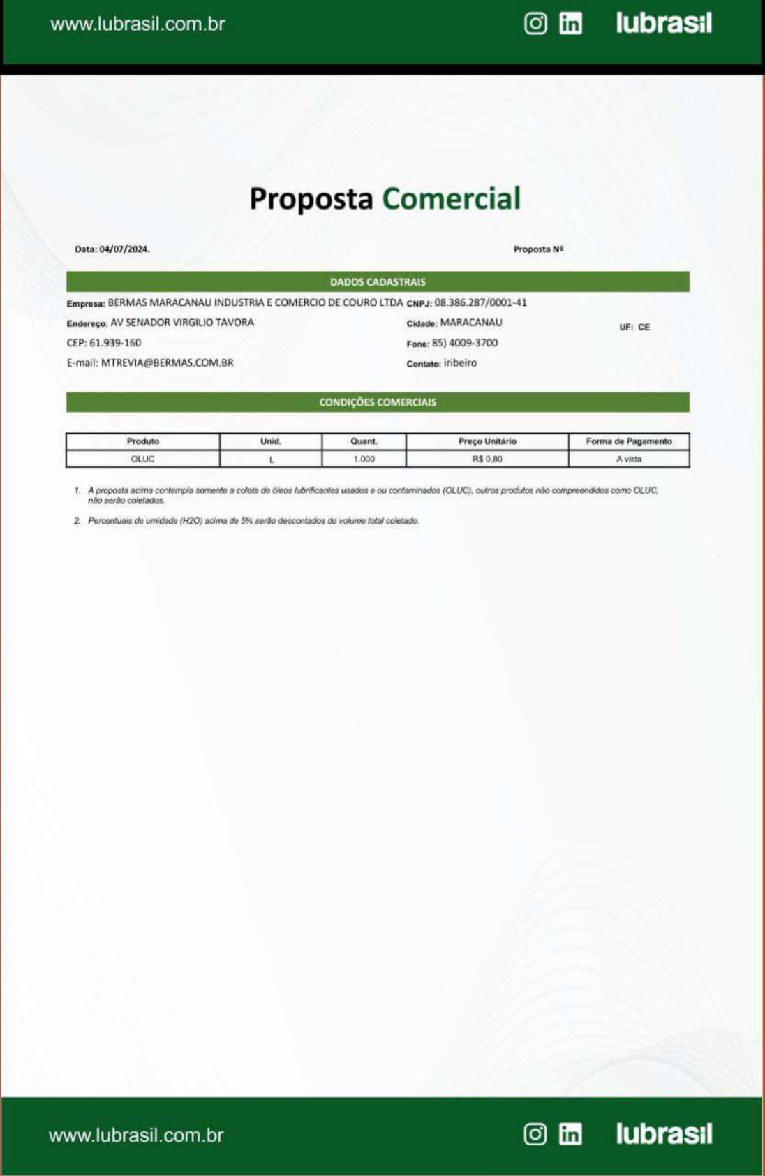 <p>www.lubrasil.com.br in lubrasil Proposta Comercial Data: 04/07/2024. Proposta N° DADOS CADASTRAIS Empresa: BERMAS MARACANAU INDUSTRIA E COMERCIO DE COURO LTDA CNPJ: 08.386.287/0001-41 Endereço: AV SENADOR VIRGILIO TAVORA Cidade: MARACANAU UF: CE CEP: 61.939-160 Fone: E-mail: Contato: iribeiro CONDIÇÕES COMERCIAIS Produto Quant Preço Unitário Forma de Pagamento OLUC 1.000 R$ 0.80 A vista A proposta a de lubrificantes usados ou contaminados (OLUC). outros produtos não compreendidos como não serão 2 Percentuais de umidade (H2O) acima de 5% serão descontados do volume total www.lubrasil.com.br in lubrasil</p>