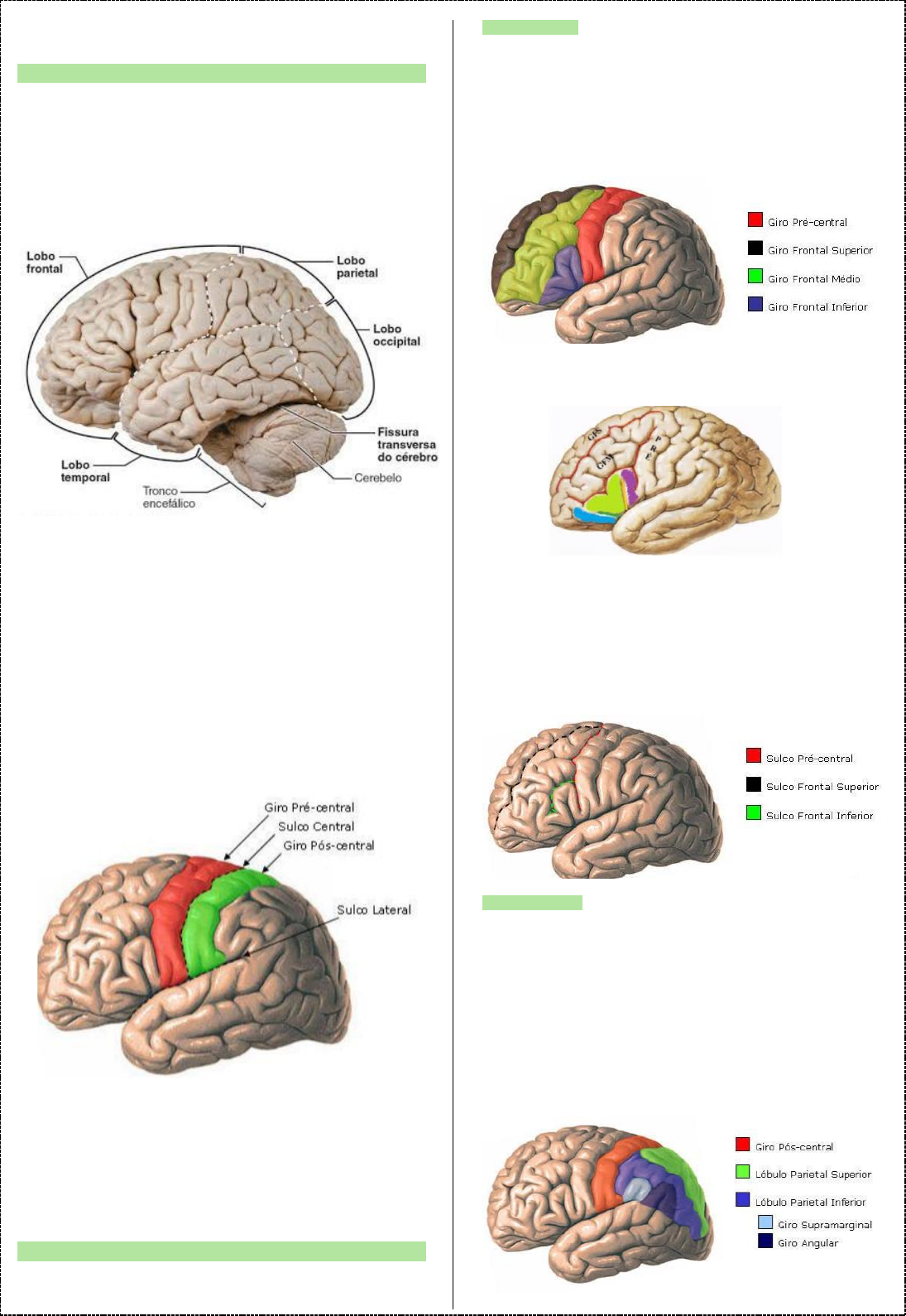 <p>Neuroanatomia – telencéfalo</p><p>conceitos iniciais</p><p>- Origem embriológica do prosencéfalo</p><p>- O telencéfalo é a área dos hemisférios, composta por giros e</p><p>sulcos. As faces do córtex cerebral são súpero-lateral, inferior</p><p>e medial</p><p>- É dividido em lobo temporal, parietal, occipital, insular e</p><p>frontal, cada um desses com suas respectivas funções e</p><p>estruturas</p><p>- Sulcos são responsáveis por delimitar os giros, cerca de 2/3</p><p>da área ocupada pelo córtex estão abrigadas nestes sulcos</p><p>- Sulco Central ou de Rolando: é um sulco profundo, delimitado</p><p>pelo giro pré-central e giro pós-central. Tem início na face</p><p>medial do hemisfério cerebral. As áreas da fala são opercular e</p><p>triangular. O córtex motor primário está no firo pré-central,</p><p>já o córtex somatossensorial no giro pós-central</p><p>- Sulco lateral ou fissura Silviana: é vista lateralmente na área</p><p>cortical, possui ramo anterior, posterior e ascendente. Os</p><p>ramos anterior e ascendente são mais curtos, penetram o</p><p>lobo anterior, já, o ramo posterior é mais longo e vai até o</p><p>lobo parietal</p><p>- Fissura inter-hemisférica ou longitudinal: divide os lados do</p><p>córtex em direito e esquerdo. O lado cortical direito comanda</p><p>o esquerdo do corpo, já, o esquerdo do córtex comanda o</p><p>direito do corpo. Isso ocorre devido ao cruzamento de fibras</p><p>no bulbo</p><p>- Corpo caloso: fica dentro da fissura hemisférica e comunica</p><p>os dois lados</p><p>face supero-lateral</p><p>- Estruturas do lobo frontal, lobo parietal e temporal</p><p>- Lobo Frontal: dentre suas principais funções, destaca-se: 1)</p><p>Motricidade</p><p>2) Fala expressiva e personalidade</p><p>3) Impulso</p><p>- Giros do lobo frontal: giro pré-central, giro frontal superior,</p><p>giro frontal medial e giro frontal inferior</p><p>- O giro frontal inferior é ainda dividido em áreas opercular e</p><p>triangular (áreas da fala de Broca – em verde e roxo) e orbital</p><p>- Sulcos do lobo frontal: I) Sulco pré-central, delimita</p><p>anteriormente o sulco central</p><p>II) Sulco frontal superior delimita o giro frontal superior do</p><p>giro frontal médio</p><p>III) Sulco frontal inferior delimita o giro frontal médio do giro</p><p>frontal inferior</p><p>- Lobo Parietal: dentre suas principais funções, destaca-se 1)</p><p>Lobo de aferência</p><p>2) Integração sensitiva</p><p>3) Fala receptiva</p><p>- Giros do lobo parietal: giro pós-central, lóbulo parietal</p><p>superior, lóbulo inferior (subdividido em: giro angular e</p><p>supramarginal)</p><p>- Sulcos do lobo parietal: sulco intraparietal (entre lóbulos) e</p><p>sulco pós-central</p><p>- A fissura intraparietal divide o lóbulo em inferior e superior</p><p>- Lobo Temporal: suas funções consistem em memória e</p><p>audição</p><p>- Giros do lobo temporal: giro temporal superior, giro temporal</p><p>inferior e giro temporal médio</p><p>- Sulcos do lobo temporal: sulco temporal superior e sulco</p><p>temporal inferior</p><p>face medial</p><p>- Corpo caloso: composto por fibras mielínicas, esta estrutura</p><p>tem função de conectar os hemisférios, de forma que atuem</p><p>em harmonia. O aumento de sua espessura na infância está</p><p>relacionada à inteligência e habilidades. Apresenta:</p><p>I) Rostro</p><p>II) Joelho</p><p>III) Tronco</p><p>IV) Esplênio</p><p>- Joelho do corpo caloso: conecta os giros pré-centrais</p><p>- Parte anterior do corpo caloso: conecta o córtex motor</p><p>primário do córtex motor suplementar</p><p>- Parte média do corpo caloso: conecta o córtex motor as</p><p>áreas sensitivas somáticas primárias e secundárias</p><p>- Parte posterior do corpo caloso: conecta os córtex parietais</p><p>- Esplênio do corpo caloso: conecta os córtex temporais e</p><p>occipitais</p><p>- Comissura anterior: é uma comissura inter-hemisférica,</p><p>ligada ao corpo caloso. Ela une algumas fibras olfatórias ao</p><p>lobo temporal</p><p>- Fórnix: é um feixe que faz parte do diencéfalo, composto por</p><p>duas partes simétricas laterais. Apresenta corpo, pernas e</p><p>colunas e comissura. O Fórnix, corpo mamilar, hipocampo</p><p>formam o circuito da memória (de Papezi), sua atrofia indica</p><p>Alzheimer</p><p>- Lobos Frontal e Parietal: sulco marginal, sulco paracentral,</p><p>sulco subparietal, sulco do corpo caloso, sulco do giro</p><p>cingulado</p><p>- Giro frontal superior, giro cingulado e lóbulo paracentral</p><p>face inferior</p><p>- Lobo Occipital e Temporal: giro parahipocampal, istmo</p><p>cíngulo, úncus, giro temporal inferior, giro occipito-temporal</p><p>medial, giro occipito-temporal lateral</p><p>- Sulcos: sulco rinal, sulco occipito-temporal, sulco colateral,</p><p>sulco do hipocampo, sulco calcarino</p><p>- Lobo Frontal (vista inferior): giros orbitários, sulcos</p><p>orbitários, giro reto e sulco olfatório</p><p>classificação do córtex: áreas de projeção e áreas de associação</p><p>- Classificação em áreas de projeção ou áreas de associação</p><p>- Áreas de Projeção (primárias): são motoras ou sensitivas</p><p>- Áreas aferentes são formadas por fibras talâmicas e</p><p>extratalâmicas</p><p>- Áreas eferentes recebem fibras corticoespinhais,</p><p>corticotalâmicas, corticoestriadas, corticopontinas, entre</p><p>outras</p><p>- Áreas de Associação (secundárias e terciárias : podem ser</p><p>primárias, secundárias ou terciárias e estão ligadas aos</p><p>processamentos psíquicos mais elaborados e complexos,</p><p>como: gustação, visão, audição, sensação somatossensorial,</p><p>emoções, memória, aprendizado</p><p>1) Áreas de Associação Primária: giro temporal transverso</p><p>anterior, lábios do sulco calcarino, córtex auditivo primário,</p><p>giro pós-central (córtex sensitivo primário)</p><p>2) Áreas de Associação Secundária: não estão inteir