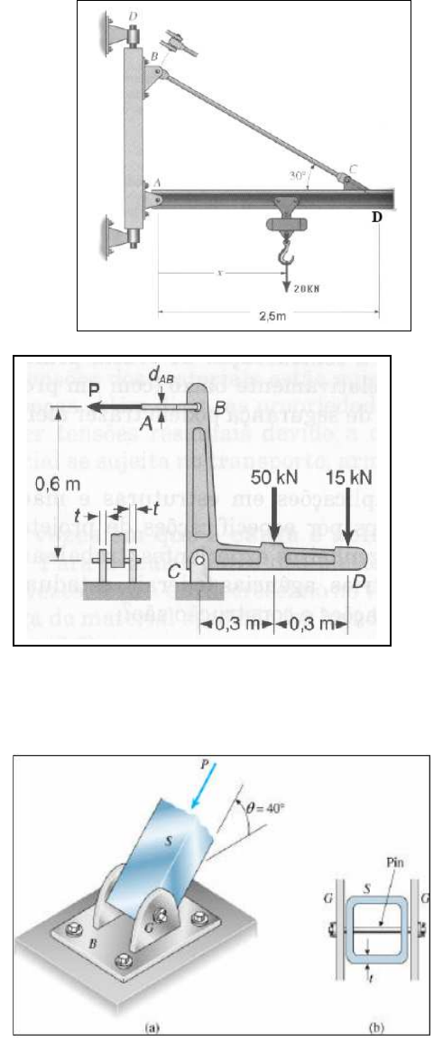 <p>1</p><p>EXERCÍCIO DE RESISTÊNCIA DOS MATERIAIS</p><p>1- Calcule a deformação sofrida por um corpo de 150 mm de comprimento, que após um ensaio de</p><p>tração passou a apresentar 153 mm de comprimento. Expresse a resposta de</p><p>forma percentual.</p><p>2. A estrutura da figura é formada por uma haste BC e</p><p>uma viga AD, rotulada em A, suportando uma talha</p><p>que pode mover-se ao longo da mesa inferior da</p><p>viga, percorrendo o espaço de 0,2m= x =2,5m. A</p><p>talha é projetada para suportar uma carga máxima de</p><p>20KN. A haste BC está devidamente reforçada nos</p><p>pontos de ligação com os pinos B e C, e é feita de</p><p>aço com 25mm de diâmetro e com as seguintes</p><p>características mecânicas: E=200GPa e σY=250MPa .</p><p>Pede-se, quando a carga se encontrar no seu ponto crítico</p><p>em relação à haste:</p><p>a) A tensão normal média na haste BC;</p><p>b) A tensão de cisalhamento no pino B, de 15mm</p><p>de diâmetro;</p><p>3. O sistema da figura é composto</p><p>de uma alavanca rígida BCD, onde são</p><p>aplicadas duas forças, conforme indicado</p><p>na figura ao lado. Pede-se:</p><p>a) Sabendo-se que a barra de controle AB</p><p>é feita de aço com tensão última de 600MPa,</p><p>determinar o diâmetro da barra para que o</p><p>coeficiente de segurança seja de 3,0.</p><p>b) O pino no ponto C é feito de aço com</p><p>tensão última a cisalhamento de</p><p>350MPa. Determinar o diâmetro do pino</p><p>C, utilizando um coeficiente de</p><p>segurança de 3,5.</p><p>c) Determinar a espessura necessária das chapas de apoio em C, sabendo-se que a tensão admissível</p><p>para esmagamento do aço utilizado é de 250MPa.</p><p>4) Um apoio de aço S servindo como base</p><p>para um guindaste de barco transmite uma</p><p>força P=60KN para o deck de um píer,</p><p>conforme figura ao lado. O apoio tem seção</p><p>transversal quadrada e vazada com espessura</p><p>t=12mm. Um pino, com diâmetro dpi=18mm</p><p>fixa o suporte ao apoio GG, com espessura</p><p>tG=15mm, que por sua vez é soldado à placa</p><p>de base B, com espessura tB=8mm. A placa</p><p>B é fixa ao deck através de quatro</p><p>parafusos de diâmetro dpa=10mm.</p><p>Pede-se:</p><p>a) a tensão de cisalhamento no pino;</p><p>b) a tensão de esmagamento entre o pino e o suporte GG;</p><p>c) a tensão de cisalhamento nos parafusos de ancoragem (despreze o atrito entre a placa de base e o</p><p>deck).</p><p>2</p><p>5) Duas barras cilíndricas AC e CD são</p><p>soldadas em C e estão sujeitas ao</p><p>carregamento mostrado. Sendo a tensão última</p><p>do material igual a 400MPa, pede-se:</p><p>a) a tensão normal média das porções AB, BC</p><p>e CD;</p><p>b) o coeficiente de segurança global para o</p><p>conjunto.</p><p>6) Cada uma das quatro hastes de ligação</p><p>verticais, conectadas às duas barras horizontais,</p><p>tem uma seção transversal retangular uniforme</p><p>de 10x40mm e são feitas de aço com uma tensão</p><p>última de 400MPa, enquanto cada um dos pinos</p><p>C e F é feito de aço, com 14mm de diâmetro, e</p><p>tensão última de cisalhamento de 150MPa.</p><p>Sendo a carga aplicada em G de 24KN, pede-se</p><p>a) a tensão máxima na haste CF;</p><p>b) a tensão de cisalhamento média nos</p><p>pinos C e F;</p><p>c) o coeficiente de segurança para haste</p><p>CF, para os pinos C e F e o coeficiente de</p><p>segurança global para este conjunto de</p><p>hastes/pinos.</p><p>6 5</p><p>3</p><p>7) A força P=15KN é aplicada no ponto C da</p><p>alavanca da figura. Pede-se:</p><p>a) Determinar o diâmetro necessário para o cabo BD,</p><p>com um coeficiente de segurança igual a 4,0,</p><p>sabendo-se que ele é feito de aço, com tensão</p><p>última de 300MPa.</p><p>b) Determinar o diâmetro do pino do apoio A, com</p><p>um coeficiente de segurança de 3,0, se ele é feito</p><p>de aço, com tensão última ao cisalhamento de</p><p>150MPa.</p><p>c) Determinar a espessura t necessária para as chapas</p><p>de apoio em A, para uma tensão admissível ao</p><p>esmagamento do material utilizado de 60MPa.</p><p>15) As barras AB e BC têm diâmetros de 25mm e de 18mm respectivamente. Se uma força P = 6kN é aplicada</p><p>ao anel em B, determinar a tensão normal em cada uma das barras quando θ for igual a 60º. (Resposta: σAB =</p><p>21,2 MPa e σBC = 23,6 MPa)</p><p>16) Duas barras de alumínio AB e AC têm, respectivamente, diâmetros iguais a 10mm e 8mm.</p><p>Determinar a maior força vertical P que pode ser aplicada ao conjunto como mostrado na figura. A</p><p>tensão normal admissível para o alumínio vale 150 MPa. (Resposta: 7,54 kN)</p><p>17) Dois cabos de aço AB e AC são usados para suportar a força P indicada na figura. Se ambos</p><p>cabos têm tensão admissível à tração igual a 200 MPa, determinar o diâmetro mínimo necessário para cada um</p><p>desses cabos quando P = 5 kN. (Resposta: dAB = 5,26mm e dAC = 5,48mm)</p><p>18) Uma lâmpada com massa igual a 80 kg é suportada por duas barras AB e BC como mostrado na figura. Se</p><p>barra AB tem diâmetro de 10mm e a barra BC de 8 mm, determinar que barra está sujeita a maior tensão</p><p>normal. Considerar g = 9,81 m/s2. (Resposta: Barra AB - σAB = 8,05 MPa)</p><p>15 16</p><p>17 18</p><p>4</p><p>1) Em uma barra de alumínio de 12mm de diâmetro são feitas duas marcas distanciadas de 250mm.</p><p>Determinar o módulo de elasticidade longitudinal do alumínio usado, se para uma força de 6000N a</p><p>distância entre estas duas marcas é de 250,18mm. (Resposta: E = 73,7 GPa)</p><p>2) Uma força de tração de 9kN vai ser aplicada a um fio de aço de 50m de comprimento. Determine</p><p>o menor diâmetro a ser adotado para o fio, se a tensão normal não pode exceder a 150 MPa e a</p><p>deformação do fio deve ser no máximo de 25mm. Considerar E= 200 GPa. (Resposta: d = 10,70mm)</p><p>3) Duas barras de 36mm de diâmetro, ABC de aço e CD de bronze, são ligadas em C e forman