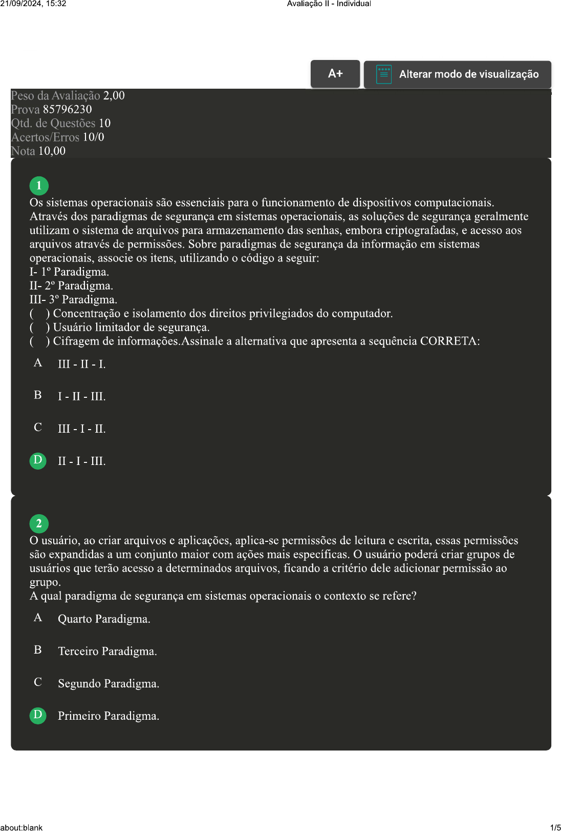 <p>21/09/2024, 15:32 Avaliação Individual A+ Alterar modo de visualização Peso da Avaliação 2,00 Prova 85796230 de Questões 10 Acertos/Erros 10/0 Nota 10,00 1 Os sistemas operacionais são essenciais para funcionamento de dispositivos computacionais. Através dos paradigmas de segurança em sistemas operacionais, as soluções de segurança geralmente utilizam sistema de arquivos para armazenamento das senhas, embora criptografadas, e acesso aos arquivos através de permissões. Sobre paradigmas de segurança da informação em sistemas operacionais, associe os utilizando código a seguir: I- 1° Paradigma. II- 2° Paradigma. III- 3° Paradigma. ( ) Concentração e isolamento dos direitos privilegiados do computador. ( ) Usuário limitador de segurança. ( ) Cifragem de informações. Assinale a alternativa que apresenta a sequência CORRETA: A B C III - I - II. D 2 O usuário, ao criar arquivos e aplicações, aplica-se permissões de leitura e escrita, essas permissões são expandidas a um conjunto maior com ações mais específicas. O usuário poderá criar grupos de usuários que terão acesso a determinados arquivos, ficando a critério dele adicionar permissão ao grupo. A qual paradigma de segurança em sistemas operacionais contexto se refere? A Quarto Paradigma. B Terceiro Paradigma. C Segundo Paradigma. D Primeiro Paradigma. about:blank 1/5</p><p>21/09/2024, 15:32 Avaliação Individual 3 Softwares maliciosos são responsáveis por perdas financeiras que ultrapassam centenas de milhões de dólares anuais. Por exemplo, em 2006, os prejuízos ocasionados por esse tipo de software foram de aproximadamente US$ 245 milhões, somente entre provedores de acesso norte. Sobre softwares maliciosos, classifique V para as sentenças verdadeiras e F para as falsas: ( ) Os trojan horses não são exatamente um programa e se não fosse uma técnica maliciosa poderíamos dizer se tratar de um conjunto de boas práticas, mas são um conjunto de práticas maliciosas que garantem que a presença de um invasor não seja notada em um dispositivo Os rootkit, ou apenas roots, são programas de computadores denominados cavalos de Tróia, que seguem a ideia da história real. São programas de computador que realizam a função para a qual foram designados e mais alguma função maliciosa. ( Os worms têm suas ações em forma de malware. No entanto, que chama atenção não é sua ação, e sim sua maneira de propagação. ( Bot é um programa que dispõe de mecanismos de comunicação com invasor, permitindo que ele seja controlado remotamente. Assinale a alternativa que apresenta a sequência CORRETA: A V-F-V-V B C D F-F-V-V 4 Firewall é uma solução de segurança baseada em hardware ou software (mais comum) que, a partir de um conjunto de regras ou instruções, analisa tráfego de rede para determinar quais operações de transmissão ou recepção de dados podem ser executadas. "Parede de fogo", a tradução literal do nome, já deixa claro que firewall se enquadra em uma espécie de barreira de defesa. Sobre conceito e a utilização de um firewall, assinale a alternativa INCORRETA: FONTE: https://www.infowester.com/firewall.php Acesso em: 21 jun. 2022. A Os firewalls são programas de software ou dispositivos de hardware que filtram e examinam as informações provenientes da sua conexão com a Internet. B A utilização de firewalls é essencial para a eficiência das chaves utilizadas na criptografia de mensagens. C O firewall pode atuar sobre portas, protocolos ou aplicações específicas, permitindo um ajuste fino do que pode ou não trafegar entre as redes. D Um firewall trabalha com pacotes de segurança; ele pode ser configurado para bloquear todo e qualquer tráfego no computador ou na restringindo acesso. 5 Os motivos que levam os atacantes a desferirem ataques são diversos, número de ataques torna-se cada vez mais frequentes. Atualmente, os ataques são muito perigosos e difíceis de detectar. O único jeito de prevenir esses ataques é implementar medidas de segurança, estabelecendo hierarquia aos riscos de informação e identificar metas de segurança aceitáveis, assim como mecanismos para atingi- las. Para proteção existem firewalls e softwares antivírus. No entanto, nem com toda proteção os ataques são evitados. Sobre exposto, classifique V para as sentenças verdadeiras e F para as falsas: about:blank 2/5</p><p>21/09/2024, 15:32 Avaliação Individual ( ) A palavra crackers seria usada para designar hackers com más intenções e que efetivamente utilizam seus conhecimentos para provocar danos em sistemas e se apropriar de forma ilícita de informações. ( ) A palavra hackers seria usada para designar crackers com más intenções e que efetivamente utilizam seus conhecimentos para provocar danos em sistemas e se apropriar de forma ilícita de informações. ( ) Uma funções maliciosas que podem ser executadas por um cavalo de Troia é poder se replicar, infectar outros arquivos ou propagar cópias de si mesmo automaticamente. Assinale a alternativa que apresenta a sequência CORRETA: A B C D 6 Tendo em vista que os sistemas operacionais são conjuntos de instruções com intuito de controlar hardware, essas instruções podem conter falhas que culminem para a execução de comandos não desejados pelo usuário, sejam intencionais ou Considerando as funções de um sistema operacional, associe os itens, utilizando código a seguir: I- Gestão da execução dos aplicativos. II- Gestão dos direitos. III- Gestão dos IV- Gestão das informações. ( ) O sistema operacional fornece diversos indicadores para diagnosticar bom funcionamento da máquina. ( ) O sistema operacional gerencia a leitura e a redação no sistema de arquivos e os direitos de acesso aos arquivos pelos usuários e aplicativos. ( ) O sistema operacional é responsável pela segurança ligada à execução dos programas, garantindo que os recursos sejam utilizados apenas pelos programas 