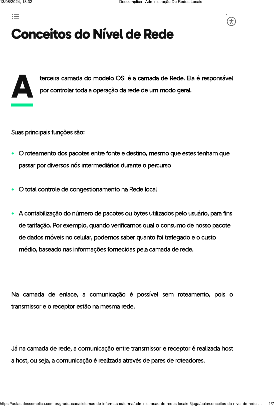 <p>13/08/2024. 18:32 Descomplica Administração De Redes Locais Conceitos do Nível de Rede A terceira camada do modelo OSI é a camada de Rede. Ela é responsável por controlar toda a operação da rede de um modo geral. Suas principais funções são: roteamento dos pacotes entre fonte e destino, mesmo que estes tenham que passar por diversos nós intermediários durante percurso total controle de congestionamento na Rede local A contabilização do número de pacotes ou bytes utilizados pelo usuário, para fins de tarifação. Por exemplo, quando verificamos qual consumo de nosso pacote de dados móveis no celular, podemos saber quanto foi trafegado e custo médio, baseado nas informações fornecidas pela camada de rede. Na camada de enlace, a comunicação é possível sem roteamento, pois transmissor e o receptor estão na mesma rede. Já na camada de rede, a comunicação entre transmissor e receptor é realizada host a host, ou seja, a comunicação é realizada através de pares de roteadores. 1/7</p><p>13/08/2024, 18:32 Descomplica Administração De Redes Locais principal aspecto que deve ser observado nessa camada é a execução do roteamento dos pacotes entre fonte e destino, principalmente quando exist caminhos diferentes para conectar entre dois nós na rede. Em redes de longa distância é comum que a mensagem chegue do nó fonte ao nó destino passando, por diversos nós intermediários no meio do caminho e esta é a tarefa do nível de rede, escolher qual o melhor caminho para essa mensagem seguir. A escolha da melhor rota pode ser baseada em tabelas estáticas, que são configuradas na criação da rede e são raramente modificadas. A rota pode também ser determinada no início de cada conversação, ou ser altamente dinâmica, assim sendo chamadas de rotas dinâmicas, e estas sendo determinadas a cada novo pacote, a fim de refletir exatamente a carga da rede naquele instante. controle de tais congestionamentos também é tarefa da camada de rede. A camada de Rede exerce funções essenciais para o bom funcionamento das comunicações: Comutação: mover pacotes da entrada do roteador para a saída apropriada do roteador. 2/7</p><p>13/08/2024, 18:32 Descomplica Administração De Redes Locais Roteamento: determinar a rota a ser seguida pelos pacotes desde a origem até o destino. Isso tudo fazendo uso de algoritmos dedicados ao roteamento Então se fizermos uma analogia: A função de Roteamento: é similar ao processo de planejar uma viagem de carro, definimos a origem, quais são os pontos que serão realizadas paradas, abastecimento, etc e definimos destino final. Já a Comutação: é processo de seguir de um ponto a outro direto "sem escalas". Como uma viagem de avião. A camada de rede pode oferecer serviços orientados à conexão ou tudo depende da metodologia de rede empregada: Redes de datagramas provêm serviços sem-conexão; Redes de circuitos virtuais provêm serviços de conexão. protocolo IP ou Internet Protocol é um protocolo da camada de rede responsável pelo encaminhamento dos dados em uma rede. Presta todos os serviços de rede como interconexão, roteamento, endereçamento, fragmentação e encapsulamento para as camadas superiores. 3/7</p><p>13/08/2024, 18:32 Descomplica Administração De Redes Locais A figura 1 demonstra um roteador entre dois elementos, Host A e B, ao qual irá realizar roteamento de dados entre os dois, em cor azul destaca-se a função camada de rede (inter-rede) entre um nó e outro. Figura 1 - Comunicação entre duas redes. Figura 1 - Comunicação entre duas redes. HOST A HOST B Aplicação Aplicação Roteador Transporte Transporte Inter-Rede Inter-Rede Inter-Rede Interface de Rede Interface de Rede Interface de Rede Rede A Rede B Sendo protocolo Base da arquitetura Internet, é utilizado por todos os serviços de aplicação atuais. TCP/IP sempre foi considerado um modelo bastante pesado quando comparado com modelo UDP/IP, uma vez que TCP/IP tem muito de seu foco voltado para a confiabilidade ao invés de só velocidade, diferente do UDP/IP, que é mais leve e veloz, mas não garante que a informação chegará ao respectivo destino.</p><p>13/08/2024, 18:32 Descomplica Administração De Redes Locais Para que seja possível termos IPs para uso em redes locais e IPs para utilização na internet, contamos com um esquema de distribuição que, basicamente, divide endereços em três classes principais e mais duas complementares. São elas: Classe A: 0.0.0.0 até 127.255.255.255 - permite até 128 redes Classe B: 128.0.0.0 até 191.255.255.255 - permite até 16.384 redes Classe C: 192.0.0.0 até 223.255.255.255 - permite até 2.097.152 redes Classe D: 224.0.0.0 até 239.255.255.255 - multicast Classe E: 240.0.0.0 até 255.255.255.255 multicast reservado As classes de endereçamento foram empregadas no início da Internet, no entanto com a escassez de endereços dada a demanda da rede mundial de computadores tal cenário mudou. Classless Inter-Domain Routing (CIDR) ou roteamento entre domínios foi adotado em em 1993, como uma forma de reduzir tráfego e simplificar o roteamento (RFC 1519), mas possibilitou uso do modelo via máscara de subrede para divisão de rede sem a necessidade de obedecer as classes abordadas a no início deste texto. Usamos uma notação que indica quantos bits do endereço IP formam bloco CIDR. Ex: 10.0.0.0/24, ou seja, /24 significa que há 24 bits em "1" e 8 Bits em "0", neste caso a rede terá apenas 256 endereços, pois a máscara é instrumento que ratifica a quantidade de hosts da rede, de acordo com a ilustração abaixo: 5/7</p><p>13/08/2024, 18:32 Descomplica I Administração De Redes Locais Exemplo Sem CIDR CIDR Endereço em Decimal 10.0.0.0 10.0.0.0 Endereço em Binário 00001010.00000000. 00000000. 00001010.00000000. 00000000. 00000000. 00000000. Base para Endereços /8 /24 Mascara em Binário 11111111.00000000. 11111111. 11111111. 00000000. 00000000. 11111111.00000000. Endereç