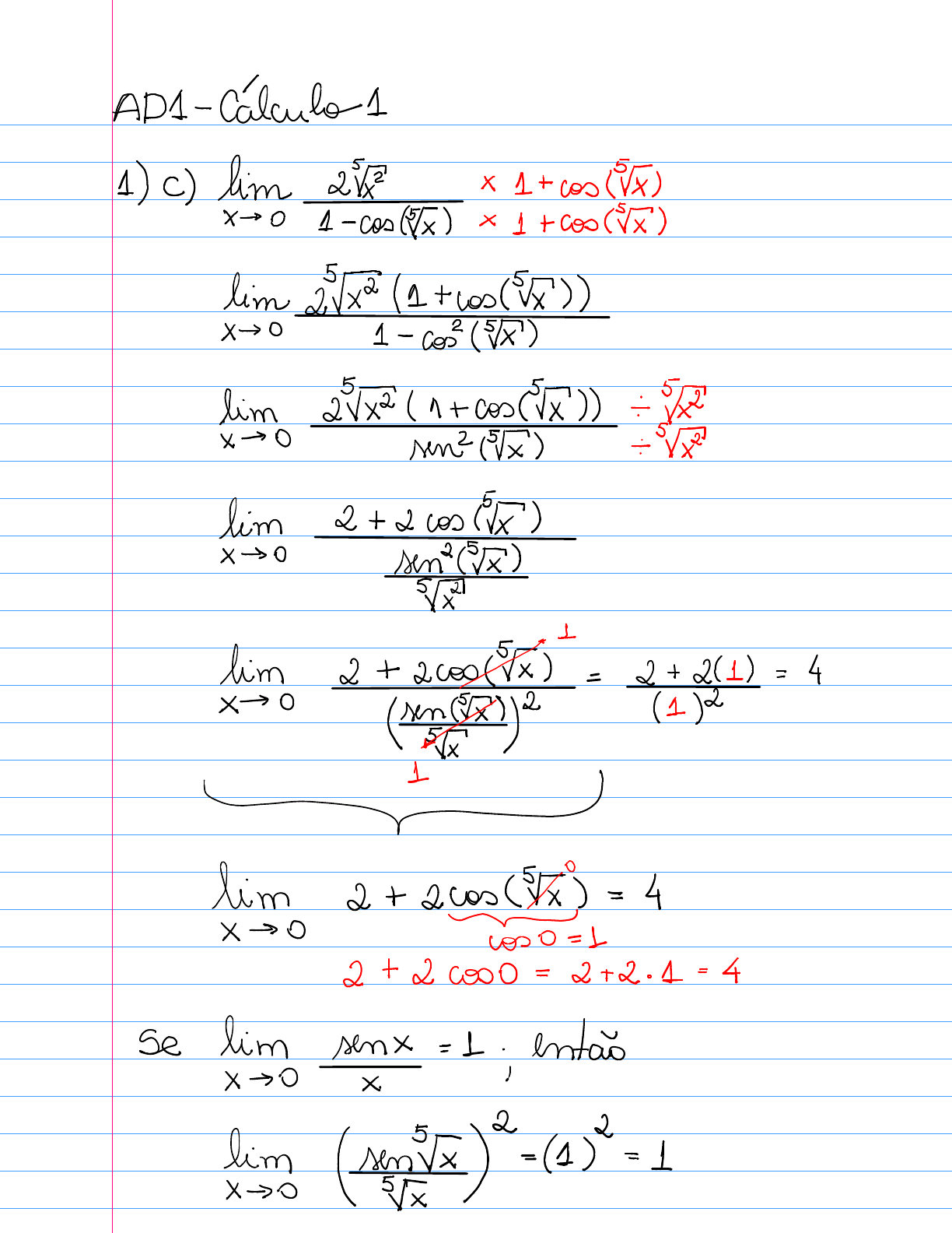 <p>AD1 - 1) c) 1-cos lim 5 lim 2Vx2 X 0 X him 2 + 5 = = 4 X O 2 (1)2 1 lim 2+ = 4 = senx = 0 X 2 2 = (1) = 1</p>