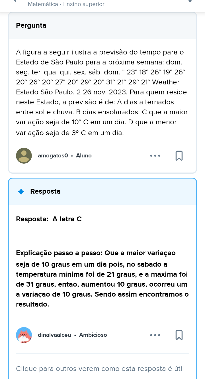 <p>Matemática Ensino superior Pergunta A figura a seguir ilustra a previsão do tempo para Estado de São Paulo para a próxima semana: dom. seg. ter. qua. qui. sex. sáb. dom. " 18° 26° 19° 26° 20° 26° 20° 27° 20° 29° 20° 31° 21° 29° 21° Weather. Estado São Paulo. 2 26 nov. 2023. Para quem reside neste Estado, a previsão é de: A dias alternados entre sol e chuva. B dias ensolarados. que a maior variação seja de 10° C em um dia. D que a menor variação seja de 3° C em um dia. e amogatos0 Aluno Resposta Resposta: A letra C Explicação passo a passo: Que a maior variaçao seja de 10 graus em um dia pois, no sabado a temperatura minima foi de 21 graus, e a maxima foi de 31 graus, entao, aumentou 10 graus, ocorreu um a variaçao de 10 graus. Sendo assim encontramos o resultado. dinalvaalceu Ambicioso Clique para outros verem como esta resposta é útil</p>