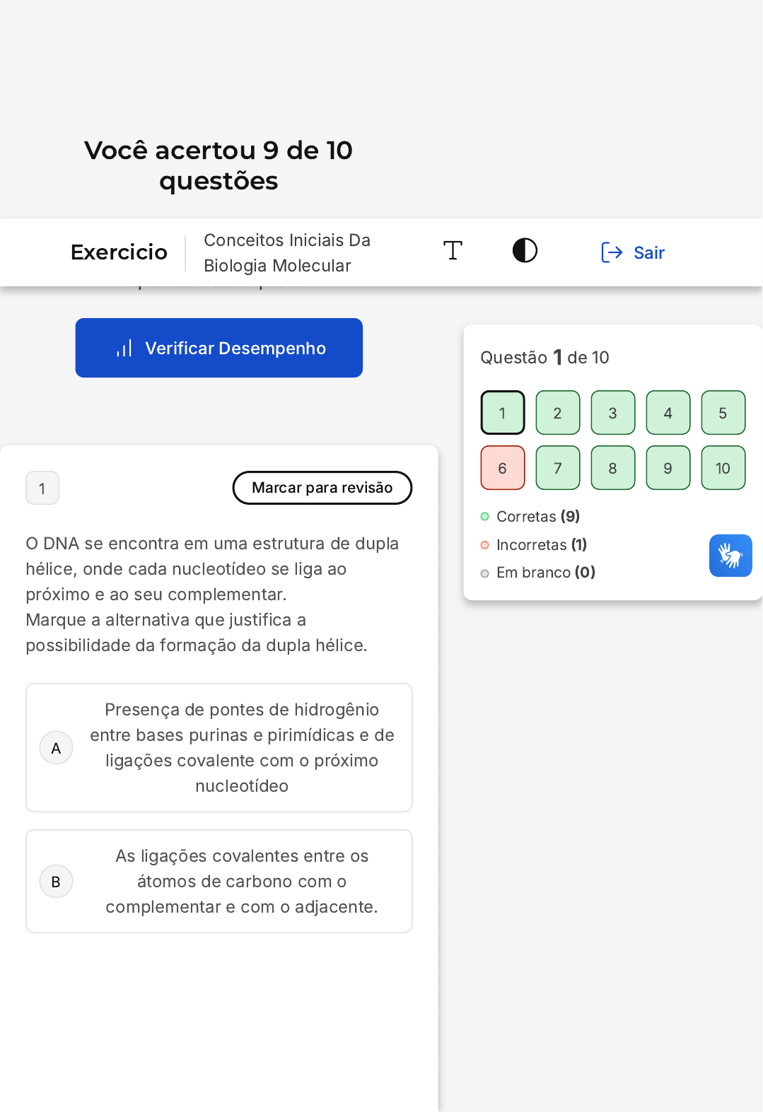 <p>Você acertou 9 de 10</p><p>questões</p><p>Verifique o seu desempenho e continue</p><p>treinando! Você pode refazer o exercício</p><p>quantas vezes quiser.</p><p>Verificar Desempenho</p><p>A</p><p>B</p><p>1 Marcar para revisão</p><p>O DNA se encontra em uma estrutura de dupla</p><p>hélice, onde cada nucleotídeo se liga ao</p><p>próximo e ao seu complementar.</p><p>Marque a alternativa que justifica a</p><p>possibilidade da formação da dupla hélice.</p><p>Presença de pontes de hidrogênio</p><p>entre bases purinas e pirimídicas e de</p><p>ligações covalente com o próximo</p><p>nucleotídeo</p><p>As ligações covalentes entre os</p><p>átomos de carbono com o</p><p>complementar e com o adjacente.</p><p>Questão 1 de 10</p><p>Corretas �9�</p><p>Incorretas �1�</p><p>Em branco �0�</p><p>1 2 3 4 5</p><p>6 7 8 9 10</p><p>Exercicio</p><p>Conceitos Iniciais Da</p><p>Biologia Molecular</p><p>Sair</p><p>C</p><p>D</p><p>E</p><p>A ligação fosfodiéster entre o fosfato</p><p>de um nucleotídeo e a pentose do</p><p>nucleotídeo seguinte e ligações de</p><p>hidrogênio com o nucleotídeo</p><p>complementar</p><p>A ligação coordenada em direção aos</p><p>átomos do mesmo elemento mais</p><p>eletronegativo na cadeia e ao seu</p><p>complementar</p><p>A ligação entre as riboses que</p><p>acontece devido as fitas não serem</p><p>complementares</p><p>Resposta correta</p><p>Parabéns, você selecionou a</p><p>alternativa correta. Confira o</p><p>gabarito comentado!</p><p>Gabarito Comentado</p><p>Em um nucleotídeo o grupo fosfato ligado</p><p>ao carbono 5 da pentose realiza uma</p><p>ligação fosfodiéster com o oxigênio do</p><p>carbono 3 da pentose do nucleotídeo</p><p>seguinte. A ligação que une dois</p><p>nucleotídeos é a fosfodiéster que ocorre</p><p>entre o fósforo do grupo fosfato ligado ao</p><p>carbono 5 de uma pentose com a hidroxila</p><p>do carbono 3 da pentose do outro</p><p>nucleotídeo. A união da dupla fita é feita</p><p>por nucleotídeos complementares ligados</p><p>por interações de hidrogênio.</p><p>A</p><p>B</p><p>C</p><p>D</p><p>E</p><p>2 Marcar para revisão</p><p>�UFU�MG � 2018 - adaptada) A transcrição e a</p><p>tradução são os processos que levam a</p><p>informação genética até a uma unidade</p><p>funcional, a proteína.</p><p>Em relação ao processo de síntese proteica em</p><p>células eucariotas, assinale a alternativa</p><p>correta.</p><p>O RNA mensageiro é produzido no</p><p>núcleo celular e traduzido no</p><p>citoplasma</p><p>A adição do cap5¿ é um exemplo de</p><p>modificação pós-traducional</p><p>AAG é o códon de iniciação da síntese</p><p>proteica por ribossomos</p><p>A cauda poli-A é formada por um</p><p>conjunto de RNAs transportadores</p><p>O RNAt auxilia no arranjo</p><p>tridimensional da proteína</p><p>Resposta correta</p><p>Parabéns, você selecionou a</p><p>alternativa correta. Confira o</p><p>gabarito comentado!</p><p>Gabarito Comentado</p><p>Nos organismos eucariontes, que possuem</p><p>carioteca, o RNAm é produzido no núcleo</p><p>celular e traduzido pelos ribossomos no</p><p>citoplasma. A adição do cap5¿ se trata de</p><p>A</p><p>B</p><p>C</p><p>uma modificação pós-transcricional. O</p><p>códon de iniciação ou start-códon é dado</p><p>pela sequência é AUG e não AAG. A cauda</p><p>poli-A é formada por uma série de bases</p><p>adeninas com objetivo de conferir maior</p><p>resistência ao RNAm. O RNAt auxilia na</p><p>inserção de peptídeos e não na formação</p><p>do arranjo proteico final.</p><p>3 Marcar para revisão</p><p>Sabe-se que o DNA é a estrutura responsável</p><p>por armazenar nossas informações genéticas.</p><p>Dessa forma, a função principal do DNA é</p><p>transportar informações contidas nos genes.</p><p>Com relação a sua estrutura e às características</p><p>do DNA, assinale a alternativa correta.</p><p>O DNA é composto por uma dupla</p><p>hélice, com as bases nitrogenadas</p><p>purinas se ligando às pirimidinas no</p><p>centro da hélice espiralada</p><p>Ao transmitir as informações</p><p>genéticas de um indivíduo para seu</p><p>sucessor, a molécula determina as</p><p>suas características e memórias</p><p>Apesar de ser uma longa cadeia dupla,</p><p>sua estrutura fica compactada dentro</p><p>do núcleo celular, em organismos</p><p>procariontes</p><p>D</p><p>E</p><p>Apresenta em sua estrutura pentose,</p><p>fosfato e as bases nitrogenadas</p><p>Adenina �A�, Timina �T�, Citosina �C) e</p><p>Uracila �U�.</p><p>É bastante instável, por estar em fita</p><p>dupla é facilmente degradado no meio</p><p>celular</p><p>Resposta correta</p><p>Parabéns, você selecionou a</p><p>alternativa correta. Confira o</p><p>gabarito comentado!</p><p>Gabarito Comentado</p><p>A estrutura do DNA foi resolvida pela dupla</p><p>de cientistas Watson e Crick e se</p><p>comprovou correta, sendo usada até os</p><p>dias de hoje. Ele é formado por dupla</p><p>hélice espiralada, com purinas (adenina e</p><p>guanina) e pirimidinas (citosina e timina) no</p><p>centro. Em procariontes, o DNA se</p><p>encontra no citoplasma. A molécula de</p><p>DNA é bastante estável, carrega</p><p>informações genéticas, mas não é</p><p>responsável por transmitir memórias de um</p><p>indivíduo para seu sucessor.</p><p>4 Marcar para revisão</p><p>A transcrição e tradução são fundamentais para</p><p>o dogma central da biologia. A partir dos</p><p>processos de transcrição �A) e de tradução �B�,</p><p>correlacione nas frases abaixo:</p><p>A RNA polimerase é responsável por sintetizar o</p><p>pré-RNAm na ( ).</p><p>A</p><p>B</p><p>C</p><p>D</p><p>E</p><p>Durante a ( ) o RNAt que transporta o</p><p>aminoácido metionina emparelha-se com um</p><p>códon AUG, presente na molécula de RNAm.</p><p>O sítio P é sempre ocupado pelo RNAt que</p><p>carrega a cadeia polipeptídica em formação</p><p>durante a etapa de ( ).</p><p>A região 