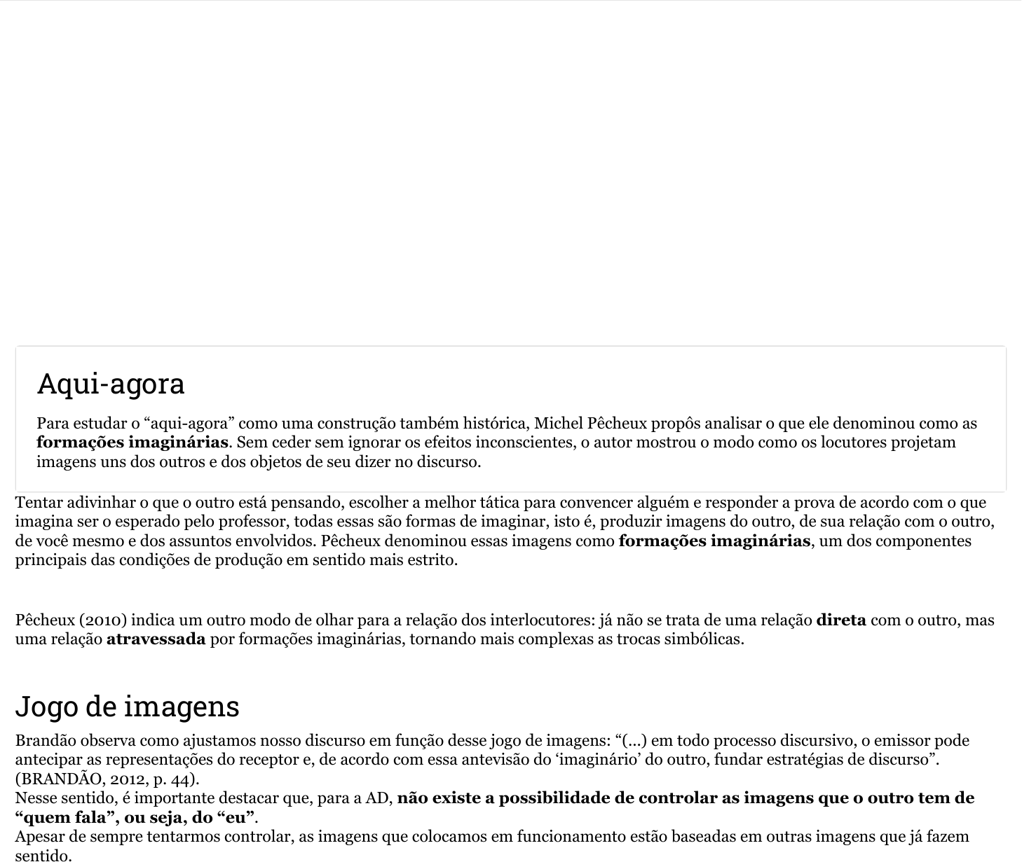 <p>Você sabia que seu material didático é interativo e multimídia?</p><p>Ele possibilita diversas formas de interação com o conteúdo, a qualquer hora e de qualquer lugar. Mas na versão impressa, alguns conteúdos</p><p>interativos são perdidos, por isso, fique atento! Sempre que possível, opte pela versão digital. Bons estudos!</p><p>Depois de conhecer um pouco mais o conceito de discurso e sua diferença com perspectivas que reafirmam as transparências da</p><p>linguagem, do sujeito e da história, você também viu como um discurso sempre está em relação com outros e com seu contexto sócio-</p><p>histórico, particularmente mediante a relação com a autoridade, o poder e os processos institucionais. Nesta webaula, você terá a</p><p>oportunidade de olhar mais de perto alguns mecanismos em que essa história se atualiza, na própria formulação ou na situação discursiva</p><p>do "aqui-agora".</p><p>Aqui-agora</p><p>Para estudar o “aqui-agora” como uma construção também histórica, Michel Pêcheux propôs analisar o que ele denominou como as</p><p>formações imaginárias. Sem ceder sem ignorar os efeitos inconscientes, o autor mostrou o modo como os locutores projetam</p><p>imagens uns dos outros e dos objetos de seu dizer no discurso.</p><p>Tentar adivinhar o que o outro está pensando, escolher a melhor tática para convencer alguém e responder a prova de acordo com o que</p><p>imagina ser o esperado pelo professor, todas essas são formas de imaginar, isto é, produzir imagens do outro, de sua relação com o outro,</p><p>de você mesmo e dos assuntos envolvidos. Pêcheux denominou essas imagens como formações imaginárias, um dos componentes</p><p>principais das condições de produção em sentido mais estrito.</p><p>Pêcheux (2010) indica um outro modo de olhar para a relação dos interlocutores: já não se trata de uma relação direta com o outro, mas</p><p>uma relação atravessada por formações imaginárias, tornando mais complexas as trocas simbólicas.</p><p>Jogo de imagens</p><p>Brandão observa como ajustamos nosso discurso em função desse jogo de imagens: “(...) em todo processo discursivo, o emissor pode</p><p>antecipar as representações do receptor e, de acordo com essa antevisão do ‘imaginário’ do outro, fundar estratégias de discurso”.</p><p>(BRANDÃO, 2012, p. 44).</p><p>Nesse sentido, é importante destacar que, para a AD, não existe a possibilidade de controlar as imagens que o outro tem de</p><p>“quem fala”, ou seja, do “eu”.</p><p>Apesar de sempre tentarmos controlar, as imagens que colocamos em funcionamento estão baseadas em outras imagens que já fazem</p><p>sentido.</p><p>Análise do Discurso</p><p>Condições de produção: formações imaginárias</p><p>Unidade 1 - Seção 3</p><p>19/09/2024, 11:36 ana_dis_u1_s3_wa</p><p>https://www.colaboraread.com.br/integracaoAlgetec/index?usuarioEmail=luiscrobleda%40gmail.com&usuarioNome=LUIS+CARLOS+ROBLEDA&disciplinaDescricao=&atividadeId=4342377&atividadeDescricao=CW… 1/2</p><p>Antecipação</p><p>A antecipação é uma das matrizes que acionam as formações imaginárias. Processo constitutivo de se colocar imaginariamente no</p><p>lugar do outro, a antecipação é o mecanismo que busca prever respostas e reações possíveis, modificando, por sua vez, a</p><p>sequencialidade de um diálogo.</p><p>Você já deve ter antecipado muito a reação de um interlocutor, porém, quando é chegado o momento da discussão efetiva, nem sempre</p><p>acontecia o previsto, certo? Isso se dá porque lidar com o outro real implica complexidades que são apagadas no imaginário. Ainda que as</p><p>formações imaginárias sejam constitutivas de toda situação de interlocução, elas são desconcertadas pela escuta real do outro, que,</p><p>possivelmente, frustra nossas expectativas.</p><p>Imaginário social</p><p>Há a predominância de algumas imagens. Chamaremos a circulação do conjunto das formações imaginárias dominantes como o</p><p>imaginário social. Utilizamos o conceito de imaginário social para delimitar as imagens, mais ou menos compartilhadas em condições</p><p>de produção específicas, do que é ser mulher, do que é ser estudante, do que é ser jornalista, do que é informação, do que é o</p><p>conhecimento, do que é trabalho, do que é estudar, do que é aprender, enfim, sobre objetos discursivos variados. O imaginário social é</p><p>um conjunto complexo de imagens que a sociedade tem sobre os objetos, os sujeitos, as práticas, em suma, sobre tudo</p><p>aquilo que é passível de alguma simbolização. Ele não é homogêneo, porque, como explica Pêcheux (2009, p. 74) “tais ‘condições</p><p>reais de existência’ são ‘distribuídas’ pelas relações de produção econômicas, com os diferentes tipos de contradições políticas e</p><p>ideológicas resultantes dessas relações”.</p><p>Pensemos, por exemplo, em uma das imagens existentes sobre o Brasil e do que é ser brasileiro: Brasil é o país do samba, do futebol, do</p><p>jeitinho, da malandragem, do açaí e de flora e fauna ricas. Algumas pessoas dirão que é isso mesmo, outras podem questionar essa</p><p>imagem estereotipada. No caso de você ter pensado em outras imagens para o “brasileiro”, a busca de alternativas é justamente uma boa</p><p>demonstração da eficácia imaginária. O questionamento ou a tentativa de definir o brasileiro é supor que se trata de um projeto viável,</p><p>verossímil, legítimo e exequível.</p><p>Fonte: iStock</p><p>Não se deixar levar pelo efeito de obviedade dos discursos administrativos e jurídicos é uma tarefa do analista de discurso, sendo</p><p>fundamental compreender a dinamicidade dos processos de identificação. O imaginário, consequentemente, é um dos constituintes de</p><p>nossa relação com o mundo, porém, pode passar por vias não oficiais de uma identificação com a nação e, sim, da identificação com