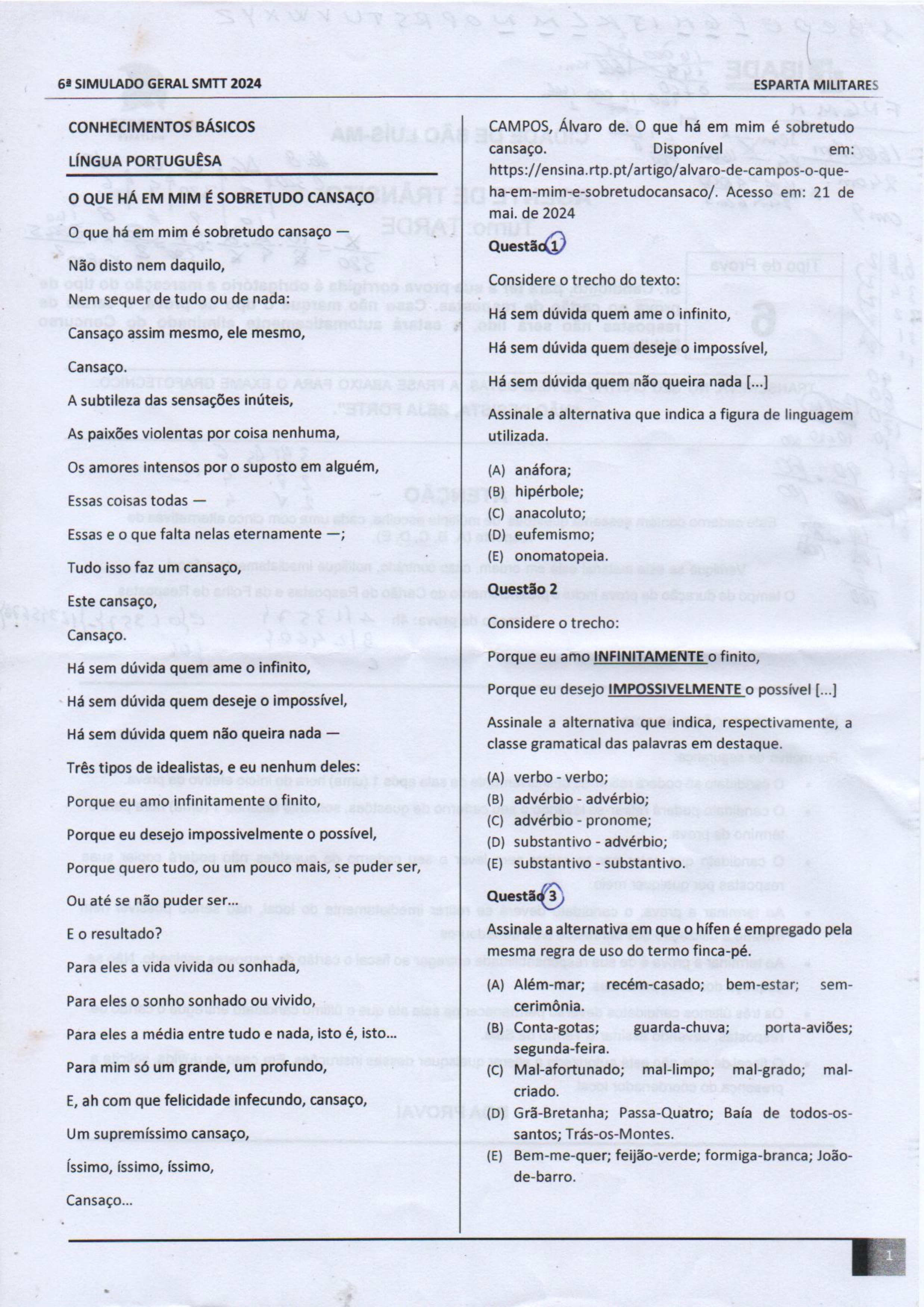 <p>SIMULADO GERAL SMTT 2024 ESPARTA MILITARES CONHECIMENTOS BÁSICOS CAMPOS, Álvaro de. o que há em mim é sobretudo cansaço. Disponível em: LÍNGUA PORTUGUÊSA o QUE HÁ EM MIM É SOBRETUDO CANSAÇO ha-em-mim-e-sobretudocansaco/ Acesso em: 21 de mai. de 2024 o que há em mim é sobretudo cansaço - Questão 1 Não disto nem daquilo, Considere o trecho do texto: Nem sequer de tudo ou de nada: Há sem dúvida quem ame o infinito, Cansaço assim mesmo, ele mesmo, Há sem dúvida quem deseje o impossível, Cansaço. Há sem dúvida quem não queira nada [...] A subtileza das sensações inúteis, Assinale a alternativa que indica a figura de linguagem As violentas por coisa nenhuma, utilizada. Os amores intensos por o suposto em alguém, (A) anáfora; (B) hipérbole; Essas coisas todas (C) anacoluto; Essas e o que falta nelas eternamente -; (D) eufemismo; (E) onomatopeia. Tudo isso faz um cansaço, Questão 2 Este cansaço, Considere o trecho: Cansaço. Porque eu amo INFINITAMENTE o finito, Há sem dúvida quem ame o infinito, Porque eu desejo IMPOSSIVELMENTE o possível [...] Há sem dúvida quem deseje o impossível, Assinale a alternativa que indica, respectivamente, a Há sem dúvida quem não queira nada classe gramatical das palavras em destaque. Três tipos de idealistas, e eu nenhum deles: (A) verbo verbo; Porque eu amo infinitamente o finito, (B) advérbio - advérbio; (C) advérbio pronome; Porque eu desejo impossivelmente o possível, (D) substantivo - advérbio; Porque quero tudo, ou um pouco mais, se puder ser, (E) substantivo substantivo. Ou até se não puder ser... Questão 3 E o resultado? Assinale a alternativa em que o hífen é empregado pela mesma regra de uso do termo finca-pé. Para eles a vida vivida ou sonhada, (A) Além-mar; recém-casado; bem-estar; sem- Para eles o sonho sonhado ou vivido, cerimônia. Para eles a média entre tudo e nada, isto é, isto... (B) Conta-gotas; guarda-chuva; segunda-feira. Para mim só um grande, um profundo, (C) Mal-afortunado; mal-limpo; mal-grado; mal- E, ah com que felicidade infecundo, cansaço, (D) Grä-Bretanha; Passa-Quatro; Baía de todos-os- Um cansaço, santos; Trás-os-Montes. (E) Bem-me-quer; feijão-verde; formiga-branca; João- íssimo, de-barro. Cansaço.. 1</p><p>SIMULADO GERAL SMTT 2024 ESPARTA MILITARES Questão 4 (E) Não há necessidade de vírgula. Assinale a alternativa que apresenta a relação Questão 8 adequada entre SUBSTANTIVO, ADJETIVO e VERBO. Não há erro ortográfico na alternativa: (A) alusão iludido iludir; (B) variedade variado variar; (A) Alforje (B) Desinfreado (C) grandeza grande engradar; (C) Encinerar (D) velhice velhaco envelhecer; (D) Ediondo (E) censo censurado - censurar. Questão 9 Questão 5 Analise as sentenças a seguir e assinale a alternativa Analise as palavras: "rápido" e "lento". Identifique a relação semântica entre elas e assinale a alternativa em que ocorre um advérbio modificando diretamente CORRETA: outro advérbio. (A) sinônimos; (A) o casal decidiu muito rapidamente o que (B) antônimos; (B) Os alunos fizeram bagunça todos os dias dessa (C) homônimos; semana, menos ontem. (D) parônimos; (C) Essas técnicas de estudo são pouco produtivas. (D) Infelizmente, grande parte dos trabalhadores (E) polissemia. desse setor foi demitida. Questão 10 (E) Tenho receio da decisão do gerente da empresa, que pode prejudicar vários de nós. Complete as frases corretamente: Questão 6 I. Quer que eu ? Assinale a frase correta quanto à concordância verbal II. A torta é para fazer. e nominal. III. Estamos greve! (A) Identificaram-se durante a oitiva das testemunhas Assinale a alternativa que corresponde à sequência fortes indícios de práticas ilegais. correta. (B) Caso não se instale bons e potentes holofotes, à noite é mais difícil nadar na piscina do clube. (A) pego; mim; III. de. (C) Todas essas falhas contábeis e inconsistências no (B) pegue; II. eu; III. em. inventário patrimonial representa uma bomba que (C) pego; II. eu; III. em. explodirá cedo ou tarde. (D) pegue; II. mim; III. de. (D) Pude ver o ingresso de pessoas de origem pobre (E) pego; II. eu; III. de. entrando em lugares que jamais lhe foi destinado, LÓGICO as universidades. (E) A exclusão dos professores da participação nas Questão 11 discussões revelam bastante sobre o governo federal. Continuando a sequência de letras: F, N, G, M, H, temos, respectivamente: Questão 7 (A) O,P Considere a frase a seguir: (B) (C) E,P "Ontem, fui ao mercado comprar pão, leite e ovos." (D) L, Qual a função da vírgula na frase? (E) D,L (A) Separar itens de uma lista. Questão 12 (B) Indicar uma interrupção na frase. Num mapa, a distância Rio-Bahia, que é de 1600 km, (C) Separar o sujeito do predicado. está representada por 24 cm. A quantos centímetros (D) Indicar uma conclusão. 2</p><p>SIMULADO GERAL SMTT 2024 ESPARTA MILITARES correspondentes, nesse mapa, à distância Brasília- Questão 16 Salvador, que é de 1200 km? Para fazer um intercâmbio em um país que possui (A) 16 cm temperaturas bem baixas, Gabriela comprou alguns (B) 17cm pares de botas e os guardou em uma caixa vazia. Ela (C) 18 cm comprou 3 pares de botas azuis, 2 pares de botas (D) 19 cm pretas e 2 pares de botas verdes. Considere que um par (E) 20 cm de botas é formado por uma bota que calça apenas o seu pé esquerdo e outra bota que calça apenas o seu Questão 13 pé direito. Quantas botas, no mínimo, Gabriela deverá Oito agentes comunitários visitam 320 casas em quatro retirar da caixa, para que tenha a garantia de ter pelo dias, trabalhando seis horas por dia. Quantas casas dez menos um par de botas pretas? agentes com unitários, trabalhando oito horas por dia, (A) 2. em seis dias, visitarão? (B) 3. (A) 380 (C) 12. (B) 400 (D) 13. (C) 660 (E) 15. (D) 580 Questão 17 (E) 800 Considerando os conjuntos A={1, 3, 5, 7}, B={2, 4, 6, 8} Questão 14 e C={0, 1, 3, 5, 7}, pode-se concluir corretamente que o o chefe de determinada