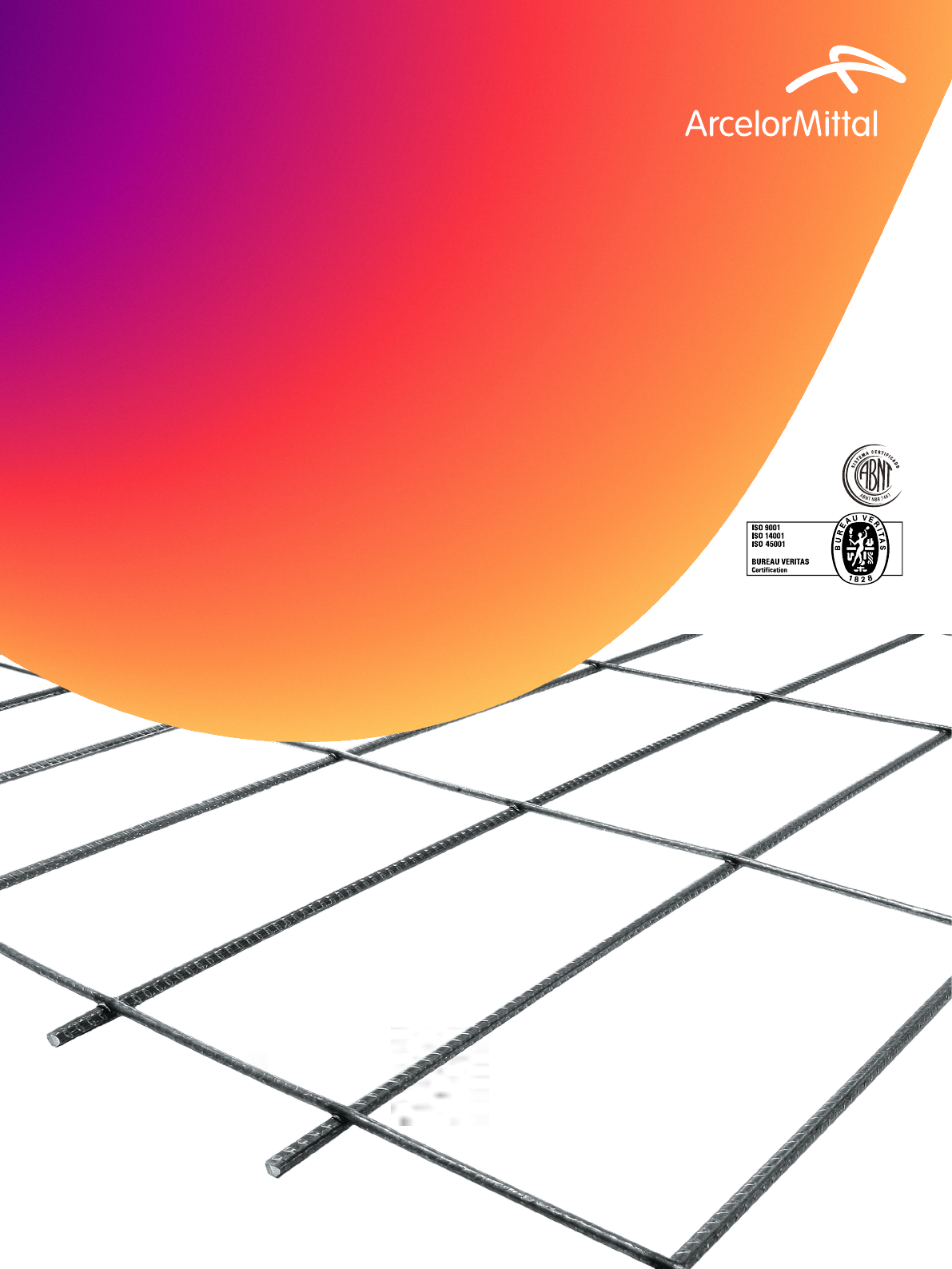 <p>Telas Soldadas</p><p>Nervuradas</p><p>Aços Longos</p><p>Telas Soldadas Nervuradas</p><p>As Telas Soldadas Nervuradas ArcelorMittal oferecem melhor aderência entre o aço e o concreto,</p><p>ligação dos elementos estruturais e controle da fissuração.</p><p>Eficiência</p><p>NBR 7481 — Tela de aço soldada nervurada para armadura de concreto — Requisitos.</p><p>NBR 7480 — Aço destinado a armaduras para estrutura de concreto armado — Especificação.</p><p>NBR 5916 — Junta de tela de aço soldada para armadura de concreto.</p><p>— Ensaio de resistência ao cisalhamento — Método de ensaio.</p><p>NBR 6118 — Projeto de estruturas de concreto — Procedimento.</p><p>Especificações</p><p>As Telas Soldadas Nervuradas da ArcelorMittal são armaduras pré-fabricadas constituídas por fios de aço CA 60 Nervurado</p><p>longitudinais e transversais de alta resistência mecânica, sobrepostos e soldados entre si em todos os pontos de cruzamento</p><p>(nós) por corrente elétrica (caldeamento), formando malhas quadradas ou retangulares. Os fios utilizados na fabricação</p><p>das Telas Soldadas são obtidos por laminação a frio, a partir de matéria-prima de alta qualidade.</p><p>Produto certificado pela ABNT/Inmetro, que atesta</p><p>a qualidade dos aços ArcelorMittal. Além da certificação</p><p>do Rótulo Ecológico ABNT, o produto está associado</p><p>ao compromisso da organização com a sustentabilidade.</p><p>Qualidade</p><p>Os fios nervurados apresentam elevados valores</p><p>de limites de escoamento e resistência, são produzidos</p><p>em dimensões apropriadas e dispostos automaticamente</p><p>em cruz, sendo então soldados por “processo a ponto”,</p><p>sem adição de qualquer outro material,</p><p>por máquinas de alta precisão.</p><p>Tecnologia</p><p>ArcelorMittal | Telas Soldadas Nervuradas 2</p><p>• Lajes (maciças, nervuradas, pré-moldadas, cogumelos,</p><p>protendidas e planas com formadores de vazios)</p><p>• Pisos industriais</p><p>• Pavimentos de concreto armado (estradas)</p><p>• Pré-moldados</p><p>• Pontes e viadutos</p><p>• Aduelas (pré-moldadas e moldadas in loco)</p><p>• Piscinas</p><p>• Fundações em geral</p><p>• Canais</p><p>• Paredes diafragma</p><p>• Revestimentos de túneis</p><p>• Caixas-d’água</p><p>• Paredes autoportantes (tilt-up)</p><p>• Revestimentos de tubos submarinos,</p><p>gasodutos e oleodutos</p><p>• Contenção de encostas (concreto projetado)</p><p>• Silos</p><p>• Paredes de concreto</p><p>• Barreiras de concreto (pontes, rodovias e estradas)</p><p>Aplicações</p><p>*Seções exatas.</p><p>• Uniformidade dos diâmetros*</p><p>• Espaçamento uniforme dos fios*</p><p>• Aderência ao concreto por meio das juntas</p><p>soldadas e fios nervurados</p><p>• Segurança na ancoragem</p><p>• Facilidade de inspeção pelo engenheiro fiscal</p><p>• Posicionamento adequado nas fôrmas</p><p>• Controle de qualidade</p><p>Vantagens técnicas</p><p>Observação:</p><p>As Telas Soldadas Nervuradas são transportadas por gruas,</p><p>elevadores de obra, guinchos e sistemas de roldanas,</p><p>e cortadas por tesoura corta-vergalhão.</p><p>• Não há perdas por desbitolamento</p><p>• Reduz perdas por corte e sobras de pontas</p><p>• Dispensa o uso do arame de amarração</p><p>• Traspasse menor que o da armadura convencional</p><p>• Dimensões diferentes sob encomenda</p><p>podem ser estudadas</p><p>• Quantificada e utilizada por metro quadrado</p><p>• Racionaliza o recebimento e a armazenagem</p><p>• Reduz cortes e dobramentos</p><p>• Facilita a montagem</p><p>• Torna mais rápida a liberação para concretagem</p><p>• Redução do número de pessoas no canteiro</p><p>e risco de acidentes</p><p>Vantagens econômicas</p><p>ArcelorMittal | Telas Soldadas Nervuradas 3</p><p>Elementos da Tela Soldada</p><p>Tipos de Telas</p><p>La</p><p>rg</p><p>ur</p><p>a</p><p>Comprimento</p><p>La</p><p>rg</p><p>ur</p><p>a</p><p>Comprimento</p><p>La</p><p>rg</p><p>ur</p><p>a</p><p>Comprimento</p><p>Tipo Q (Ast = Asl)</p><p>Tipo T (Ast ≥ 1/3Asl)</p><p>Tipo R (Ast = 2/3Asl)</p><p>Tipo M (Ast = 1/2Asl)</p><p>Tipo L (Ast ≤ 1/3Asl)</p><p>Ast = Área da seção dos fios transversais, por metro de tela.</p><p>Asl = Área da seção dos fios longitudinais, por metro de tela.</p><p>La</p><p>rg</p><p>ur</p><p>a</p><p>Espaçamento</p><p>Transversal</p><p>Espaçamento</p><p>Longitudinal</p><p>Malha</p><p>Franja</p><p>Transversal</p><p>Fios Transversais</p><p>Fios Longitudinais</p><p>Franja</p><p>Longitudinal</p><p>Comprimento</p><p>Direção de Fabricação</p><p>ArcelorMittal | Telas Soldadas Nervuradas 4</p><p>Telas especiais (espaçamento, franja e/ou dimensões diferentes das especificadas nas telas padronizadas acima): sob consulta.</p><p>Telas Soldadas Nervuradas para Estruturas de Concreto Armado</p><p>Aço CA 60 Espaçamento</p><p>entre fios (cm) Diâmetro (mm) Seções (cm2/m)</p><p>Apresentação</p><p>Dimensões (m) Peso</p><p>Série Designação Long. x Transv. Long. x Transv. Long. x Transv. Larg. x Compr. kg/m2 kg/peça</p><p>61 Q 61 15 x 15 3,4 x 3,4 0,61 x 0,61 Painel 2,45 x 6,00 0,97 14,3</p><p>75 Q 75 15 x 15 3,8 x 3,8 0,75 x 0,75 Painel 2,45 x 6,00 1,21 17,8</p><p>92</p><p>Q 92 15 x 15 4,2 x 4,2 0,92 x 0,92 Painel 2,45 x 6,00 1,48 21,8</p><p>T 92 30 x 15 4,2 x 4,2 0,46 x 0,92 Painel 2,45 x 6,00 1,12 16,5</p><p>113</p><p>Q 113 10 x 10 3,8 x 3,8 1,13 x 1,13 Painel 2,45 x 6,00 1,80 26,5</p><p>L 113 10 x 30 3,8 x 3,8 1,13 x 0,38 Painel 2,45 x 6,00 1,21 17,8</p><p>T 113 30 x 10 3,8 x 3,8 0,38 x 1,13 Painel 2,45 x 6,00 1,22 17,9</p><p>138</p><p>Q 138 10 x 10 4,2 x 4,2 1,38 x 1,38 Painel 2,45 x 6,00 2,20 32,3</p><p>R 138 10 x 15 4,2 x 4,2 1,38 x 0,92 Painel 2,45 x 6,00 1,83 26,9</p><p>M 138 10 x 20 4,2 x 4,2 1,38 x 0,69 Painel 2,45 x 6,00 1,65 24,3</p><p>L 138 10 x 30 4,2 x 4,2 1,38 x 0,46 Painel 2,45 x 6,00 1,47 21,6</p><p>T 138 30 x 10 4,2 x 4,2 0,46 x 1,38 Painel 2,45 x