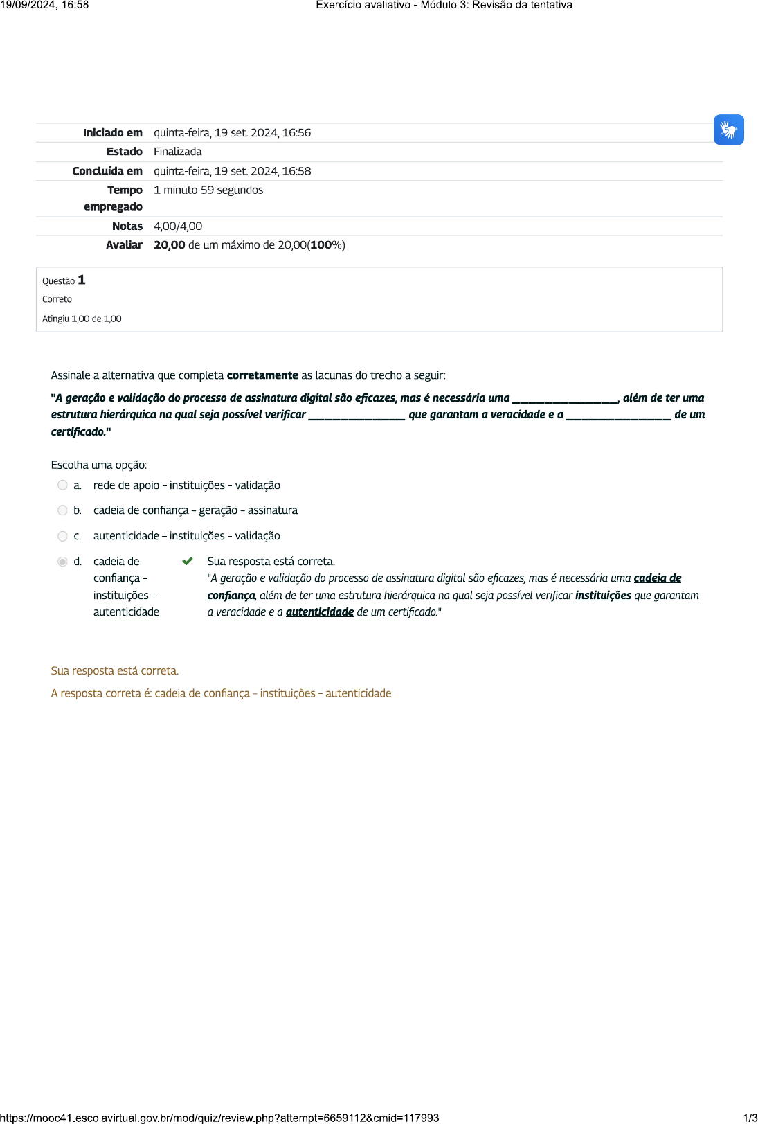 <p>19/09/2024, 16:58 Exercício avaliativo Módulo 3: Revisão da tentativa Iniciado em quinta-feira, 19 set. 2024, 16:56 Estado Finalizada Concluída em quinta-feira, 19 set. 2024, 16:58 Tempo 1 minuto 59 segundos empregado Notas 4,00/4,00 Avaliar 20,00 de um máximo de 20,00(100%) Questão 1 Correto Atingiu 1,00 de 1,00 Assinale a alternativa que completa corretamente as lacunas do trecho a seguir: "A geração e validação do processo de assinatura digital são eficazes, mas é necessária uma além de ter uma estrutura hierárquica na qual seja possível verificar que garantam a veracidade e a de um certificado." Escolha uma opção: a. rede de apoio - instituições - validação b. cadeia de confiança - geração - assinatura C. autenticidade - instituições - validação d. cadeia de Sua resposta está correta. confiança - "A geração e validação do processo de assinatura digital são eficazes, mas é necessária uma cadeia de instituições - confiança, além de ter uma estrutura hierárquica na qual seja possível verificar instituições que garantam autenticidade a veracidade e a autenticidade de um certificado." Sua resposta está correta. A resposta correta é: cadeia de confiança - instituições - autenticidade 1/3</p><p>19/09/2024, 16:58 Exercício avaliativo Módulo 3: Revisão da tentativa Questão 2 Correto Atingiu 1,00 de 1,00 A respeito da impressão de documentos digitais, analise cada afirmativa julgando se é Verdadeira ou Falsa: Verdadeira Um documento assinado digitalmente perde a sua validade quando impresso. Há alguns sistemas que permitem acessan o documento "original" digitalmente assinado e arquivado em suas Verdadeira bases de dados. A existência de QR Code, código de barras ou código numérico garante validação ao conteúdo e as assinaturas, Falsa permitindo uma cópia impressa do documento. Mesmo que exista um selo ou uma marca no documento, indicando que ele está assinado, sem a verificação digital Verdadeira é impossível confirmar a validade ou, até mesmo, a existência de uma assinatura digital. Sua resposta está correta. A resposta correta é: Um documento assinado digitalmente perde a sua validade quando impresso. Verdadeira, Há alguns sistemas que permitem acessar o documento "original" digitalmente assinado e arquivado em suas bases de dados. Verdadeira, A existência de QR Code, código de barras ou código numérico garante validação ao conteúdo e as assinaturas, permitindo gerar uma cópia impressa do documento. Falsa, Mesmo que exista um selo ou uma marca no documento, indicando que ele está assinado, sem a verificação digital é impossível confirmar a validade ou, até mesmo, a existência de uma assinatura digital. - Verdadeira. Questão 3 Correto Atingiu 1,00 de 1,00 Analise as seguintes afirmativas. I. A diferença significativa entre assinar digitalmente e coassinar digitalmente um documento é a responsabilização do assinante. II. Se a pessoa está ciente do conteúdo que está assinando e se responsabiliza pelos seus termos, coassinante é uma mera testemunha de que a transação está sendo formalizada. III. Por isso, geralmente, os assinadores têm funções/abordagens diferentes para assinantes e coassinantes. A opção de coassinatura não está disponível para assinaturas no padrão PDF PAdES. É correto afirmar que: Escolha uma opção: a. As afirmativas e são verdadeiras e a III é falsa. b. Nenhuma afirmativa é verdadeira. C. As afirmativas e III são verdadeiras e a é falsa. d. As afirmativas e são verdadeiras e a III complementa ambas. Sua resposta está correta! Todas as opções apresentadas são verdadeiras. Sua resposta está correta. A resposta correta é: As afirmativas e são verdadeiras e a III complementa ambas. 2/3</p><p>19/09/2024, 16:58 Exercício avaliativo - Módulo 3: Revisão da tentativa Questão 4 Correto Atingiu 1,00 de 1,00 Com base em qualquer alteração que ocorra no conteúdo de um documento assinado digitalmente, analise cada uma das seguintes afirmativas e julgue-as como V (verdadeiras) ou F (falsas). ( ) A validade do documento permanece inalterada, caso não haja alteração visível. ( ) Será necessário gerar uma nova assinatura, para que as alterações passem a validade legal. ( ) Qualquer alteração no conteúdo do arquivo invalida a assinatura. ( ) Para uma assinatura digital ser validada não é preciso ter um certificado, basta acessar um sistema validador. Agora, marque a alternativa Escolha uma opção: a. V-F-V-F b. C. d. F V Sua resposta está correta. - V - É falso afirmar que a validade de um documento permanece inalterada caso não haja alteração visível. Qualquer V tipo de alteração, mesmo não visível, invalida uma assinatura digital. Sua resposta está correta. A resposta correta é: V V 3/3</p>