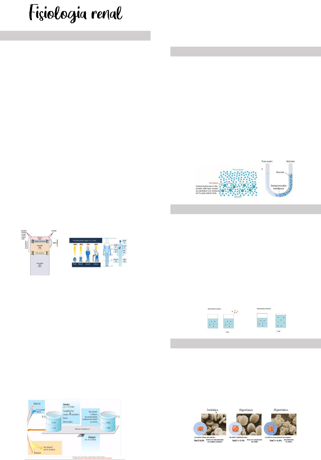 <p>HOMEOSTASIA:</p><p>➔ Tentativa do corpo em se manter em</p><p>equilíbrio dinâmico</p><p>➔ Rins contribuem com os volumes e junto</p><p>com outros órgãos</p><p>➔ Líquido intracelular: 60-67% da H2O</p><p>corporal</p><p>• Conjunto de todas as diferentes células</p><p>• É separado do LEC por uma membrana</p><p>muito permeável à H2O e pouco</p><p>permeável à grande maioria dos eletrólitos</p><p>presentes no corpo</p><p>➔ Líquido extracelular: 33-40% da H2O</p><p>corporal</p><p>• Dividido em líquido intersticial e plasma</p><p>sanguíneo</p><p>• Ingestão de H2O, suor, fezes, urina ➔</p><p>alteram seu volume</p><p>• Plasma: parte não celular do sangue</p><p>➔ Com o envelhecimento, o percentual total</p><p>de H2O no corpo cai ➔ aumento do</p><p>potencial de tecido adiposo no corpo</p><p>➔ Íons osmoticamente ativos ➔ movimento</p><p>de líquidos (osmose)</p><p>• Osmose: solvente</p><p>• Difusão: soluto</p><p>• Transporte ativo (1° e 2°)</p><p>➔ Entrada e saída de líquidos:</p><p>• Necessário para manter a</p><p>homeostasia</p><p>• A manutenção do volume depende</p><p>constantemente do adequado balanço</p><p>das trocas de líquidos entre os</p><p>compartimentos</p><p>• Entrada de líquido = saída de líquidos</p><p>➔ Devido ao fato do plasma e fluído</p><p>intersticial serem separados apenas por</p><p>membranas capilares altamente</p><p>permeáveis, sua composição iônica é</p><p>semelhante</p><p>EQUILÍBRIO OSMÓTICO:</p><p>➔ A distribuição dos líquidos entre os</p><p>compartimentos intra e extracel são</p><p>determinados pelo efeito osmótico de</p><p>solutos menores- Na+, Cl- e outros</p><p>eletrólitos- atingindo através da</p><p>membrana celular</p><p>➔ Osmose: difusão de H2O da maior [ ] para</p><p>menor [ ]</p><p>• Efeito osmótico ➔ membrana celular +</p><p>permeável à H2O e pouco permeável</p><p>a íons</p><p>OSMOLALIDADE X OSMOLARIDADE:</p><p>➔ Osmolalidade: [ ] osmolar de uma</p><p>solução Osm/kg H2O</p><p>• [ ] é expressa em ósmois por quilograma</p><p>de água</p><p>➔ Osmolaridade: [ ] osmolar de uma</p><p>solução em Osm/1</p><p>• [ ] expressa em osmóis por litro de</p><p>solução</p><p>➔ Osmóis: nº total de partículas</p><p>osmoticamente ativas na solução</p><p>TONICIDADE:</p><p>➔ Tonicidade: capacidade de uma solução</p><p>de reduzir ou aumentar o volume celular</p><p>• Diretamente relacionada com</p><p>osmolaridade</p><p>• Alterações pequenas na [ ] do soluto</p><p>impermeantes ➔ grandes alterações no</p><p>volume da célula</p><p>➔ Isotônica: não altera o volume das células</p><p>➔ Hipotônica: causa inchamento</p><p>(irreversível)</p><p>ALTERAÇÕES NA OSMOLARIDADE DO LEC</p><p>ALTERA O VOLUME DO LIC:</p><p>➔ Hipertônica: células murchas (reversível)</p><p>➔ Causas: ingestão de H2O, desidratação,</p><p>infusão intravenosa, suor e excesso de</p><p>urina</p><p>➔ Princípios básicos:</p><p>• A H2O se move rapidamente de um lado</p><p>para outro da membrana celular ➔</p><p>osmolalidades do LEC e LIC = as</p><p>membranas celulares são quase</p><p>impermeáveis a muitos solutos ➔ n° de</p><p>osmóis do LEC e LIC constantes</p><p>↬ Adição de solução salina no LEC:</p><p>• Solução salina isotônica:</p><p>- osmolaridade do LEC não se altera</p><p>- não ocorre osmose através das</p><p>membranas celulares</p><p>- aumento no volume do LEC</p><p>- sódio e cloreto se mantêm no LEC</p><p>• Solução salina hipertônica:</p><p>- osmolaridade extracelular aumenta ➔</p><p>causa osmose de água das células para o</p><p>compartimento extracelular</p><p>- aumento do volume extracelular</p><p>- redução do volume intracelular</p><p>- aumento na osmolaridade de ambos os</p><p>compartimentos</p><p>• Solução salina hipotônica:</p><p>- osmolaridade do LEC diminui e parte da</p><p>água extracelular se difunde por osmose</p><p>para as células, até que os</p><p>compartimentos intra e extracelular</p><p>tenham a mesma osmolaridade</p><p>- tanto o volume intra e extracelular</p><p>aumenta, embora o intra aumente em</p><p>maior grau</p><p>- transitório</p><p>HIPONATREMIA E HIPERNATREMIA:</p><p>➔ Anormalidades clínicas relacionadas ao</p><p>balanço hidroeletrolítico ➔ regulação do</p><p>volume de líquidos</p><p>➔ Osmolaridade do paciente ➔ [ ] de Na+</p><p>no plasma</p><p>➔ Hiponatremia: < 142 mEq/L</p><p>➔ Hipernatremia: > 142 mEq/L</p><p>↬ Hiponatremia:</p><p>• ↓ [ ] Na+ ↓ [ ] Cl- no LEC ou adição de</p><p>H2O no LEC</p><p>• Hiponatremia-desidratação ➔ ↓ vol. do</p><p>LEC</p><p>- diarreia, vômito, diurético (inibem a</p><p>reabsorção de Na+ ➔ excreção excessiva</p><p>de Na+</p><p>• Retenção excessiva de H2O dilui o Na+</p><p>do LEC</p><p>• Hipernatremia-hiperidratação</p><p>• Secreção excessiva de ADH ➔ túbulo</p><p>reabsorve + H2O ➔ inchaço celular</p><p>• ↓ rápida do Na+ plasmático ➔ causa</p><p>edema das células cerebrais</p><p>- fluxo osmótico de H2O para a células,</p><p>inchando-a</p><p>↬ Hipernatremia:</p><p>• ↑ [ ] Na+ ➔ ↓ H2O do LEC ↑ [ ] Na+</p><p>OU excesso de Na+ no LEC</p><p>• Hipernatremia-desidratação</p><p>• Deficiência da secreção de ADH que é</p><p>necessário para os rins conservarem H2O</p><p>no corpo</p><p>• ↓ ADH ➔ rins excretam ↑ quantidade de</p><p>urina diluída (diabetes insípidos)</p><p>• Desidratação, ↑ [ ] Cl- no LEC</p><p>• Hipernatremia ➔ ↓ vol LEC ➔</p><p>desidratação pelo ↓ ganho que perda de</p><p>H2O pelo corpo (suor)</p><p>• Adição excessiva de CL- no LEC é</p><p>associado a retenção de H2O nos rins</p><p>- ↑ secreção de ADH, fazendo com que os</p><p>rins absorvam ↑quantidade de H2O e Na+</p><p>• Cloreto de sódio hipo-osmótico</p><p>ANATOMIA RENAL:</p><p>➔ Rim: 150g (mão fechada) na parede</p><p>posterior do abdome</p><p>➔ Hilo: lado medial</p