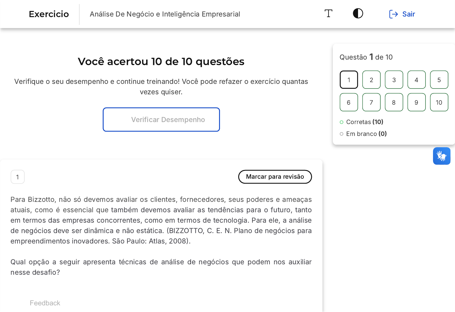 <p>Você acertou 10 de 10 questões</p><p>Verifique o seu desempenho e continue treinando! Você pode refazer o exercício quantas</p><p>vezes quiser.</p><p>Verificar Desempenho</p><p>1 Marcar para revisão</p><p>Para Bizzotto, não só devemos avaliar os clientes, fornecedores, seus poderes e ameaças</p><p>atuais, como é essencial que também devemos avaliar as tendências para o futuro, tanto</p><p>em termos das empresas concorrentes, como em termos de tecnologia. Para ele, a análise</p><p>de negócios deve ser dinâmica e não estática. �BIZZOTTO, C. E. N. Plano de negócios para</p><p>empreendimentos inovadores. São Paulo: Atlas, 2008�.</p><p>Qual opção a seguir apresenta técnicas de análise de negócios que podem nos auxiliar</p><p>nesse desafio?</p><p>Questão 1 de 10</p><p>Corretas �10�</p><p>Em branco �0�</p><p>1 2 3 4 5</p><p>6 7 8 9 10</p><p>Feedback</p><p>Exercicio Análise De Negócio e Inteligência Empresarial Sair</p><p>A</p><p>B</p><p>C</p><p>D</p><p>E</p><p>Análises orgânica, mineral e petroplintita.</p><p>Análises de coleta, preparação e implementação.</p><p>Análises sistemática, conglomerada e estratificada.</p><p>Análises MOST, SWOT e CATWOE.</p><p>Análise estatística, inteligência competitiva e gestão do conhecimento.</p><p>Resposta correta</p><p>Parabéns, você selecionou a alternativa correta. Confira o gabarito comentado!</p><p>Gabarito Comentado</p><p>Existem inúmeras técnicas de análise de negócios. Entre as mais utilizadas podemos</p><p>citar as análises MOST, SWOT e CATWOE. Apesar de usarem aspectos distintos para</p><p>avaliar um negócio, todas buscam o mesmo objetivo: entender a posição da empresa</p><p>em relação ao setor em que atua.</p><p>A</p><p>B</p><p>C</p><p>D</p><p>E</p><p>2 Marcar para revisão</p><p>Os elementos da análise MOST são missão, objetivos, estratégias e táticas. Para que esses</p><p>elementos são utilizados?</p><p>Para entender o comportamento dos concorrentes da organização.</p><p>Para a tomada de decisão de qual caminho a organização deve seguir.</p><p>Para analisar qual é a missão de uma organização e como realizá-la.</p><p>Para coletar, tratar, analisar e disseminar as táticas da organização.</p><p>Para oferecer insights aos tomadores de decisão da organização.</p><p>Resposta correta</p><p>Parabéns, você selecionou a alternativa correta. Confira o gabarito comentado!</p><p>Gabarito Comentado</p><p>A análise MOST é uma ferramenta estratégica que auxilia na compreensão e na</p><p>realização da missão de uma organização. Ela é composta por quatro elementos:</p><p>A</p><p>B</p><p>C</p><p>Missão, Objetivos, Estratégias e Táticas. A missão define o propósito fundamental da</p><p>organização. Os objetivos são metas específicas que a organização pretende alcançar.</p><p>As estratégias são os planos de ação para alcançar esses objetivos. E as táticas são as</p><p>ações específicas que serão tomadas para implementar as estratégias. Portanto, a</p><p>alternativa correta é a que afirma que a análise MOST é utilizada para analisar qual é a</p><p>missão de uma organização e como realizá-la.</p><p>3 Marcar para revisão</p><p>O termo Business Intelligence foi cunhado por Richard Miller Devens em seu livro de 1865</p><p>"Cyclopaedia of Commercial and Business Anecdotes". Quase um século depois, em 1958,</p><p>o cientista da computação da IBM, Hans Peter Luhn, publicou um artigo sobre o poder do</p><p>BI através do uso da tecnologia. Como o BI através do uso da tecnologia pode contribuir</p><p>com a organização no alcance de seus objetivos de negócios e sua missão organizacional?</p><p>Na estruturação e interpretação de informações.</p><p>Na tomada da decisão sem necessidade do gestor.</p><p>Na observação e investigação da concorrência.</p><p>D</p><p>E</p><p>Na automação e otimização de processos repetitivos.</p><p>Na extração, tratamento e armazenamento de dados.</p><p>Resposta correta</p><p>Parabéns, você selecionou a alternativa correta. Confira o gabarito comentado!</p><p>Gabarito Comentado</p><p>A finalidade do Business Intelligence é auxiliar a organização na estruturação e</p><p>interpretação de informações para que possa alcançar seus objetivos de negócios e</p><p>sua missão organizacional.</p><p>4 Marcar para revisão</p><p>Uma análise de dados adequada pode ajudar a identificar problemas antes que eles se</p><p>tornem críticos e permitir que as empresas tomem medidas proativas para evitar possíveis</p><p>problemas futuros. Acerca dos seus conhecimentos sobre análise de negócio e inteligência</p><p>empresarial, o que é o processo de Business Intelligence �BI�?</p><p>A</p><p>B</p><p>C</p><p>D</p><p>E</p><p>Um conjunto de técnicas e ferramentas utilizadas para otimizar o desempenho de</p><p>uma empresa.</p><p>Um processo de gerenciamento de estoque de mercadorias.</p><p>Um processo de automação de processos administrativos.</p><p>Um processo de coleta, armazenamento, análise e distribuição de informações</p><p>para a tomada de decisão empresarial.</p><p>Um processo de marketing digital.</p><p>Resposta correta</p><p>Parabéns, você selecionou a alternativa correta. Confira o gabarito comentado!</p><p>Gabarito Comentado</p><p>O processo de Business Intelligence �BI) é um conjunto de estratégias e tecnologias</p><p>usadas pelas empresas para a análise de dados de negócios. Ele envolve a coleta,</p><p>armazenamento, análise e distribuição de informações para a tomada de decisão</p><p>empresarial. O objetivo do BI é fornecer informações precisas, oportunas e detalhadas</p><p>A</p><p>B</p><p>C</p><p>D</p><p>E</p><p>para os tomadores de decisão, permitindo que eles façam escolhas informadas que</p><p>beneficiem a empresa.</p><p>5 Marcar para revisão</p><p>Em qual etapa do ciclo da Inteligência Competitiva compilamos informações dos</p><p>concorrentes, como no