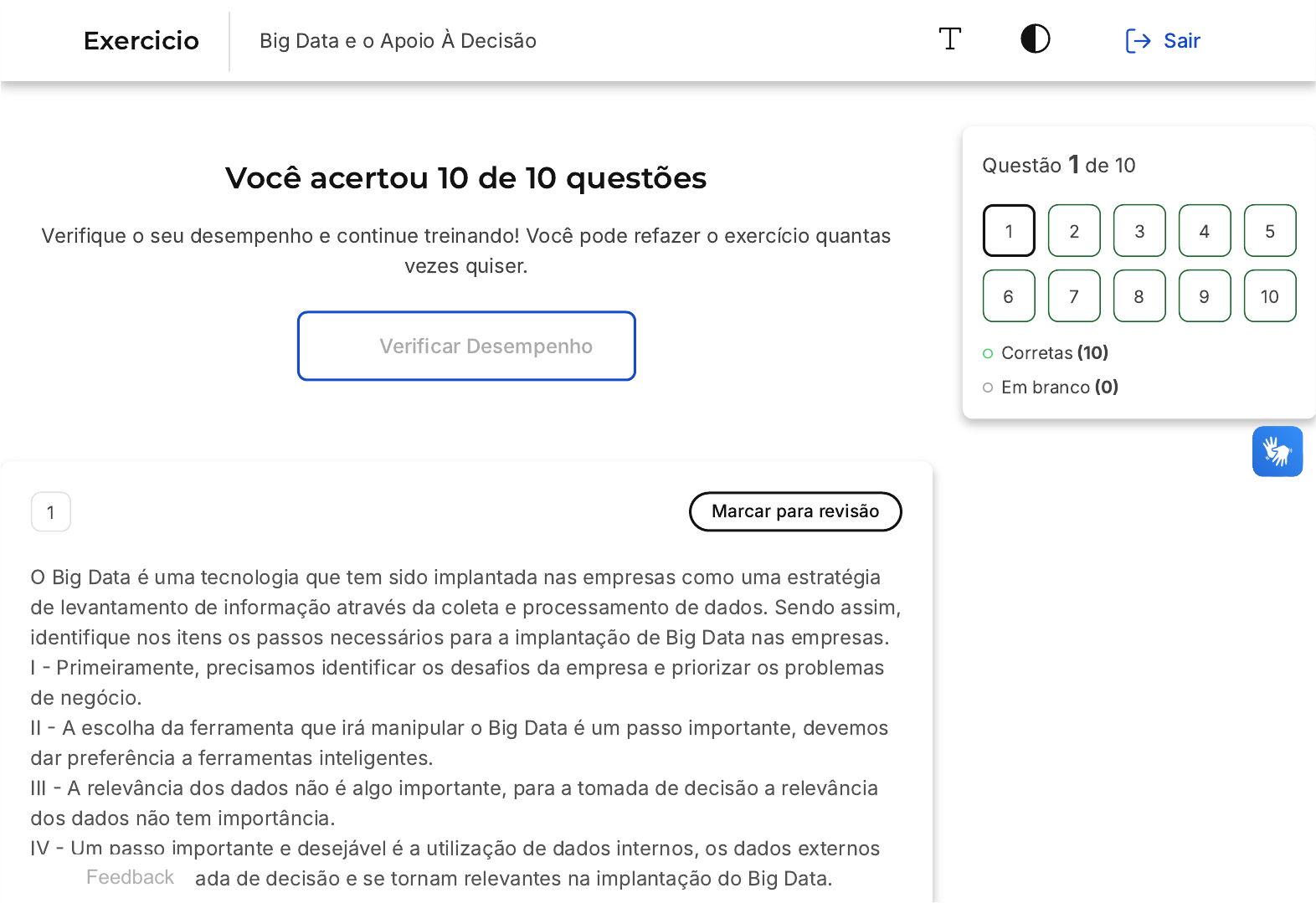 <p>Você acertou 10 de 10 questões</p><p>Verifique o seu desempenho e continue treinando! Você pode refazer o exercício quantas</p><p>vezes quiser.</p><p>Verificar Desempenho</p><p>1 Marcar para revisão</p><p>O Big Data é uma tecnologia que tem sido implantada nas empresas como uma estratégia</p><p>de levantamento de informação através da coleta e processamento de dados. Sendo assim,</p><p>identifique nos itens os passos necessários para a implantação de Big Data nas empresas.</p><p>I � Primeiramente, precisamos identificar os desafios da empresa e priorizar os problemas</p><p>de negócio.</p><p>II � A escolha da ferramenta que irá manipular o Big Data é um passo importante, devemos</p><p>dar preferência a ferramentas inteligentes.</p><p>III � A relevância dos dados não é algo importante, para a tomada de decisão a relevância</p><p>dos dados não tem importância.</p><p>IV � Um passo importante e desejável é a utilização de dados internos, os dados externos</p><p>não afetam a tomada de decisão e se tornam relevantes na implantação do Big Data.</p><p>Questão 1 de 10</p><p>Corretas �10�</p><p>Em branco �0�</p><p>1 2 3 4 5</p><p>6 7 8 9 10</p><p>Feedback</p><p>Exercicio Big Data e o Apoio À Decisão Sair</p><p>A</p><p>B</p><p>C</p><p>D</p><p>E</p><p>Estão certos apenas os itens:</p><p>Os itens I � II � III � IV estão corretos.</p><p>Apenas o item I está correto.</p><p>Apenas o item III está correto.</p><p>Apenas os itens II e III estão corretos.</p><p>Apenas os itens I e II estão corretos.</p><p>Resposta correta</p><p>Parabéns, você selecionou a alternativa correta. Confira o gabarito comentado!</p><p>Gabarito Comentado</p><p>O Big Data tem revolucionado a forma como as empresas desenvolvem suas</p><p>estratégias de mercado, avaliam a recepção do público aos seus produtos e serviços e</p><p>identificam as principais tendências do seu setor. Para implementar o Big Data,</p><p>existem alguns passos cruciais a serem seguidos, tais como:</p><p>Identificar os desafios da empresa e priorizar os problemas de negócio.</p><p>A</p><p>B</p><p>Escolher a ferramenta adequada para manipular o Big Data, dando preferência a</p><p>ferramentas inteligentes que possam ser aplicadas em processos extremamente</p><p>importantes para a coleta, processamento, análise e armazenamento dos dados.</p><p>Reconhecer a relevância dos dados para a tomada de decisão.</p><p>Utilizar tanto dados internos quanto externos, pois ambos podem afetar a tomada</p><p>de decisão e são relevantes na implantação do Big Data.</p><p>Portanto, apenas os itens I e II estão corretos, pois a relevância dos dados (item III) é</p><p>sim importante para a tomada de decisão e tanto os dados internos quanto externos</p><p>(item IV) são relevantes na implantação do Big Data.</p><p>2 Marcar para revisão</p><p>�INSTITUTO AOCP � 2018 � PRODEB � Especialista de TIC � B.I�</p><p>Big Data requer clusters de servidores de apoio às ferramentas que processam grandes</p><p>volumes, alta velocidade e formatos variados de Big Data. Nesse sentido, é correto afirmar</p><p>que Hadoop refere-se a:</p><p>Um sistema de armazenamento e processamento de dados massivamente</p><p>escalável - não é um banco de dados.</p><p>Uma estratégia baseada em tecnologia que permite a coleta de insights mais</p><p>profundos e relevantes dos clientes, parceiros e sobre o negócio.</p><p>C</p><p>D</p><p>E</p><p>Um banco de dados com capacidade melhorada.</p><p>Um equipamento de hardware que permite que sistemas administrem crescentes</p><p>cargas de processamento.</p><p>Um banco de dados com tecnologia de virtualização.</p><p>Resposta correta</p><p>Parabéns, você selecionou a alternativa correta. Confira o gabarito comentado!</p><p>Gabarito Comentado</p><p>O Hadoop é um sistema de armazenamento compartilhado, distribuído e altamente</p><p>confiável para processamento de grandes volumes de dados, sejam eles estruturados</p><p>ou não, através de clusters de computadores. Em outras palavras, o Hadoop é um</p><p>framework que facilita o funcionamento de diversos computadores, com o objetivo de</p><p>analisar grandes volumes de dados.</p><p>3 Marcar para revisão</p><p>�CESPE � 2017 � TCE�PE � Auditor de Controle Externo - Auditoria de Contas Públicas -</p><p>questão adaptada) Com relação a fundamentos e conceitos de Big Data, julgue os itens a</p><p>A</p><p>B</p><p>C</p><p>D</p><p>E</p><p>seguir.</p><p>I � Além de estar relacionado à grande quantidade de informações a serem analisadas, o</p><p>Big Data considera o volume, a velocidade e a variedade dos dados estruturados - dos</p><p>quais se conhece a estrutura de armazenamento - bem como dos não estruturados, como</p><p>imagens, vídeos, áudios e documentos.</p><p>II � Big Data refere-se a uma nova geração de tecnologias e arquiteturas projetadas para</p><p>processar volumes muito grandes e com grande variedade de dados, permitindo alta</p><p>velocidade de captura, descoberta e análise.</p><p>III � De maneira geral, Big Data não se refere apenas aos dados, mas também às soluções</p><p>tecnológicas criadas para lidar com dados em volume, variedade e velocidade</p><p>significativos.</p><p>Estão certos apenas os itens:</p><p>Os itens I � II � III estão corretos.</p><p>Apenas o item I está correto.</p><p>Apenas o item III está correto.</p><p>Apenas os itens II e III estão corretos.</p><p>Apenas os itens I e III estão corretos.</p><p>Resposta correta</p><p>Parabéns, você selecionou a alternativa correta. Confira o gabarito comentado!</p><p>Gabarito Comentado</p><p>Big Data é um conceito que se refere ao grande volume de dados, tanto estruturados</p><p>quanto não estruturados, que impactam as empresas diariamente. Os dados</p><p>estruturados são aqueles que possuem uma estrutura predefinida, com categorias e</p><p>definições claras, como localização, vendas e informações sobre o