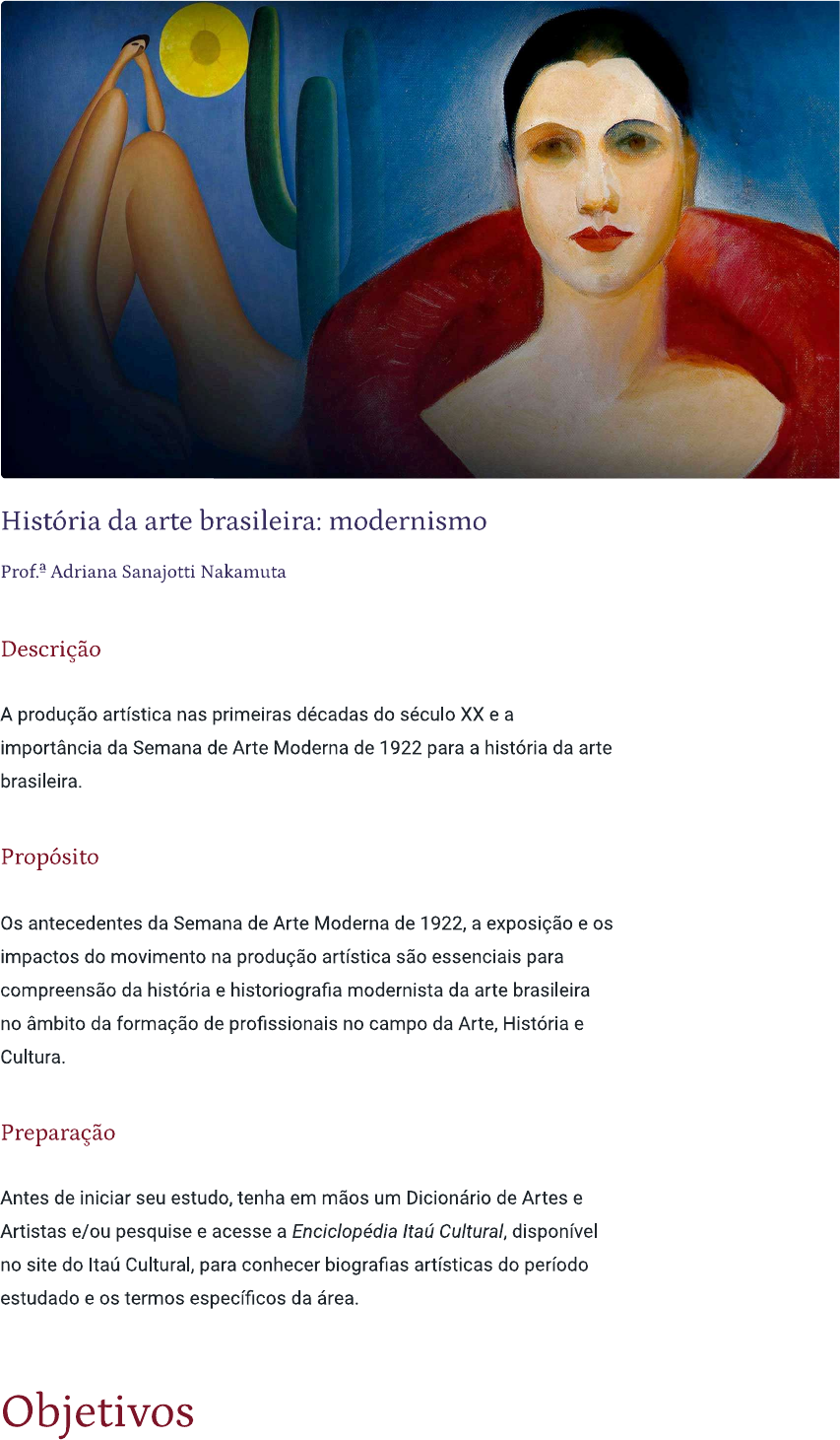<p>História da arte brasileira: modernismo Adriana Sanajotti Nakamuta Descrição A produção artística nas primeiras décadas do século XX e a importância da Semana de Arte Moderna de 1922 para a história da arte brasileira. Propósito Os antecedentes da Semana de Arte Moderna de 1922, a exposição e os impactos do movimento na produção artística são essenciais para compreensão da história e historiografia modernista da arte brasileira no âmbito da formação de profissionais no campo da Arte, História e Cultura. Preparação Antes de iniciar seu estudo, tenha em mãos um Dicionário de Artes e Artistas e/ou pesquise e acesse a Enciclopédia Itaú Cultural, disponível no site do Itaú Cultural, para conhecer biografias artísticas do período estudado e os termos específicos da área. Objetivos</p><p>Módulo 1 Contexto histórico do modernismo Reconhecer o contexto histórico e a prática artística no âmbito do modernismo. Módulo 2 Antecedentes da semana de arte moderna de 1922 Identificar as motivações que antecederam a Semana de Arte Moderna de 1922. Módulo 3 A semana de arte moderna de 1922 Analisar a produção artística e o ambiente cultural da Semana de Arte Moderna de 1922.</p><p>Introdução É comum ouvirmos a expressão "Semana de 22" para designar a produção artística moderna no Brasil, isso porque a realização da Semana de Arte Moderna, exposição ocorrida em São Paulo, dentro das festividades do Centenário de Independência do Brasil, no ano de 1922, tornou-se um símbolo, um marco importante da cultura brasileira, "inaugurando" a apresentação coletiva e pública do movimento que se dedicou à renovação das artes, à atualização estética e à construção de uma identidade nacional. Nos módulos a seguir, compreenderemos estes três motes importantes: antecedentes, preparatórios e exposição. Material para download Clique no botão abaixo para fazer o download do conteúdo completo em formato PDF. Download material</p><p>1 Contexto histórico do modernismo Ao final deste módulo, você será capaz de reconhecer o contexto histórico e a prática artística no âmbito do modernismo. Contexto A história do contexto modernista Para além da exposição, do ponto de vista cronológico, que marca a chamada Semana de 22, os principais estudos sobre esse assunto situam a vigência do movimento modernista entre os anos de 1922 e 1960, período ao longo do qual se reconhecem geralmente três fases e/ou três gerações. A primeira, que corresponde à década de 1930 e que iremos nos deter aqui, foi marcada pela ênfase na atualização estética em relação às vanguardas artísticas que fervilhavam na Europa - em especial o futurismo, o expressionismo, o dadaísmo e o cubismo - e no combate ao "passadismo" e "academicismo" vigentes desde o século XIX. Conheça a seguir esses movimentos de vanguarda. Futurismo Fundado em Milão, pelo poeta italiano Marinetti, em 1909, trata- se de um movimento artístico que cunho político, cujo objetivo era livrar a Itália de um passado opressor, com olhos e movimento para o moderno. Um movimento com diversos manifestos, como a exposição futurista ocorrida em Paris, em</p><p>1912, que lançou as bases teóricas do movimento. Utilizaram-se, logo no início, das técnicas neoimpressionistas para a produção plástico-visual, servindo mais tarde de inspiração para os dadaístas. (CHILVERS, 2001, p. 204) Expressionismo Van Gogh é, sem dúvida, o maior nome do expressionismo, termo utilizado pela História da Arte para renovar as ideias do naturalismo em favor das formas em exageros, extravagantes, do uso intenso da cor, transmitindo, sobretudo, a emoção do artista. Trata-se de um termo que também se refere a uma tendência da arte europeia, cujo epicentro foi o movimento de renovação plástica ocorrida na arte alemã entre 1905 e 1930. (CHILVERS, 2001, p. 183) Dadaísmo Ou simplesmente dadá, como também é conhecido, é movimento de confronto ao conformismo de uma produção artística a serviço de uma antiarte. o movimento está centrado especialmente no espírito de desilusão com a Primeira Guerra Mundial, o que levou muitos artistas e escritores a reagiram em suas obras com ironia, cinismo e niilismo. Dadá foi fundado em 1915, em Zurique, por um grupo de escritores e artistas plásticos, e mais tarde, no pós-guerra, já havia chegado em Barcelona, Berlim, Colônia, Nova York e Paris. (CHILVERS, 2001, p. 140) Cubismo Criado por Picasso e Braque, é considerado um dos principais movimentos da arte ocidental, particularmente no campo da pintura e da escultura. Foi responsável pelo rompimento radical da ideia de que a arte é uma imitação da natureza, presentes especialmente na tradição renascentista. Ambos abandonaram as noções de perspectivas, modelagem, entre outros conceitos da tradição clássica, buscando representar a solidez bidimensional, sem apelar para a conversão da</p><p>tridimensionalidade no espaço plano pictórico pela ilusão. (CHILVERS, 2001, p. 137) Pode-se ainda considerar que essa fase inicial se caracteriza pela atitude combativa ao mesmo tempo que buscava um caminho próprio e a consolidação de uma arte verdadeiramente nacional. Diante disso, nos cabe aqui compreender o contexto histórico que antecede esse movimento no Brasil, o que nos leva inevitavelmente a compreender a produção artística e o cenário cultural do período entre os séculos XIX e XX, os preparatórios para a Semana de Arte Moderna e, consequentemente, a Semana e as exposições propriamente ditas. Um percurso pelo campo da arte e da cultura no início do século XX no Brasil, que contribui significativamente para a compreensão da renovação estética no campo da prática artística e das medidas ligadas às exposições e apresentações públicas culturais. Identidade A identidade do modernismo no Brasil Aracy Amaral, historiadora da arte e estudiosa do modernismo, em obra intitula