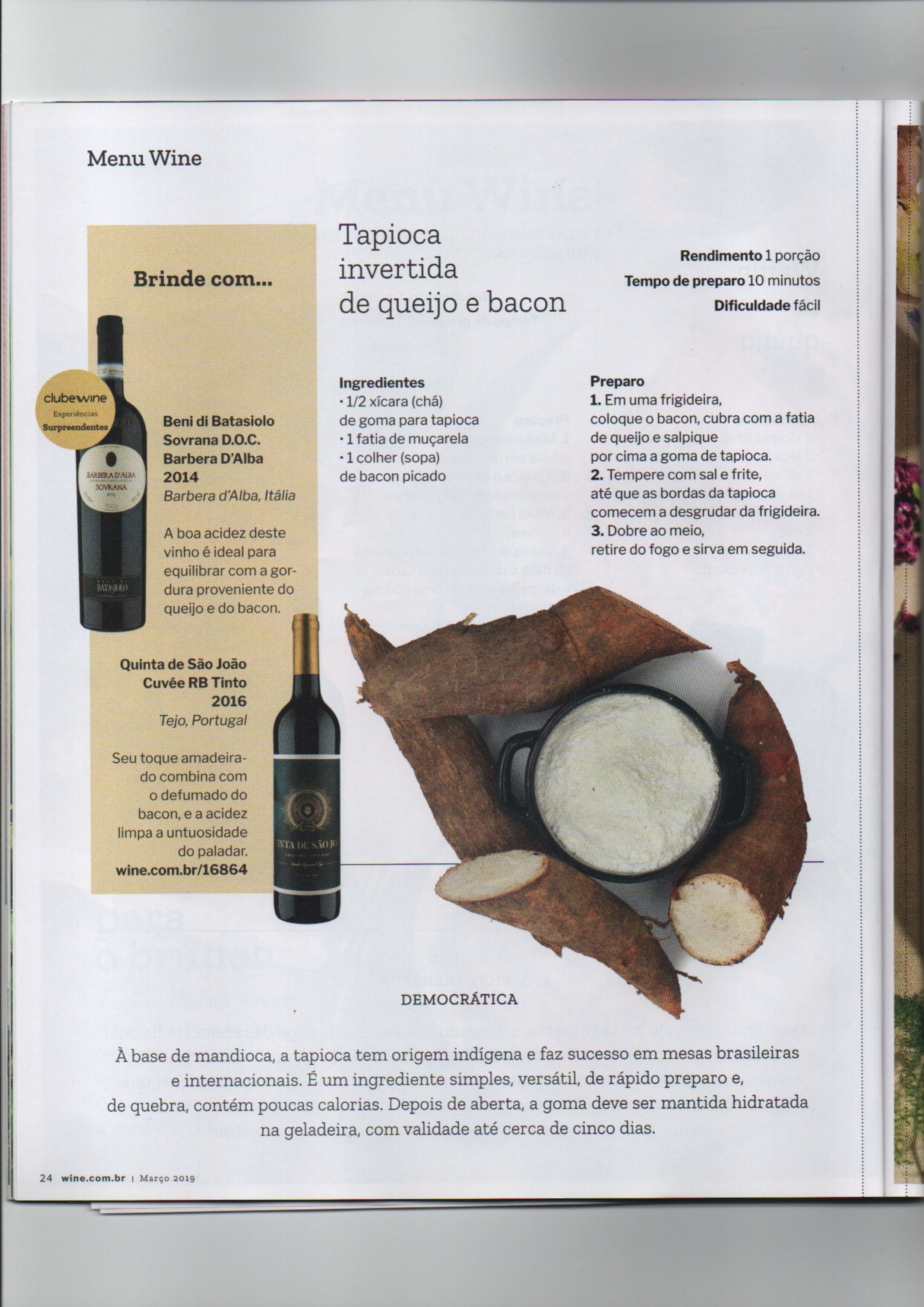 <p>Menu Wine Tapioca Rendimento 1 porção Brinde com... invertida Tempo de preparo 10 minutos de queijo e bacon Dificuldade fácil Ingredientes Preparo clubewine 1/2 xícara (chá) 1. Em uma frigideira, Experiências Beni di Batasiolo de goma para tapioca coloque o bacon, cubra com a fatia Surpreendentes Sovrana D.O.C. 1 fatia de de queijo e salpique Barbera D'Alba 1 colher (sopa) por cima a goma de tapioca. 2014 de bacon picado 2. Tempere com sal e frite, SOVRANA Barbera d'Alba, Itália até que as bordas da tapioca comecem a desgrudar da frigideira. A boa acidez deste 3. Dobre ao meio, vinho é ideal para retire do fogo e sirva em seguida. equilibrar com a gor- BATASIOLO dura proveniente do queijo e do bacon. Quinta de São João Cuvée RB Tinto 2016 Tejo, Portugal Seu toque amadeira- do combina com o defumado do bacon, e a acidez limpa a untuosidade do paladar. wine.com.br/16864 DEMOCRÁTICA À base de mandioca, a tapioca tem origem indígena e faz sucesso em mesas brasileiras e internacionais. É um ingrediente simples, versátil, de rápido preparo e, de quebra, contém poucas calorias. Depois de aberta, a goma deve ser mantida hidratada na geladeira, com validade até cerca de cinco dias. 24 wine.com.br 2019</p><p>MARQUE SUAS FOTOS COM #MENUWINE</p>