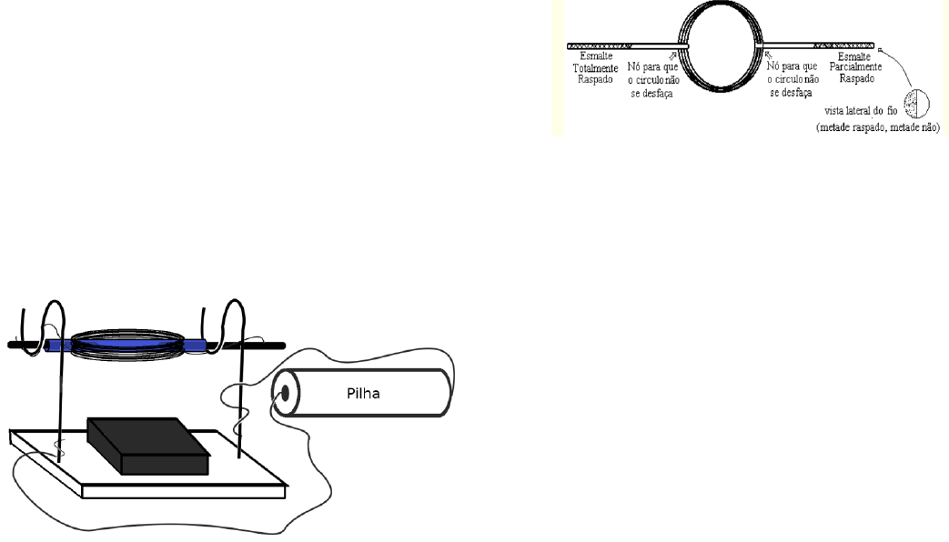 <p>Motor Elétrico</p><p>Física Experimental II</p><p>Bruno Oliveira, Jonas Mesquita</p><p>Licenciatura em Física</p><p>Instituto Federal do Ceará - IFCE</p><p>Maranguape - CE, Brasil.</p><p>Resumo– A aula experimental dessa semana foi voltada</p><p>para montarmos um simples motor elétrico usando</p><p>conceitos básicos da eletricidade.</p><p>Palavras-chave – Motor, eletricidade, circuitos,</p><p>multímetro, bobina.</p><p>I. INTRODUÇÃO</p><p>O motor é um componente imprescindível para maquinas,</p><p>veículos e equipamentos, são responsáveis por converter</p><p>formas de energia em energia mecânica. O funcionamento dos</p><p>motores elétricos está baseado nos princípios do</p><p>eletromagnetismo, os condutores situados em um campo</p><p>magnético sofrem a aça de uma força mecânica chamada de</p><p>torque.</p><p>Figura 1: Motor elétrico simples</p><p>II. MATERIAL UTILIZADO</p><p>• Fio de cobre esmaltado</p><p>• Imã</p><p>• Pilha grande</p><p>• Hastes</p><p>• Suporte para as hastes</p><p>III. PROCEDIMENTO EXPERIMENTAL</p><p>1. Devemos fazer uma bobina com o cobre esmaltado</p><p>assim como ilustrada na figura, não podemos esquecer</p><p>de raspar as extremidades da bobina para que o</p><p>experimente funcione.</p><p>Figura 2: bobina de cobre</p><p>2. Fixamos as hastes no suporte para que possamos</p><p>colocar a nossa bobina.</p><p>3. Precisamos de algo para alimentar a nossa bobina,</p><p>conectamos os polos da pilha em cada uma das nossas</p><p>hastes.</p><p>4. Coloque o imã embaixo da bobina.</p><p>5. Concluindo esses passos, devemos encaixar a boina e</p><p>iniciar movimento dano um pequeno empurrão para a</p><p>bobina começar a girar.</p><p>IV. COMO O EXPERIMENTO FUNCIONA?</p><p>A pilha fornece energia elétrica quando as partes raspadas da</p><p>espira estão em contato com a haste, temos assim, um circuito</p><p>elétrico por onde passa uma corrente que, ao percorrer a espira,</p><p>graças ao campo magnético associado a essa corrente</p><p>transforma-a num pequeno ímã. O ímã fixo na pilha tem um de</p><p>seus pólos voltados para a espira e quando ela se torna um ímã,</p><p>passa a existir uma interação entre eles. Quando a espira tiver o</p><p>mesmo tipo de pólo ao qual está presa, teremos uma força de</p><p>repulsão que movimentará a espira, quando a espira tiver o pólo</p><p>contrário ao do ímã ao qual está presa, a força que existirá será</p><p>de atração e o movimento da espira será amortecido, podendo</p><p>até resultar no fim de seu movimento. Em motores um pouco</p><p>mais sofisticados há comutadores, que têm a função de inverter</p><p>o sentido da corrente no momento em que a espira fica com sua</p><p>face de pólo oposto voltada para o ímã. Lembrando que, ao</p><p>invertemos o sentido da corrente, também invertemos os pólos</p><p>do ímã não natural. Dessa maneira, teremos sempre a espira</p><p>com a face de mesmo pólo do ímã voltada para ele, resultando</p><p>num movimento ininterrupto.</p><p>V. CONCLUSÃO</p><p>O experimento apresentou falhas em seu funcionamento, após</p><p>a checagem de todos os componentes utilizando um multímetro</p><p>verificamos a possibilidade de ser nas pilhas, sendo assim</p><p>decidimos usar uma fonte de tensão para fornecer a nossa</p><p>corrente necessária, porém continuamos sem êxito, dessa forma</p><p>chegamos à conclusão de que o problema poderia ser na bobina</p><p>de cobre, fizemos outras bobinas, porém o erro ainda persistia,</p><p>analisando por critério de eliminação afirmamos que o</p><p>problema pode ser na bobina, por hora não conseguimos</p><p>identificar em qual parte dela o problema se encontra, se é na</p><p>quantidade de espiras, na raspagem das extremidades, ou até</p><p>mesmo no próprio material.</p><p>VI. REFERENCIAS</p><p>HALLIDAY, David: RESNICK, Robert: WALKER, Jearl.</p><p>Fundamentos de física Vol. 3 Eletromagnetismo 10. Ed.</p>