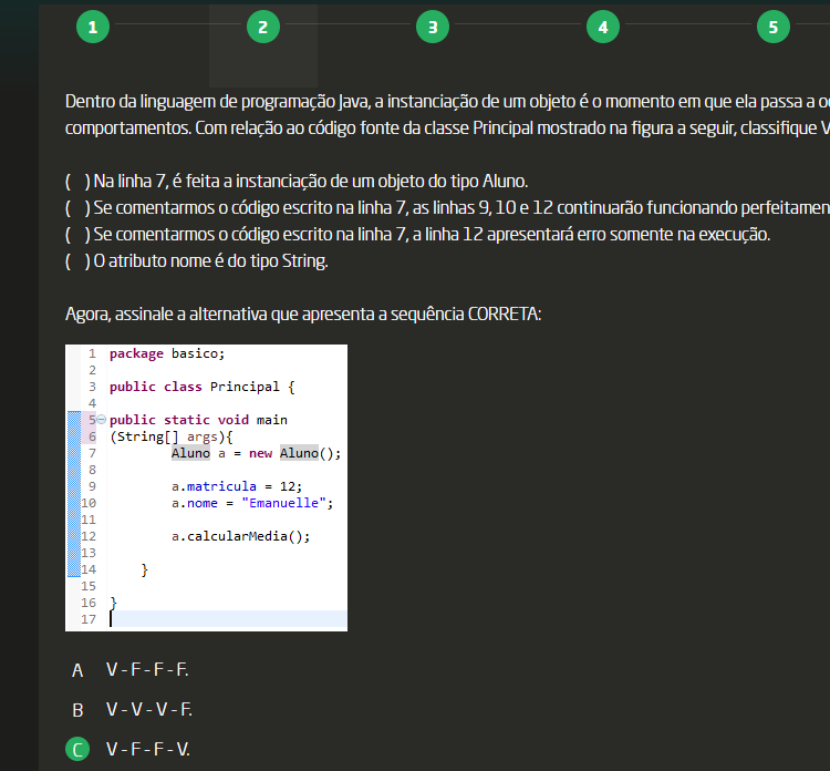 <p>1 2 3 4 Dentro da linguagem de programação Java, a instanciação de um objeto é momento em que comportamentos. Com relação ao código fonte da classe Principal mostrado na figura a seguir, ( ) Na linha 7, é feita a instanciação de um objeto do tipo Aluno. ( ) Se comentarmos código escrito na linha 7, as linhas 9,10 e 12 continuarão funcionando ( ) Se comentarmos código escrito na linha 7, a linha 12 apresentará erro somente na execu atributo nome é do tipo String. Agora, assinale a alternativa que apresenta a CORRETA: 1 package basico; 2 3 public class Principal { 4 public static void main 6 (String[] args){ 7 Aluno a = new Aluno(); 8 9 a.matricula = 12; 10 a. nome = "Emanuelle"; 11 12 a.calcularMedia ; 13 14 } 15 16 17 A B V-V-V-F</p>