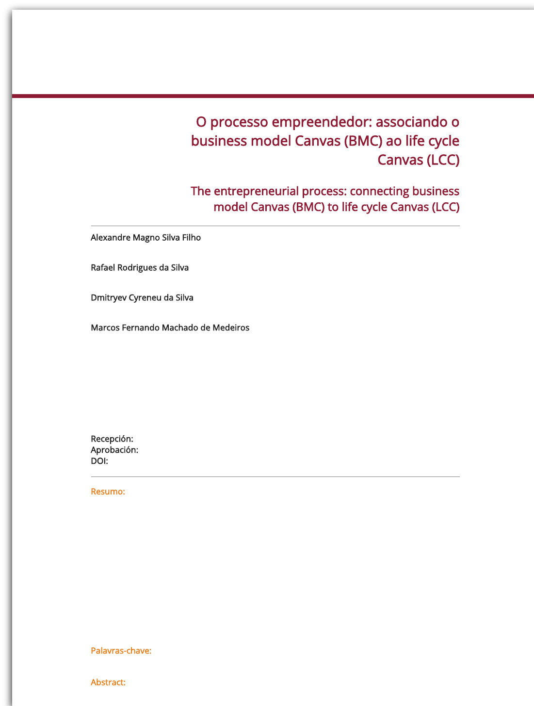 <p>15/5/23, 11:45 O processo empreendedor: associando o business model Canvas (BMC) ao life cycle Canvas (LCC)</p><p>https://www.redalyc.org/journal/810/81058962003/html/ 1/10</p><p>O processo empreendedor: associando o</p><p>business model Canvas (BMC) ao life cycle</p><p>Canvas (LCC)</p><p>The entrepreneurial process: connecting business</p><p>model Canvas (BMC) to life cycle Canvas (LCC)</p><p>Alexandre Magno Silva Filho amagnosf@gmail.com</p><p>Universidade Federal do Rio Grande do Norte, Brasil</p><p>Rafael Rodrigues da Silva rafaelrodges@outlook.com</p><p>Universidade Federal do Rio Grande do Norte, Brasil</p><p>Dmitryev Cyreneu da Silva dmitryev14@gmail.com</p><p>Universidade Federal do Rio Grande do Norte, Brasil</p><p>Marcos Fernando Machado de Medeiros mfmedeiros@gmail.com</p><p>Universidade Federal do Rio Grande do Norte, Brasil</p><p>O processo empreendedor: associando o business model Canvas (BMC) ao life cycle Canvas</p><p>(LCC)</p><p>Exacta, vol. 16, núm. 4, pp. 35-44, 2018</p><p>Universidade Nove de Julho</p><p>Recepción: 12 Octubre 2017</p><p>Aprobación: 28 Noviembre 2017</p><p>DOI: https://doi.org/10.5585/Exacta.v16n4.7991</p><p>Resumo:</p><p>O processo empreendedor envolve desde a concepção de uma ideia até a implementação e gestão do</p><p>novo negócio. Entre as ferramentas utilizadas nesse processo pode-se destacar o Business Model</p><p>Canvas (BMC), um quadro de modelo de negócio que contempla as principais áreas que devem ser</p><p>pensadas. Esta ferramenta baseada na filosofia de gestão visual é amplamente conhecida e a</p><p>literatura indica que seu uso demonstra contribui para eficiência no processo empreendedor. Desse</p><p>modo, este artigo teórico propõe uma associação do BMC com a gestão de projetos por meio do Life</p><p>Cycle Canvas (LCC). A ideia central é mostrar como estas duas ferramentas podem ser associadas,</p><p>uma em complementaridade à outra, para promover melhores resultados para o negócio, uma vez</p><p>que a implementação dos projetos originados no BMC pode ser um fator crítico de sucesso para o</p><p>negócio. Essa associação mostrou que há complementaridade entre as duas ferramentas, ficando o</p><p>BMC responsável pela fase inicial do processo empreendedor, enquanto o LCC atende à fase final, de</p><p>gestão dos projetos que levam ao sucesso do negócio.</p><p>Palavras-chave:</p><p>Processo empreendedor, Business Model Canvas, Life Cycle Canvas.</p><p>Abstract:</p><p>https://doi.org/10.5585/Exacta.v16n4.7991</p><p>15/5/23, 11:45 O processo empreendedor: associando o business model Canvas (BMC) ao life cycle Canvas (LCC)</p><p>https://www.redalyc.org/journal/810/81058962003/html/ 2/10</p><p>The entrepreneurial process involves from the conception of an idea to the implementation and</p><p>management of the new business. Among the tools used in this process can be highlighted the</p><p>Business Model Canvas (BMC), a framework of business model that contemplates the main areas that</p><p>must be thought. This tool based on the philosophy of visual management is widely known and the</p><p>literature indicates that its use demonstrates contributes to efficiency in the entrepreneurial process.</p><p>Thus, this theoretical article proposes an association of the BMC with the management of projects</p><p>through the Life Cycle Canvas (LCC). The central idea is to show how these two tools can be associated,</p><p>one in complementarity to the other, to promote better results for the business, since the</p><p>implementation of the projects originated in BMC can be a critical success factor for the business. This</p><p>association showed that here is complementarity between the two tools, leaving the BMC responsible</p><p>for the initial phase of the entrepreneurial process, while the LCC attends the final phase of project</p><p>management that leads to the success of the business.</p><p>Keywords:</p><p>Entrepreneurial process, Business Model Canvas, Life Cycle Canvas.</p><p>1 Introdução</p><p>O cenário atual é caracterizado pelo dinamismo, fruto dos avanços tecnológicos, e pela</p><p>competitividade (Dornelas, 2011). Logo, vincular a concepção de um negócio à gestão de</p><p>projetos passou a ser um diferencial para empreendedores e organizações que precisam</p><p>efetivar as estratégias planejadas para que o negócio tenha sucesso (Hrebiniak, 2006;</p><p>Jamieson & Morris, 2007; Kwak & Anbari, 2009).</p><p>Dessa forma, as novas ferramentas baseadas em quadros visuais, ou canvas, foram criadas</p><p>com o intuito de auxiliar a concepção do negócio bem como sua gestão, simplificando-a</p><p>(Osterwalder & Pigneur, 2011; Finocchio, 2013; Veras, 2014; Veras, 2016). Neste contexto,</p><p>pode-se destacar o Business Model Canvas (BMC) (Osterwalder & Pigneur, 2011), voltado para</p><p>o processo de concepção da ideia ou do negócio, o Project Model Canvas (PMC) (Finocchio,</p><p>2013) e o Life Cycle Canvas (LCC) (Veras, 2016), ambos aplicados ao gerenciamento de</p><p>projetos e aderentes ao Guia PMBOK (Project Management Institute [PMI], 2013).</p><p>Essas ferramentas baseadas em quadros visuais (canvas) têm proporcionado vantagens</p><p>para quem os usa, tais como: agilidade para lançamento de estratégias; permite</p><p>interatividade entre as diversas áreas; permite uma visão holística; melhora a comunicação e</p><p>a produtividade; contribui para a gestão dos projetos e envolvimento da equipe; e exige</p><p>objetividade e informações relevantes (Nagamatsu, Barbosa & Rebecchi, 2014; Glória &</p><p>Gonçalves, 2016). Assim como o uso conjunto de dois ou mais modelos ou ferramentas em</p><p>canvas (em complementaridade) também é sugerido pela literatura (Finocchio, 2013;</p><p>Zandoval Bonazzi & Ari Zilber, 2014; Veras, 2014).</p><p>Dessa maneira, considerando que “negócios bem-sucedidos, de melhor desempenho,</p><p>quase sempre dependem de boas estratégias e bons projetos” (Veras, 