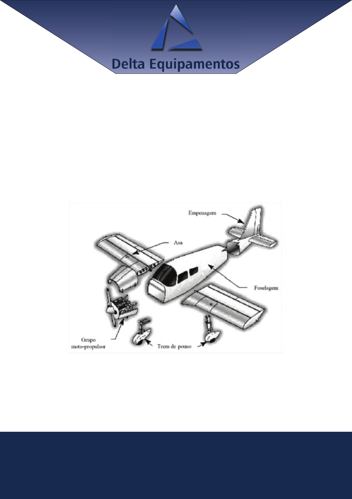 <p>Rua Presidente Coutinho, 69 - Conjunto 01 - Sala 03 - Florianópolis/SC, 88.015-230</p><p>Fone: (48) 3025-4872 / Fax: (48) 3028-4872 / Celular: (48) 9968-5229</p><p>E-mail: administrativo@deltaequipamentos.com.br</p><p>www.deltaequipamentos.com.br</p><p>Definição de Avião</p><p>Um avião é definido como uma aeronave de asa fixa mais pesada que o ar, movida por propulsão mecânica, que</p><p>é mantido em condição de vôo devido à reação dinâmica do ar que escoa através de suas asas.</p><p>Os aviões são projetados para uma grande variedade de propostas, porém todos eles possuem os mesmos</p><p>componentes principais.</p><p>As características operacionais e as dimensões são determinadas pelos objetivos desejados pelo projeto.</p><p>Componentes Básicos de um Avião</p><p>A maioria das estruturas dos aviões possuem uma fuselagem, asas, uma empenagem, trem de pouso e o grupo</p><p>moto-propulsor.</p><p>Estrutura da Fuselagem</p><p>A fuselagem inclui a cabine de comandos, que contém os assentos para seus ocupantes e os controles de vôo da</p><p>aeronave, também possui o compartimento de carga e os vínculos de fixação para outros componentes principais do</p><p>avião.</p><p>Estrutura treliçada: A estrutura em forma de treliça para a fuselagem é utilizada em algumas aeronaves. A</p><p>resistência e a rigidez desse tipo de estrutura é obtida através da junção das barras em uma série de modelos</p><p>triangulares.</p><p>Estrutura monocoque: Na estrutura monocoque o formato aerodinâmico é dado pelas cavernas. As cargas</p><p>atuantes em vôo são suportadas por essas cavernas e também pelo revestimento. Por esse motivo este tipo de</p><p>fuselagem deve ser revestida por um material resistente aos esforços atuantes durante o vôo.</p><p>AERONAVES E SUAS PARTES</p><p>Rua Presidente Coutinho, 69 - Conjunto 01 - Sala 03 - Florianópolis/SC, 88.015-230</p><p>Fone: (48) 3025-4872 / Fax: (48) 3028-4872 / Celular: (48) 9968-5229</p><p>E-mail: administrativo@deltaequipamentos.com.br</p><p>www.deltaequipamentos.com.br</p><p>02</p><p>Estrutura semi-monocoque: Nesse tipo de estrutura, os esforços são suportados pelas cavernas e/ou</p><p>anteparos, revestimento e longarinas.</p><p>Asas – Definição</p><p>As asas são superfícies sustentadoras unidas a cada lado da fuselagem e representam os componentes</p><p>fundamentais que suportam o avião no vôo.</p><p>Para as asas, existem numerosos projetos, tamanhos e formas usadas pelos vários fabricantes.</p><p>Cada modelo é produzido para atender as necessidades de desempenho previsto para o avião desejado.</p><p>Asas – Fixação e Número</p><p>As asas podem ser classificadas quanto a sua fixação na fuselagem em alta, média ou baixa.</p><p>Aviões com um único par de asas são classificados como monoplanos, quando possuírem dois pares de asas</p><p>são classificados como biplanos.</p><p>Estrutura das Asas</p><p>Para o caso de uma estrutura coberta com tela os</p><p>principais elementos estruturais de uma asa são as nervuras, a</p><p>longarina, o bordo de ataque e o bordo de fuga.</p><p>Nervuras: As nervuras dão a forma aerodinâmica à</p><p>asa e transmitem os esforços do revestimento para a longarina.</p><p>Longarina: A longarina é o principal componente</p><p>estrutural da asa, uma vez que é dimensionada para suportar</p><p>os esforços de cisalhamento, flexão e torção oriundos das</p><p>cargas aerodinâmicas atuantes durante o vôo.</p><p>Bordo de ataque e bordo de fuga: O bordo de ataque</p><p>representa a parte dianteira da asa e o bordo de fuga</p><p>representa a parte traseira da asa e serve como berço para o</p><p>alojamento dos ailerons e dos flapes.</p><p>Rua Presidente Coutinho, 69 - Conjunto 01 - Sala 03 - Florianópolis/SC, 88.015-230</p><p>Fone: (48) 3025-4872 / Fax: (48) 3028-4872 / Celular: (48) 9968-5229</p><p>E-mail: administrativo@deltaequipamentos.com.br</p><p>www.deltaequipamentos.com.br</p><p>03</p><p>Forma Geométrica das Asas</p><p>Asa retangular: é uma asa de baixa eficiência aerodinâmica, ou seja, a relação entre a força de sustentação e a</p><p>força de arrasto (L/D) é menor quando comparada a uma asa trapezoidal ou elíptica, a vantagem da asa retangular é a</p><p>sua maior facilidade de construção e um menor custo de fabricação quando comparada as outras.</p><p>Asa trapezoidal: é uma asa de ótima eficiência aerodinâmica, pois com a redução gradativa da corda entre a</p><p>raiz e a ponta da asa consegue-se uma significativa redução do arrasto induzido. Nesse tipo de asa o processo</p><p>construtivo torna-se um pouco mais complexo uma vez que a corda de cada nervura possui uma dimensão diferente.</p><p>Asa elíptica: representa a asa ideal, pois é a que proporciona a máxima eficiência aerodinâmica, porém é de</p><p>difícil fabricação e mais cara quando comparada às outras formas apresentadas.</p><p>Nomenclatura do Perfil e da Asa</p><p>Extradorso: representa a parte superior do perfil;</p><p>Intradorso: representa a parte inferior do perfil;</p><p>Corda: é a linha reta que une o bordo de ataque ao bordo de fuga do perfil aerodinâmico;</p><p>Envergadura: representa a distância entre a ponta das asas;</p><p>Área da asa: representa toda a área em planta, inclusive a porção compreendida pela fuselagem.</p><p>Empenagem</p><p>A empenagem possui como função principal estabilizar e controlar o</p><p>avião durante o vôo.</p><p>A empenagem é dividida em duas superfícies, a horizontal que contém</p><p>o profundor é responsável pela estabilidade e controle longitudinal da</p><p>aeronave e a vertical que é responsável pela estabilidade e controle</p><p>direcional da aeronave.</p><p>Rua Presidente Coutinho, 69 - Conjunto 01 - Sala 03 - Florianópolis/SC, 88.015-230</p><p>Fone: (48) 3025-4872 / Fax: (48) 3028-4872 / Celular: (48) 9968-5229</p><p>E-mail: administrativo@deltaequipamentos.com.br</p><p>www.deltaequipamentos.com.br</p><p>0