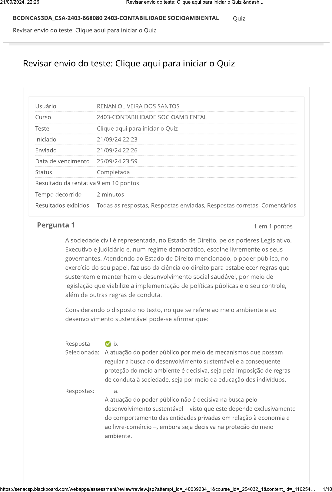 <p>21/09/2024, 22:26 Revisar envio do teste: Clique aqui para iniciar o Quiz &ndash... BCONCAS3DA_CSA-2403-668080 2403-CONTABILIDADE SOCIOAMBIENTAL Quiz Revisar envio do teste: Clique aqui para iniciar o Quiz Revisar envio do teste: Clique aqui para iniciar o Quiz Usuário RENAN OLIVEIRA DOS SANTOS Curso 2403-CONTABILIDADE SOCIOAMBIENTAL Teste Clique aqui para iniciar o Quiz Iniciado 21/09/24 22:23 Enviado 21/09/24 22:26 Data de vencimento 25/09/24 23:59 Status Completada Resultado da tentativa 9 em 10 pontos Tempo decorrido 2 minutos Resultados exibidos Todas as respostas, Respostas enviadas, Respostas corretas, Comentários Pergunta 1 1 em 1 pontos A sociedade civil é representada, no Estado de Direito, pelos poderes Legislativo, Executivo e Judiciário e, num regime democrático, escolhe livremente os seus governantes. Atendendo ao Estado de Direito mencionado, o poder público, no exercício do seu papel, faz uso da ciência do direito para estabelecer regras que sustentem e mantenham o desenvolvimento social saudável, por meio de legislação que viabilize a implementação de políticas públicas e o seu controle, além de outras regras de conduta. Considerando o disposto no texto, no que se refere ao meio ambiente e ao desenvolvimento sustentável pode-se afirmar que: Resposta b. Selecionada: A atuação do poder público por meio de mecanismos que possam regular a busca do desenvolvimento sustentável e a consequente proteção do meio ambiente é decisiva, seja pela imposição de regras de conduta à sociedade, seja por meio da educação dos indivíduos. Respostas: a. A atuação do poder público não é decisiva na busca pelo desenvolvimento sustentável visto que este depende exclusivamente do comportamento das entidades privadas em relação à economia e ao livre-comércio -, embora seja decisiva na proteção do meio ambiente.</p><p>21/09/2024, 22:26 Revisar envio do teste: Clique aqui para iniciar o Quiz &ndash... b. A atuação do poder público por meio de mecanismos que possam regular a busca do desenvolvimento sustentável e a consequente proteção do meio ambiente é decisiva, seja pela imposição de regras de conduta à sociedade, seja por meio da educação dos indivíduos. C. A atuação do poder público por meio de mecanismos que possam regular a busca do desenvolvimento sustentável ou a proteção do meio ambiente é fraca, pois nem mesmo pela imposição de regras de conduta à sociedade ele consegue influenciar os indivíduos, justamente pela falta de educação ambiental. d. A atuação do poder público não interfere em questões econômicas como as de desenvolvimento sustentável, pois sua função é promover o desenvolvimento social, garantindo a segurança pública e a proteção ao meio ambiente, por meio de regras de conduta, e a educação, por meio de programas de bolsas. e. A atuação do poder público por meio de mecanismos que possam regular a busca do desenvolvimento sustentável e a consequente proteção do meio ambiente não é decisiva, pois depende da atuação de organismos internacionais, como a ONU, para impor regras de conduta às economias dos países subdesenvolvidos. Comentário O texto enfatiza papel do poder público, viabilizado pelo Estado de da resposta: Direito, na implementação e no controle das políticas públicas e legislações e na imposição de regras de conduta com o objetivo de promover o desenvolvimento social saudável. Este implica, necessariamente, em desenvolvimento econômico sustentável, preservação do meio ambiente e educação. Portanto, a atuação do poder público é decisiva tanto no que se refere à imposição de regras que objetivem promover o desenvolvimento social saudável quanto no que se refere à educação dos indivíduos. Pergunta 2 1 em 1 pontos A Contabilidade Social, também denominada Contabilidade Socioambiental ou ainda Balanço Social e Ambiental ou Contabilidade Social e Ambiental, é um ramo da Ciência Contábil que tem por objetivo produzir informações sobre os impactos sociais e ambientais resultantes da atuação das empresas e seus reflexos no patrimônio. Tais informações são divulgadas sob a forma de demonstrações contábeis ou financeiras, notas explicativas ou relatórios ambientais, como o Balanço Social, por exemplo. No entanto, a única demonstração contábil de caráter socioambiental exigida para as sociedades anônimas de capital aberto pela Lei n° 6.404/76, ajustada pela Lei n° 11.638/07, é: Resposta b. Demonstração do Valor Adicionado. Selecionada: Respostas: Demonstração dos Fluxos de Caixa Ambientais. a. b. Demonstração do Valor Adicionado.</p><p>21/09/2024, 22:26 Revisar envio do teste: Clique aqui para iniciar o Quiz &ndash... C. Demonstração das Mutações do Patrimônio Ambiental. d. Balanço Social. Demonstração do Resultado Ambiental Abrangente. e. Comentário da A obrigatoriedade de elaboração da DVA pelas companhias resposta: abertas foi instituída pelo artigo 176 da Lei n° 6.404/76. Pergunta 3 1 em 1 pontos Se consultarmos mais de um dicionário da língua portuguesa para compreensão do vocábulo "responsabilidade", obteremos definições que convergem para o entendimento de obrigação para com alguém, alguma coisa ou alguma causa ou, ainda, o dever de arcar com as consequências das próprias ações ou de outras pessoas. A palavra "social", por outro lado, vem de sociedade, ou seja, resultante da sociedade ou da relação entre os indivíduos que a constituem. Assim, podemos concluir que: I. Responsabilidade social ou socioambiental, no âmbito do indivíduo, é a obrigação que a sociedade tem para com indivíduo, arcando coletivamente com as consequências de suas ações, no que se refere ao seu relacionamento com os demais membros dessa sociedade. II. Responsabilidade social ou socioambiental, no âmbito do indivíduo, é a obrigação que este tem para com a sociedade em que está inserido, arcando com as c