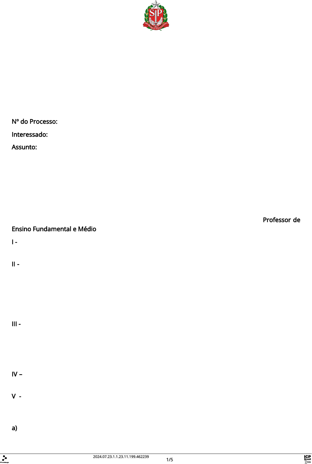 <p>DIÁRIO OFICIAL DO ESTADO DE SÃO PAULO</p><p>Publicado na Edição de 24 de julho de 2024 | Caderno Executivo | Seção Atos Normativos</p><p>COMUNICADO CONJUNTO CGRH-SEDUC/DPME-SGGD,</p><p>001/2024, de 23-07-2024</p><p>Nº do Processo: 015.00020717/2023-02</p><p>Interessado: Coordenadoria de Gestão de Recursos Humanos</p><p>Assunto: Concurso para provimento de cargo de professor de Ensino Fundamental e Médio do</p><p>Estado de São Paulo</p><p>O Coordenador da Coordenadoria de Gestão de Recursos Humanos – CGRH-substituto, da</p><p>Secretaria de Estado da Educação, e o Departamento de Perícias Médicas do Estado - DPME, da</p><p>Secretaria de Gestão e Governo Digital, à vista da Resolução SPG nº 18, de 27 de abril de 2015,</p><p>publicada no DOE de 29-4-2015 e do Edital SE nº 01/2023, publicado em DOE 11/05/2023,</p><p>disciplinador do Concurso Público para provimento, em caráter efetivo, de cargo de Professor de</p><p>Ensino Fundamental e Médio, comunicam:</p><p>I - Ser requisito para posse, nos termos do artigo 47, VI, da Lei nº 10.261, de 28 de outubro de 1968:</p><p>gozar de boa saúde, comprovada em inspeção realizada em órgão médico oficial;</p><p>II - A avaliação médica oficial tem por objetivo efetuar prognóstico laborativo do candidato, o qual</p><p>deve considerar todo o tempo de permanência previsto no serviço público. Destarte, não basta</p><p>estar capaz no momento do exame pericial, sendo necessário considerar, com base na experiência</p><p>clínica e pericial, que as patologias eventualmente diagnosticadas, incipientes ou compensadas,</p><p>não venham a agravar-se nem predispor a outras situações que provoquem permanência precária</p><p>no trabalho, com licenciamentos frequentes e aposentadorias precoces;</p><p>III - Os candidatos nomeados deverão providenciar os exames necessários e realizar perícia médica</p><p>para obtenção do Certificado de Sanidade e Capacidade Física - Laudo médico,</p><p>independentemente do Tempo de Serviço e de serem titulares de cargo ou admitidos no Quadro</p><p>de Pessoal da Secretaria de Estado da Educação. De acordo com a Lei Complementar Nº 1.123, de</p><p>02/07/2010, nenhum candidato está isento de se submeter à perícia médica oficial.</p><p>IV – Para a realização da avaliação médica, o candidato nomeado deverá se apresentar munido de</p><p>documento de identidade oficial com fotografia recente.</p><p>V - Conforme consta no Edital de Abertura de Inscrições, todos os candidatos, inclusive os</p><p>declarados pessoas com deficiência e integrantes da Lista Especial, deverão apresentar, no dia e</p><p>hora marcados para avaliação médica oficial, os seguintes exames médicos recentes:</p><p>a) Hemograma Completo - validade: 06 meses;</p><p>Este documento pode ser verificado pelo código 2024.07.23.1.1.23.11.199.462239</p><p>em https://www.doe.sp.gov.br/autenticidade 1/5</p><p>Documento assinado digitalmente conforme MP nº 2.200-2/2001,</p><p>que institui a Infraestrutura de Chaves Públicas (ICP-Brasil).</p><p>b) Glicemia de Jejum - validade: 06 meses;</p><p>c) PSA Prostático - para homens acima de 40 anos de idade - validade: 12 meses;</p><p>d) TGO, TGP e Gama GT - validade: 06 meses;</p><p>e) Ureia e Creatinina- validade: 06 meses;</p><p>f) Eletrocardiograma (ECG), com laudo (candidatos acima de 40 anos) - validade: 06 meses;</p><p>g) Raio X de Tórax, com Laudo - validade: 06 meses;</p><p>h) Laringoscopia indireta ou videolaringoscopia – validade: 06 meses;</p><p>i) Audiometria Vocal e Tonal – validade: 06 meses;</p><p>VI – O candidato impossibilitado de realizar qualquer dos exames previstos nos itens de “a” a “i”</p><p>deverá apresentar comprovação por meio de documento médico.</p><p>VII - Os exames laboratoriais e complementares serão realizados a expensas dos candidatos e</p><p>servirão como elementos subsidiários à inspeção médica para fins de ingresso para a constatação</p><p>de inexistência de patologias não alcançáveis por mero exame clínico e poderão, a critério médico,</p><p>integrar o prontuário do candidato junto ao DPME.</p><p>VIII - O candidato que não apresentar todos os exames exigidos no item V, não será submetido à</p><p>perícia médica.</p><p>a) O candidato deverá apresentar-se com óculos ou lentes corretivas, caso faça uso desses.</p><p>a.1) O candidato que faça uso de óculos ou lentes corretivas deverá apresentar na perícia médica a</p><p>prescrição ("receita médica") com validade de 12 meses, emitida pelo Médico Oftalmologista</p><p>assistente.</p><p>IX – O candidato terá o prazo de 10 (dez) dias, a contar da data da publicação do Ato de Nomeação,</p><p>para solicitar o agendamento da perícia médica, por meio do sistema eletrônico a ser</p><p>disponibilizado pelo DPME, devendo para tanto:</p><p>a) Digitalizar os laudos dos exames obrigatórios previstos no item V deste Comunicado – o arquivo</p><p>deve ser salvo nas extensões .jpg ou .pdf, com tamanho máximo de 250 kbytes e nomeados com</p><p>no máximo 40 posições, sem caracteres especiais ou acentuação; Obs: a nomeação dos</p><p>documentos deve ser iniciada com o CPF do servidor.</p><p>b) Digitalizar a foto 3x4 – o arquivo deve ser salvo obrigatoriamente na extensão .jpg, com tamanho</p><p>máximo de 250 kbytes, sem caracteres especiais ou acentuação; Obs: a nomeação da foto deve ser</p><p>iniciada com o CPF do servidor.</p><p>c) Acessar o sistema informatizado do DPME, por meio do sítio - https://esisla.sp.gov.br/eSisla - e</p><p>selecionar a guia "Ingressante";</p><p>d) Digitar o número do CPF e clicar em "Criar Senha";</p><p>e) Aceitar o Termo de Responsabilidade (criar senha) e clicar em Enviar e OK!</p><p>f) Ao acessar o sistema, com CPF e Senha, o servidor deve ler as observações da tela inicial para dar</p><p>início ao processo clicando na opção "Anexar";</p><p>g) Anexar ao sistema informatizado do DPME