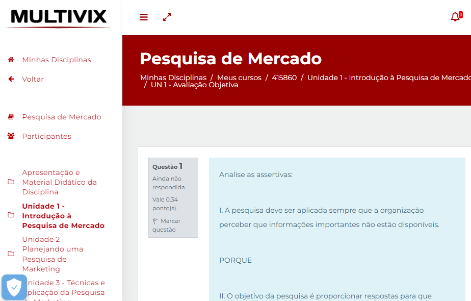 <p>MULTIVIX Minhas Disciplinas Pesquisa de Mercado Voltar Minhas Disciplinas / Meus cursos / 415860 / Unidade 1 - Introdução à Pesquisa de Mercado / UN 1 - Avaliação Objetiva Pesquisa de Mercado Participantes Questão 1 Apresentação e Analise as Ainda não Material Didático da respondida Disciplina Vale 0.34 Unidade 1 - I. A pesquisa deve ser aplicada sempre que a organização Introdução à P Marcar Pesquisa de Mercado perceber que informações importantes não estão disponíveis. questão Unidade 2 - Planejando uma Pesquisa de PORQUE Marketing nidade 3 - Técnicas e plicação da Pesquisa II. objetivo da pesquisa é proporcionar respostas para que</p>