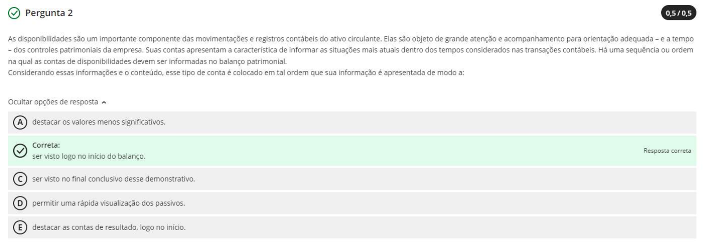 <p>Pergunta 2 0,5/0,5 As disponibilidades são um importante componente das movimentações e registros contábeis do ativo circulante. Elas são objeto de grande atenção e acompanhamento para orientação adequada - e a tempo - dos controles patrimoniais da empresa. Suas contas apresentam a característica de informar as situações mais atuais dentro dos tempos considerados nas transações Há uma sequência ou ordem na qual as contas de disponibilidades devem ser informadas no balanço patrimonial. Considerando essas informações e o conteúdo, esse tipo de conta é colocado em tal ordem que sua informação é apresentada de modo a: Ocultar opções de resposta ^ A destacar os valores menos significativos. Correta: Resposta correta ser visto logo no início do balanço. ser visto no final conclusivo desse demonstrativo. D permitir uma rápida visualização dos passivos. E destacar as contas de resultado, logo no início.</p>