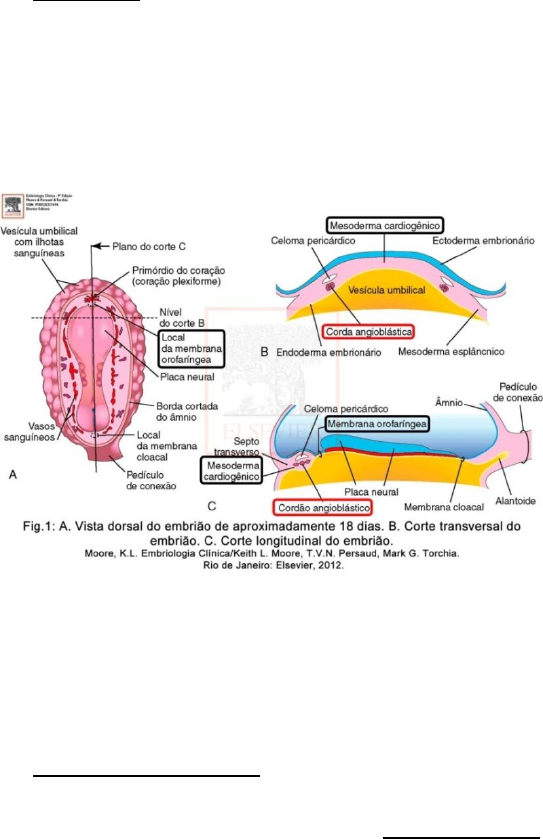 <p>Embriologia do Sistema Cardiovascular</p><p>O sistema cardiovascular é o primeiro a funcionar no embrião devido à necessidade de um método</p><p>eficiente de captação de oxigênio e nutrientes. O coração primitivo e o sistema vascular aparecem em</p><p>meados da terceira semana do desenvolvimento. O coração começa a bater entre o 22º dia e no 24º e</p><p>25º há a circulação do sangue.</p><p>1. Células precursoras cardíacas, origem, migração e especificação</p><p>Ao final da segunda semana de desenvolvimento o embrião é um disco bilaminar (epiblasto e</p><p>hipoblasto). Por volta do 15º dia ocorre o aparecimento da linha primitiva na região central e inferior</p><p>do embrião, por onde as células do epiblasto vão migrar e se colocar entre as células do hipoblasto</p><p>empurrando-as para formar o endoderma.</p><p>Mesoderma: o mesoderma intra-embrionário da origem a diversas estruturas segundo a sua</p><p>localização. O processo notocordal dá origem à notocorda, o mesoderma paraxial dá origem ao</p><p>mesoderma da cabeça e aos somitos, e o mesoderma da placa lateral dá origem ao mesoderma</p><p>cardiogênico.</p><p>O mesoderma da placa lateral se divide em mesoderma somático (superior) e mesoderma esplâcnico</p><p>(inferior).</p><p>A) Vista dorsal de um embrião com 18 dias</p><p>B)Mostrando os cordões angioblásticos no mesoderma cardiogênico</p><p>C) Relação dos cordões angioblásticos com a membrana bucofaríngea</p><p>Mesoderma cardiogênico: As células que vão formar o sistema cardiovascular (progenitoras</p><p>cardíacas) migram através da linha primitiva em direção a região superior (cefálica) do embrião e são</p><p>as primeiras células a migrarem, formam a meia-lua cardíaca* (área cardíaca primária). A partir do</p><p>endoderma e da mesoderma esplâncnica (esplancnopleura) surgem dois tubos endocárdicos. E a partir</p><p>do mesoderma paraxial, surgem as aortas dorsais esquerda e direita. O dobramento ventro-lateral traz</p><p>os tubos endocárdicos para a linha mediana ventral, onde estes irão se fundir, formando o tubo</p><p>endocárdico primitivo. E o dobramento céfalo-caudal irá posicionar a tuba posteriormente a</p><p>membrana bucofaríngea.</p><p>* A primeira indicação morfológica da futura região cardíaca é a cavidade pericárdica, em</p><p>forma de ferradura (também chamada de meia-lua cardíaca), que se desenvolve ventralmente ao</p><p>intestino anterior e à placa precordal.</p><p>2. Dobramento do embrião e formação do tubo cardíaco. Localização final do tórax (dobramento</p><p>caudal e lateral do embrião)</p><p>Os cordões angioblásticos, partem de cordões endoteliais, localizados no mesoderma</p><p>cardiogênico, na 3ª semana de desenvolvimento se canalizam para formar os tubos cardíacos, os quais</p><p>se fundem no final da 3ª semana para formar o coração tubular primitivo. Uma influência indutora do</p><p>endoderma anterior estimula o início da formação do coração. A morfogênese cardíaca é controlada</p><p>por uma cascata de genes reguladores e fatores de transcrição. Se a fusão das duas estruturas falhar,</p><p>duas estruturas semelhantes a um tubo se formam ao invés de uma, levando ao coração bífido.</p><p>À medida que o embrião se dobra lateralmente, os tubos cardíacos se aproximam e se fusionam</p><p>formando um tubo único. A fusão dos tubos cardíacos começa na porção cranial e se continua</p><p>caudalmente. O dobramento lateral une os tubos endocardiais e um dobramento cranial traz o tubo</p><p>cardíaco para a região torácica.</p><p>O miocárdio primitivo é formado do mesoderma esplânico que circunda o celoma pericárdio.</p><p>Nesse estágio, o coração em desenvolvimento é composto por um delgado tubo endotelial separado</p><p>de um espesso tubo muscular (o miocárdio primitivo) por um tecido gelatinoso, a geléia cardíaca. O</p><p>tubo endotelial se torna o revestimento endotelial do coração, o endocárdio, e o miocárdio primitivo</p><p>torna-se a parede muscular do coração, o miocárdio.</p><p>O epicárdio é derivado de células mesoteliais que se originam da superfície externa do seio</p><p>venoso. Quando ocorre o dobramento da região cefálica, o coração e a cavidade pericárdica passam a</p><p>se localizar ventralmente ao intestino anterior e cauldamente à membrana bucofaríngea.</p><p>Concomitantemente, o coração tubular se alonga e desenvolve dilatações e constrições alternadas: o</p><p>bulbo cardíaco (composto pelo tronco arterial, o cone arterial e o cone cordial), ventrículo, átrio e seio</p><p>venoso.</p><p>Dois processos contribuem para a localização final do coração no tórax:</p><p>1) Concomitante desenvolvimento do sistema nervoso e seu avanço em direção rostral</p><p>2) Fechamento longitudinal do embrião</p><p>A prega cefálica progressivamente transloca os tubos endocárdicos para a região torácica.</p><p>3. Composição, regionalização do tubo cardíaco, dobramento do tubo e defeitos congênitos</p><p>associados.</p><p>Tubo cardíaco:</p><p>- Endocárdio: revestimento interno</p><p>- Miocárdio: massa de progenitores cardiomiocíticos que revestem os tubos endocárdicos fusionados</p><p>(músculo cardíaco)</p><p>- Geleia cardíaca: camada espessa de MEC, depositada pelo miocárdio em desenvolvimento</p><p>- Epicárdio: camada mais externa- de onde se forma as artérias coronárias</p><p>Remodelação do tubo cardíaco:</p><p>Processo morfogênico complexo: bomba peristáltica formada por um único tubo e se</p><p>transforma em uma bomba de 4 câmaras, dois canais, valvas uni-direcionais, batendo</p><p>sincronizadamente</p><p>Aos 23 dias, o tubo cardíaco começa a se alongar e encurvar, dobrando-se para a esquerda.</p><p>Uma curvatura em forma de C é a primeira evidência morfológica da assimetria embrionária. O</p><p>dobramento ocorre principalmente na junção do bulbo cordis e ventrícu