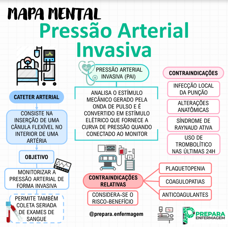 <p>MAPA MENTAL Pressão Arterial Invasiva PRESSÃO ARTERIAL CONTRAINDICAÇÕES INVASIVA (PAI) INFECÇÃO LOCAL ANALISA 0 ESTÍMULO DA PUNÇÃO CATETER ARTERIAL MECÂNICO GERADO PELA ONDA DE PULSO E É ALTERAÇÕES ANATÔMICAS CONSISTE NA CONVERTIDO EM ESTÍMULO INSERÇÃO DE UMA ELÉTRICO QUE FORNECE A SÍNDROME DE CÂNULA FLEXÍVEL NO CURVA DE PRESSÃO QUANDO RAYNAUD ATIVA INTERIOR DE UMA CONECTADO AO MONITOR ARTÉRIA USO DE TROMBOLÍTICO NAS ÚLTIMAS 24H OBJETIVO PLAQUETOPENIA MONITORIZAR A PRESSÃO ARTERIAL DE CONTRAINDICAÇÕES COAGULOPATIAS FORMA INVASIVA RELATIVAS CONSIDERA-SE 0 ANTICOAGULANTES PERMITE TAMBÉM RISCO-BENEFÍCIO COLETA SERIADA DE EXAMES DE @prepara.enfermagem PREPARA SANGUE ENFERMAGEM</p>