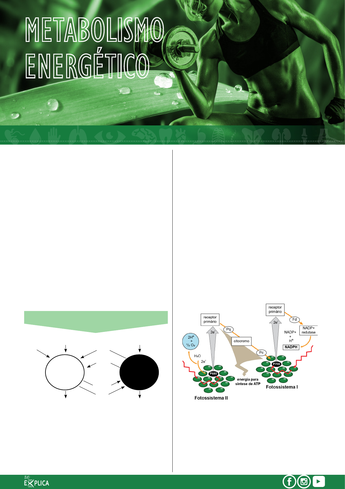 M E T A B O L I S M O E N E R G É T I C O Prof. Kennedy Ramos Deixa que a gente explica! www.bioexplica.com.br ASSINE JÁ! É p ro ib id a a re pr od uç ão , t ot al o u pa rc ia l, de st e m at er ia l UNIDADE 02: Fase Clara e Fase Escura Introdução A fotossíntese ocorre em duas grandes etapas, que envolvem várias reações químicas: a primeira é a fase clara (também chamada de fotoquímica) e a segunda é a fase escura (também conhecida como fase química). Em linhas gerais, os eventos principais da fo- tossíntese são: ■ FASE CLARA: A absorção da energia da luz pela clorofila. ■ FASE ESCURA: A redução de um aceptor in- termediário de elétrons chamado NADP, que passa a NADPH; a formação de ATP e a sínte- se de glicose. A fase escura da fotossíntese não precisa ocorrer no escuro. O que o nome quer indicar é que ela ocorre mesmo na ausência de luz – ela só precisa de ATP e NADPH2 para ocor- rer. Exemplificando, teremos... LUZ H2O CO2 ATP ADP Etapa Clara (Fotoquímica) Etapa Escura (Química) NADP NADPH + H+ Matéria OrgânicaO2 Fase Clara ou Fotoquímica: Quebra da água e liberação de oxigênio Esta fase ocorre na membrana dos tilacóides e dela participam um complexo de pigmentos exis- tente nos grana, aceptores de elétrons, moléculas de água e a luz. Como resultado desta fase temos a produção de oxigênio, ATP (a partir de ADP + Pi) e também a formação de uma substância chama- da NADPH2;. Tanto o ATP quanto o NADPH2; serão utilizadas na fase escura. Na fase clara, a luz penetra nos cloroplastos e atinge o complexo de pigmentos, ao mesmo tempo em que provoca alterações nas moléculas de água. De que maneira essa ação da luz resulta em pro- dutos que podem ser utilizadas na segunda fase da fotossíntese?. Um dos acontecimentos marcantes da fase clara são as chamadas fotofosforilações cíclica e acíclica. Na fotofosforilação cíclica, a molécula de cloro- fila ao ser atingida pela luz do Sol libera elétrons. Esses elétrons são recolhidos por determinadas moléculas orgânicas chamadas aceptores de elé- trons, que os enviam a uma cadeia de citocromos (substâncias associadas ao sistema fotossinteti- zante e que são assim chamadas por possuírem cor). Daí, os elétrons retornam à clorofila. Dos produtos da fotólise da água, os elétrons vão ocupar os "vazios" deixados pela perda de elétrons pela clorofila b. Os prótons H+, juntamen- te com os elétrons perdidos pela clorofila a, irão transformar o NADP (nicotinamida-adenina-dinu- cleotídeo fosfato) em NADPH2. Ao mesmo tempo, oxigênio é liberado. Esse é um aspecto importante da fotossíntese: todo o oxigênio gerado no pro- cesso provém da fotólise da água. É p ro ib id a a re pr od uç ão , t ot al o u pa rc ia l, de st e m at er ia l Deixa que a gente explica! www.bioexplica.com.br ASSINE JÁ! H2O Luz 2 H+ + 2e- + 1/2 O2 Os seres fotossintetizantes utilizam a água como fonte de átomos de hidrogênio para a redução do NADP. Esses átomos de hidrogênio são posteriormente empregados na redução do CO2 até carboidrato. Fase Escura ou Química: Produção de Glicose Nessa fase, a energia contida nos ATP e os hidrogênios dos NADPH2, serão utilizados para a construção de moléculas de glicose. A síntese de glicose ocorre durante um complexo ciclo de reações (chamado ciclo das pentoses ou ciclo de Calvin-Benson), do qual participam vários compostos simples. Durante o ciclo, moléculas de CO2 unem-se umas as outras formando cadeias carbônicas que levam à produção de glicose. A energia necessária para o estabelecimento das ligações químicas ricas em energia é proveniente do ATP e os hidrogênio que promoverão a redução dos CO2 são fornecidos pelos NADPH2. ATIVIDADES PROPOSTAS 01. (Ufjf-pism 1) A cada ano, mais de 250 bilhões de toneladas de açúcar são pro- duzidas pela natureza pelos organismos autotróficos. Esse processo de fixação do carbono é denominado fotossíntese. São fei- tas as seguintes afirmativas sobre o proces- so fotossintético: I. Ocorre nos cloroplastos, sendo a clorofila o pigmento que absorve a luz solar na fase fotoquímica. II. As moléculas de NADP + são utilizadas no transporte de hidrogênio. III. O oxigênio liberado provém do gás carbô- nico absorvido na fase química. IV. Na fase química, há fixação do carbono do CO2 podendo produzir amido. V. O ATP será formado na fase escura e por isso o processo fotossintético libera muita energia. Exemplificando, teremos... É p ro ib id a a re pr od uç ão , t ot al o u pa rc ia l, de st e m at er ia l Deixa que a gente explica! www.bioexplica.com.br ASSINE JÁ! III. Nas folhas dos vegetais, existem células portadoras de clorofila, um pigmento esver- deado que é capaz de absorver a energia solar. O processo denominado fotossíntese ocorre nessas células. IV. Parte das substâncias produzidas por uma planta durante a fotossíntese é utilizada pelas próprias células onde ocorreu o pro- cesso e parte é exportada para as demais regiões da planta por meio dos vasos lenho- sos. V. Parte do gás produzido no processo da fo- tossíntese é utilizado pela própria planta em outro processo denominado respiração celu- lar. Assinale a opção correta.: a) Apenas as afirmativas I, III e V são verdadei- ras. b) Apenas as afirmativas II e IV são verdadeiras. c) Apenas as afirmativas I e III são verdadeiras. d) Apenas as afirmativas II, III e IV são verda- deiras. e) Apenas as afirmativas II, IV e V são verda- deiras. 05. (Pucrj) A fotossíntese é um proces- so complexo que ocorre em duas fases: fase luminosa e Ciclo de Calvin. Sobre as duas etapas da fotossíntese, foram feitas as seguintes afirmativas: I. Na fase luminosa, ocorre a conversão da energia solar em energia química. II. Na fase luminosa, ocorre liberação de oxi- gênio, produção de NADPH e consumo de ATP. III. No Ciclo de Calvin, o CO2 atmosférico é incorporado em moléculas orgânicas d