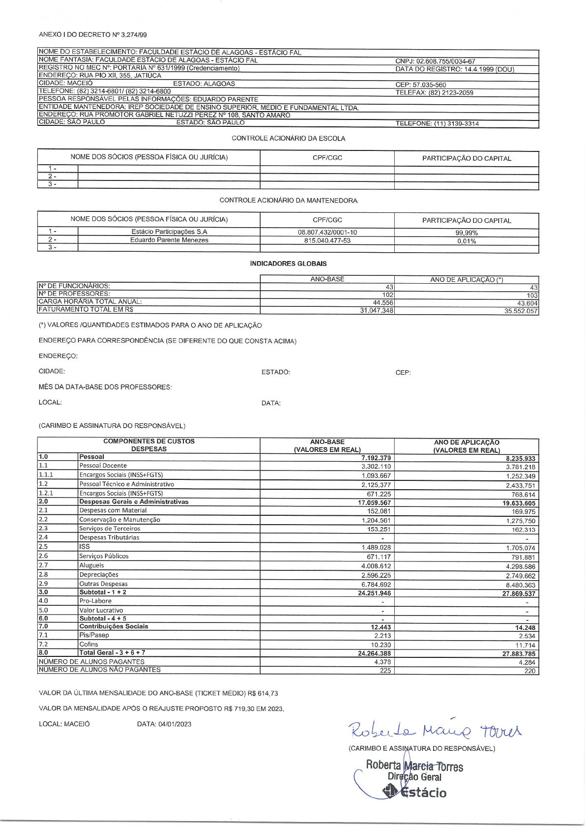 <p>ANEXO I DO DECRETO 3.274/99 NOME DO ESTABELECIMENTO FACULDADE ESTÁCIO DE ALAGOAS - ESTÁCIO FAL NOME FANTASIA: FACULDADE ESTÁCIO DE ALAGOAS - ESTÁCIO FAL CNPJ: 02.608.755/0034-67 REGISTRO NO MEC PORTARIA N° 631/1999 (Credenciamento) DATA DO REGISTRO: 14.4.1999 (DOU) ENDEREÇO: RUA PIO XII, 355, JATIUCA CIDADE: MACEIO ESTADO: ALAGOAS CEP: 57.035-560 TELEFONE: (82) 3214-6801/ (82) 3214-6800 TELEFAX: 2)2123-2059 PESSOA RESPONSÁVEL PELAS INFORMAÇÕES: EDUARDO PARENTE ENTIDADE MANTENEDORA: IREP SOCIEDADE DE ENSINO SUPERIOR, E FUNDAMENTAL LTDA. ENDERECO: RUA PROMOTOR GABRIEL NETUZZI PEREZ 108, SANTO AMARO CIDADE: SÃO PAULO ESTADO: SÃO PAULO TELEFONE: (11) 3139-3314 CONTROLE ACIONÁRIO DA ESCOLA NOME DOS SÓCIOS (PESSOA FÍSICA OU JURÍCIA) CPF/CGC PARTICIPAÇÃO DO CAPITAL 1 2 3 CONTROLE ACIONÁRIO DA MANTENEDORA NOME DOS SÓCIOS (PESSOA FÍSICA OU JURÍCIA) CPF/CGC PARTICIPAÇÃO DO CAPITAL 1 Estácio Participações S.A 08.807.432/0001-10 99,99% 2 Eduardo Parente Menezes 815.040.477-53 0,01% 3 INDICADORES GLOBAIS ANO-BASE ANO DE APLICAÇÃO (*) N° DE FUNCIONÁRIOS: 43 43 N° DE PROFESSORES: 102 103 CARGA HORÁRIA TOTAL ANUAL: 44.556 43.604 FATURAMENTO TOTAL EM R$ 31.047.348 35.552.057 (*) VALORES /QUANTIDADES ESTIMADOS PARA ANO DE APLICAÇÃO ENDEREÇO PARA CORRESPONDÊNCIA (SE DIFERENTE DO QUE CONSTA ACIMA) ENDEREÇO: CIDADE: ESTADO: CEP: MÊS DA DATA-BASE DOS PROFESSORES: LOCAL: DATA: (CARIMBO E ASSINATURA DO RESPONSÁVEL) COMPONENTES DE CUSTOS ANO-BASE ANO DE APLICAÇÃO DESPESAS (VALORES EM REAL) (VALORES EM REAL) 1.0 Pessoal 7.192.379 8.235.933 Pessoal Docente 3.302.110 3.781.218 1.1.1 Encargos Sociais (INSS+FGTS) 1.093.667 1.252.349 1.2 Pessoal Técnico e Administrativo 2,125,377 1.2.1 Encargos Sociais (INSS+FGTS) 671.225 768.614 2.0 Despesas Gerais e Administrativas 17.059.567 19.633.605 2.1 Despesas com Material 152.081 169.975 2.2 Conservação e Manutenção 1.204.561 1,275,750 2.3 Serviços de Terceiros 153.251 2.4 Despesas Tributárias 2.5 ISS 1.489.028 1.705.074 Serviços Públicos 671.117 791.881 2.7 Alugueis 4.008.612 4.298.586 2.8 Depreciações 2.596.225 2.749.662 Outras Despesas 6.784.692 8.480.363 3,0 Subtotal 24.251.946 27.869.537 4.0 Pro-Labore 5.0 Valor Lucrativo - 6.0 Subtotal 4 + 5 - Contribuições Sociais 12.443 14.248 7.1 Pis/Pasep 2.213 2.534 7.2 Cofins 10.230 11.714 8.0 Total Geral 3 + 6 + 7 24.264.388 27.883.785 NÚMERO DE ALUNOS PAGANTES 4.378 4.284 NÚMERO DE ALUNOS NÃO PAGANTES 225 220 VALOR DA ÚLTIMA MENSALIDADE DO ANO-BASE (TICKET MÉDIO) R$ VALOR DA MENSALIDADE APÓS REAJUSTE PROPOSTO EM 2023. LOCAL: DATA: 04/01/2023 (CARIMBO E ASSINATURA DO RESPONSÁVEL) Roberta Marcia Torres Geral Estácio</p>