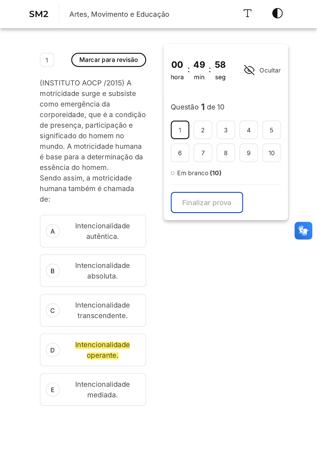 <p>A</p><p>B</p><p>C</p><p>D</p><p>E</p><p>1 Marcar para revisão</p><p>�INSTITUTO AOCP /2015� A</p><p>motricidade surge e subsiste</p><p>como emergência da</p><p>corporeidade, que é a condição</p><p>de presença, participação e</p><p>significado do homem no</p><p>mundo. A motricidade humana</p><p>é base para a determinação da</p><p>essência do homem.</p><p>Sendo assim, a motricidade</p><p>humana também é chamada</p><p>de:</p><p>Intencionalidade</p><p>autêntica.</p><p>Intencionalidade</p><p>absoluta.</p><p>Intencionalidade</p><p>transcendente.</p><p>Intencionalidade</p><p>operante.</p><p>Intencionalidade</p><p>mediada.</p><p>00</p><p>hora</p><p>: 49</p><p>min</p><p>: 58</p><p>seg</p><p>Ocultar</p><p>Questão 1 de 10</p><p>Em branco �10�</p><p>Finalizar prova</p><p>1 2 3 4 5</p><p>6 7 8 9 10</p><p>SM2 Artes, Movimento e Educação</p><p>A</p><p>B</p><p>C</p><p>D</p><p>E</p><p>2 Marcar para revisão</p><p>A partir de uma abordagem</p><p>mais biológica, a Educação</p><p>deverá ter algumas prioridades.</p><p>Marque a alternativa que NÃO</p><p>é uma prioridade da</p><p>abordagem biológica.</p><p>Manutenção da saúde</p><p>corporal</p><p>Atingir o "corpo ideal"</p><p>Melhora do</p><p>condicionamento</p><p>físico</p><p>Desenvolvimento de</p><p>habilidades motoras</p><p>Desenvolvimento de</p><p>capacidades físicas</p><p>3 Marcar para revisão</p><p>Analise as afirmativas abaixo e</p><p>responda:</p><p>I � O profissional de Educação</p><p>Física na sua atuação deverá</p><p>considerar o sujeito como um</p><p>indivíduo biológico, sem</p><p>considerar o contexto</p><p>social com o qual ele se</p><p>relaciona.</p><p>A</p><p>B</p><p>C</p><p>D</p><p>E</p><p>II � As intervenções dos</p><p>profissionais de Educação</p><p>Física deverão ser direcioadas</p><p>de forma que o aluno busque</p><p>um corpo "possível",</p><p>compreendendo o homem em</p><p>sua totalidade.</p><p>III � A divisão do corpo em</p><p>"partes", como se fosse uma</p><p>mercadoria, faz parte de um</p><p>sistema social que reforça o</p><p>corpo como um objeto,</p><p>instigando o consumo de bens</p><p>em busca de um "corpo ideal".</p><p>Somente a I e III estão</p><p>corretas</p><p>Somente a II está</p><p>correta</p><p>Somente a II e III</p><p>estão corretas</p><p>Somente a I está</p><p>correta</p><p>I, II e III estão</p><p>corretas</p><p>4 Marcar para revisão</p><p>�FUNDEPES/2018� Ensinar é</p><p>ajudar o educando, por meio</p><p>dos conteúdos da Educação</p><p>Física, a ser uma pessoa que</p><p>busque sua própria</p><p>emancipação e</p><p>transcendência, não somente</p><p>na aquisição dos</p><p>conhecimentos da aula, mas</p><p>também para além do contexto</p><p>escolar, ou seja, na vida.</p><p>Analise as afirmativas a seguir,</p><p>relativas à Ciência da</p><p>Motricidade Humana.</p><p>I. A Ciência da Motricidade</p><p>Humana compreende os</p><p>fenômenos sociais a partir de</p><p>transformações inaplicáveis ao</p><p>sentido da vida.</p><p>II. A Motricidade Humana trata</p><p>do indivíduo global inserido na</p><p>sociedade, como sujeito /</p><p>agente e crítico, tendo como</p><p>objetivo romper com a antiga e</p><p>tradicional Educação Física,</p><p>que tinha suas aulas atreladas</p><p>ao físico, sem as reflexões /</p><p>compreensões necessárias à</p><p>sua prática.</p><p>III. A motricidade humana é o</p><p>corpo em movimento não</p><p>intencional, inteiro e complexo,</p><p>objetivando mudança de</p><p>hábitos e atitudes, no sentido</p><p>de consolidação de uma</p><p>autêntica práxis que contribua</p><p>para a formação humana.</p><p>Marque a alternativa que</p><p>apresenta a(s) afirmativa(s)</p><p>correta(s).</p><p>A</p><p>B</p><p>C</p><p>D</p><p>E</p><p>Apenas a afirmativa I</p><p>e II estão corretas.</p><p>Apenas a afirmativa II</p><p>está correta.</p><p>Apenas a afirmativa I</p><p>e III estão corretas.</p><p>Apenas as afirmativas</p><p>II e III estão corretas.</p><p>As afirmativas I, II e III</p><p>estão corretas.</p><p>5 Marcar para revisão</p><p>Os jogos, em algumas</p><p>situações, são semelhantes às</p><p>formas que os brincadores se</p><p>exercitam, mas têm regras</p><p>próprias e fixas que devem ser</p><p>seguidas para o seu bom</p><p>andamento. Durante o jogo,</p><p>podemos cooperar ou competir</p><p>com nossos companheiros.</p><p>Marque a alternativa coerente</p><p>às características que o</p><p>professor deve atender na</p><p>elaboração de um jogo com</p><p>características cooperativas:</p><p>�ADAPTADA, LONDRINA/2011�.</p><p>A</p><p>B</p><p>C</p><p>D</p><p>E</p><p>A organização de uma</p><p>equipe deve superar a</p><p>organização das</p><p>outras e poucos se</p><p>tornam bem-</p><p>sucedidos nos jogos.</p><p>Os jogadores devem</p><p>aprender a ter senso</p><p>de unidade, a</p><p>compartilhar o</p><p>sucesso e a pensar no</p><p>jogo para todos.</p><p>Deve-se desenvolver</p><p>a autoconfiança e</p><p>menor produção</p><p>coletiva.</p><p>Estimular o trabalho</p><p>em conjunto para o</p><p>objetivo comum e a</p><p>ajuda de outra pessoa</p><p>deve ocorrer com</p><p>pouca frequência.</p><p>Não esperar pela</p><p>solidariedade entre os</p><p>jogadores e esperar</p><p>pelo erro do colega.</p><p>6 Marcar para revisão</p><p>A psicomotricidade</p><p>desempenha um papel</p><p>A</p><p>B</p><p>C</p><p>fundamental no</p><p>desenvolvimento do indivíduo.</p><p>Sobre a psicomotricidade,</p><p>assinale a alternativa correta.</p><p>A psicomotricidade</p><p>não possui influência</p><p>significativa nos</p><p>aspectos da</p><p>capacidade</p><p>psicomotora,</p><p>motivação, funções</p><p>cognitiva, motora e</p><p>afetiva do indivíduo.</p><p>A psicomotricidade</p><p>está relacionada</p><p>apenas com a</p><p>capacidade</p><p>psicomotora e não</p><p>influencia os aspectos</p><p>da motivação,</p><p>funções cognitiva,</p><p>motora e afetiva.</p><p>A psicomotricidade</p><p>desempenha um</p><p>papel importan