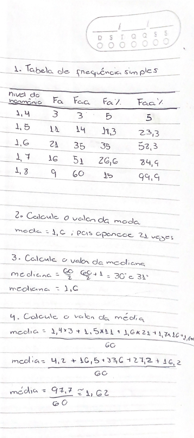 <p>1. Tabela de frequencia simples nivel do Fa Faa Fa% Faa% 1,4 3 3 5 5 1,5 11 14 23,3 21 35 35 58,3 16 51 26,6 84,9 1,8 9 60 15 99,9 2. Calcule valon da moda moda = 1, C PCIS 21 3. Calcule valor da mediana = 60 2 = mediana = 4. Calcule valon da media = 2,4x3 + 1. 5x11 + 4,2 + 16, 2 60 = 97,7 60</p>