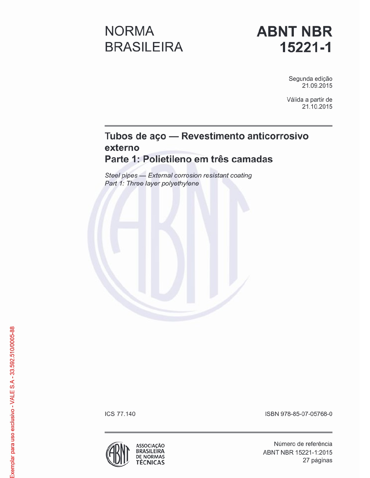 <p>NORMA ABNT NBR BRASILEIRA 15221-1 Segunda edição 21.09.2015 Válida a partir de 21.10.2015 Tubos de aço - Revestimento anticorrosivo externo Parte 1: Polietileno em três camadas Steel pipes - External corrosion resistant coating Part 1: Three layer polyethylene S.A. ICS 77.140 ISBN 978-85-07-05768-0 para ASSOCIAÇÃO Número de referência BRASILEIRA ABNT NBR 15221-1:2015 DE NORMAS TÉCNICAS 27 páginas</p><p>ABNT NBR 15221-1:2015 ABNT 2015 Todos os direitos reservados. A menos que especificado de outro modo, nenhuma parte desta publicação pode ser reproduzida ou utilizada por qualquer meio, eletrônico ou mecânico, incluindo fotocópia e microfilme, sem permissão por S.A. escrito da ABNT. ABNT Av.Treze de Maio, 13 - andar 20031-901 - Rio de Janeiro - RJ Tel.: + 55 21 3974-2300 Fax: + 55 21 3974-2346 abnt@abnt.org.br www.abnt.org.br para</p><p>ABNT NBR 15221-1:2015 Sumário Página Prefácio V 1 Escopo 1 2 Referências normativas 1 3 Termos e definições 3 4 Características técnicas dos materiais de revestimento 5 5 Manuseio 5 5.1 Tubos nus e revestidos 5 5.2 Materiais de revestimento 6 6 Armazenamento 6 6.1 6 6.2 6 6.3 7 7.2 Aplicação Tubos Transporte Transporte Transporte Materiais Estocagem Preparo Limpeza nus da de do ou do dos superfície revestimento revestimento revestidos tubo materiais revestido de revestimento 6 7 7.1 7 7 8 7 8.1 7 8.1.1 7 8.1.2 Preaquecimento 7 8.1.3 Jateamento 8 8.2 Aquecimento do tubo 9 8.3 Aplicação dos materiais de revestimento 9 8.3.1 Aplicação do epóxi em pó 9 8.3.2 Aplicação do adesivo copolimérico 9 8.3.3 Aplicação do polietileno 9 8.4 Resfriamento 10 8.5 Colarinhos 10 9 Requisitos do revestimento 10 9.1 Espessura do revestimento 10 9.2 Propriedades do revestimento 10 10 Inspeção e ensaios 10 10.1 Materiais de revestimento 10 10.2 Inspeção e ensaios durante a produção do revestimento 11 10.2.1 Inspeção visual do revestimento 11 10.2.2 Espessura total do revestimento 11 10.2.3 Descontinuidade do revestimento 11 10.2.4 Aderência 12 10.2.5 Magnetismo residual 12 para 10.2.6 Aderência pull-off 12 11 Reparos no revestimento 13 12 Identificação dos tubos revestidos 13</p><p>ABNT NBR 15221-1:2015 13 Data book de produção 13 Anexo A (normativo) Tabelas 15 Anexo B (normativo) Procedimento de aplicação e plano de inspeção e ensaio 21 B.1 Introdução 21 B.2 Procedimento de aplicação (PA) 21 B.3 Plano de inspeção e ensaio (PIT) 22 Anexo C (normativo) Qualificação 23 C.1 Introdução 23 C.2 Processo de qualificação 23 C.2.1 Matéria-prima 23 C.2.2 Sistema de revestimento 23 C.3 Tabelas 24 Tabelas Tabela A.1 - Requisitos do epóxi em pó 15 Tabela A.2 - Requisitos do adesivo copolimérico 16 Tabela A.3 - Requisitos do polietileno de alta densidade (PEAD) 16 Tabela A.4 - Espessura do revestimento 18 Tabela A.5 - Requisitos do revestimento aplicado 18 Tabela A.6 - Inspeção e ensaios durante a produção do revestimento 19 Tabela C.1 - Requisitos adicionais do epóxi em pó 25 Tabela C.2 - Requisitos adicionais do revestimento aplicado 26 Tabela C.3 - Inspeção e ensaios durante a qualificação do revestimento aplicado 26 para</p><p>ABNT NBR 15221-1:2015 Prefácio A Associação Brasileira de Normas Técnicas (ABNT) é o Foro Nacional de Normalização. As Normas Brasileiras, cujo conteúdo é de responsabilidade dos Comitês Brasileiros (ABNT/CB), dos Organismos de Normalização Setorial (ABNT/ONS) e das Comissões de Estudo Especiais (ABNT/CEE), são elaboradas por Comissões de Estudo (CE), formadas pelas partes interessadas no tema objeto da normalização. Os Documentos Técnicos ABNT são elaborados conforme as regras da Diretiva ABNT, Parte 2. A ABNT chama a atenção para que, apesar de ter sido solicitada manifestação sobre eventuais direitos de patentes durante a Consulta Nacional, estes podem ocorrer e devem ser comunicados à ABNT a qualquer momento (Lei n° 9.279, de 14 de maio de 1996). Ressalta-se que Normas Brasileiras podem ser objeto de citação em Regulamentos Técnicos. Nestes casos, os Órgãos responsáveis pelos Regulamentos Técnicos podem determinar outras datas para exigência dos requisitos desta Norma, independentemente de sua data de entrada em vigor. A ABNT NBR 15221-1 foi elaborada no Comitê Brasileiro de Siderurgia (ABNT/CB-028), pela Comissão de Estudo de Produtos Tubulares de Aço (CE-028:000.006). Projeto circulou em Consulta Nacional conforme Edital n° 07, de 15.07.2015 a 13.09.2015. Esta segunda edição cancela e substitui a edição anterior (ABNT NBR 15221-1:2007), a qual foi tec- nicamente revisada. A ABNT NBR 15221-1, sob o título geral "Tubos de aço Revestimento anticorrosivo externo", tem previsão de conter as seguintes partes: Parte 1: Polietileno em três camadas; Parte 2: Polipropileno em três camadas Parte 3: Epóxi em pó termicamente curado. Escopo em inglês desta Norma Brasileira é o seguinte: Scope This part of the ABNT 15221 establishes the minimum requirements to be followed in applying and S.A. qualifying of three-layer polyethylene coating applied to the external surface of steel pipes preheated for corrosion protection to be used in buried, sheltered or submerged pipelines, under fresh or sea water, operating at temperatures between 40 °C and 80 °C. para</p><p>NORMA BRASILEIRA ABNT NBR 15221-1:2015 Tubos de aço - Revestimento anticorrosivo externo Parte 1: Polietileno em três camadas 1 Escopo 1.1 Esta parte da ABNT NBR 15221 estabelece os requisitos mínimos a serem seguidos na aplicação e qualificação de revestimentos em tripla camada com polietileno, aplicados à superfície externa de tubos de aço previamente aquecidos, para proteção anticorrosiva e destinados a tubulações e dutos de aço enterrados, abrigados ou submersos, em água doce ou salgada, operando em temperaturas entre - 40 °C e 80 °C. NOTA sistema de revestimento em tripla camada com polietileno é composto por uma primeira camada em epóxi em pó termicamente cur