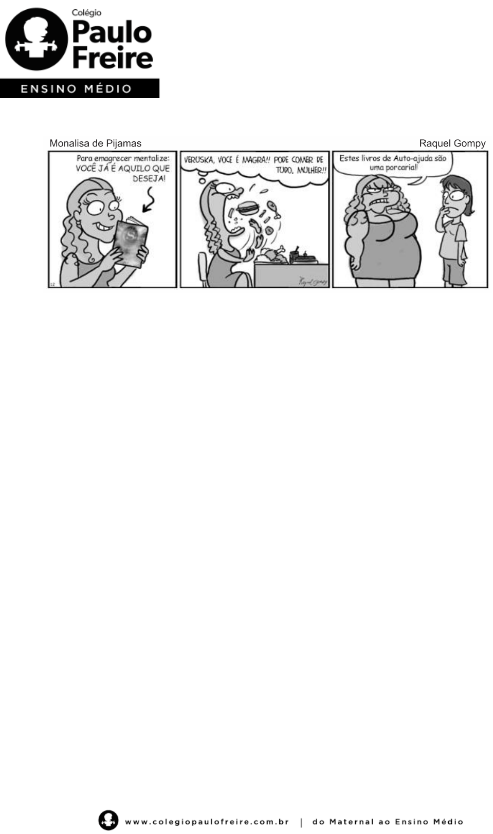 <p>Aluno(a): _____________________________________________________________</p><p>Disciplina: Biologia Professor: Fabio Cecchetti</p><p>Série: 3º ano Turma: 3001 Data: ____/____/_____</p><p>1. Observe a tirinha abaixo e analise as alternativas abaixo como verdadeiras (V) ou falsas (F).</p><p>( ) Uma dieta equilibrada é necessária para a manutenção da saúde e do bem-estar dos indivíduos.</p><p>( ) Uma dieta hipercalórica não fará engordar se o indivíduo mentalizar que aqueles alimentos são</p><p>saudáveis.</p><p>( ) Uma dieta equilibrada não pode, jamais, possuir gordura em sua composição.</p><p>( ) Pelo fato de metade da nossa massa seca (quantidade de componentes restantes quando tiramos</p><p>a água da composição) ser composta por proteína, temos que ingerir o máximo de proteínas que</p><p>pudermos.</p><p>A sequência está correta em</p><p>a) V, V, V, F.</p><p>b) V, F, V, F.</p><p>c) F, V, F, V.</p><p>d) F, F, V, V.</p><p>e) V, F, F, F.</p><p>2. Maria Laís vinha sentindo fortes dores no abdômen. Um dia, quando as dores estavam ainda mais</p><p>intensas, ela procurou ajuda médica. Após detalhados exames de sangue e imagem, o médico concluiu</p><p>que seria necessária uma cirurgia para a retirada da vesícula biliar, que se encontrava com muitos</p><p>cálculos biliares. Para evitar crises recorrentes enquanto aguardava a cirurgia, o médico recomendou à</p><p>Maria Laís uma dieta rigorosa, excluindo da alimentação um determinado grupo de alimentos.</p><p>Considerando a função do órgão destacado no texto, no processo digestivo, os alimentos que Maria foi</p><p>aconselhada a evitar se referem ao grupo dos</p><p>a) carboidratos.</p><p>b) lipídios.</p><p>c) proteínas.</p><p>d) vitaminas.</p><p>e) ácidos nucleicos.</p><p>3. Retirantes (1944) é uma pintura de Cândido Portinari, que retrata corpos muito magros de</p><p>emigrantes nordestinos fugindo da seca do sertão e de suas sequelas sociais, entre elas, a fome e</p><p>desnutrição. Em portadores de distúrbios alimentares, outros fatores de ordem social podem levar às</p><p>mesmas consequências, embora por diferentes causas, dentre elas a distorção da imagem corporal. Na</p><p>tela, Portinari retrata o que vê e interpreta. No espelho, uma adolescente com distúrbios alimentares, de</p><p>certo modo, faz o mesmo.</p><p>Sobre os distúrbios alimentares e sua relação com a desnutrição, analise as afirmativas a seguir:</p><p>I. Na anorexia, o paciente chega a ficar severamente desidratado, ocorrendo a perda de íons, como o</p><p>sódio, o potássio e o cálcio, importantes para a manutenção do equilíbrio hídrico e iônico e o</p><p>funcionamento das células musculares, por exemplo.</p><p>II. Na bulimia, pacientes exibem compulsão alimentar e comportamentos compensatórios à alta ingestão</p><p>de alimentos, como vômitos, uso indevido de laxantes, diuréticos, polivitamínicos e anabolizantes.</p><p>III. Na anorexia e na bulimia, os pacientes praticam jejum e exercícios intensos, além de provocarem</p><p>vômito.</p><p>IV. Os pacientes estão em estado de desnutrição, o que pode acarretar um baixo rendimento escolar e,</p><p>com a progressão dos sintomas da anorexia e da bulimia, podem chegar a óbito.</p><p>V. Para o tratamento da anorexia e da bulimia, é necessária a ação de uma equipe multiprofissional a</p><p>fim de ser feita uma abordagem ampla dos distúrbios, que envolve o uso de medicamentos,</p><p>acompanhamentos nutricional e psicológico por causa dos transtornos relacionados à imagem</p><p>corporal.</p><p>Estão CORRETAS apenas</p><p>a) II e III.</p><p>b) III e V.</p><p>c) I, IV e V.</p><p>d) I, II e IV.</p><p>e) I, III e V.</p><p>4. O sistema digestório humano é produtor de cinco tipos de sucos digestivos: o salivar, produzido</p><p>pelas glândulas salivares e responsável por metabolizar parte do amido; o suco gástrico, elaborado no</p><p>estômago e atuante na digestão proteica; o suco pancreático, originário do pâncreas e atuante no</p><p>duodeno, o qual decompõe proteínas, ácidos nucleicos e alguns carboidratos; o suco biliar, produzido</p><p>no fígado, armazenado na vesícula biliar e atuante no duodeno, onde, apesar de ser desprovido de</p><p>enzimas, auxilia as lipases (enzimas que degradam lipídios) de outros sucos digestivos a metabolizarem</p><p>gorduras e óleos; e o suco entérico, provido de grande diversidade enzimática. Eventualmente surgem</p><p>problemas associados ao trato digestório como a formação de cálculos biliares, caracterizados pela</p><p>cristalização de substâncias que compõem a bile ou suco biliar. Como tratamento podem ser usados</p><p>medicamentos que dissolvem os cálculos ou cirurgia para remover a vesícula biliar.</p><p>LINHARES, S.; GEWANDSZNAJDER, F. Biologia Hoje: os seres vivos - 2. ed. - São Paulo: Ática, 2013.</p><p>320 p.</p><p>Baseado no texto, uma pessoa cuja vesícula biliar foi removida, devido à formação de cálculos biliares,</p><p>terá restrição na dieta de lipídios. Quais, dentre os alimentos abaixo citados, poderão ser parte dessa</p><p>dieta?</p><p>a) Batata frita, toucinho de porco e feijoada.</p><p>b) Rúcula, alface e laranja.</p><p>c) Rabada, picanha e hambúrguer.</p><p>d) Frituras em geral, frango com pele e bisteca suína.</p><p>e) Pele de frango, bisteca de boi e coxinha de frango com catupiry.</p><p>5. A água de coco se torna imprópria para o consumo poucos dias após ser retirada do fruto. Sua</p><p>exposição ao ar atmosférico permite a ação de microrganismos e, principalmente, de substâncias</p><p>químicas, que desencadeiam uma série de reações, como o escurecimento, alterações no valor</p><p>nutritivo, na aparência e no sabor. Por isso, para se evitar esse tipo de ação, essas substâncias são</p><p>removidas da solução, por métodos térmicos ou outra técnica, seguida por microfiltrações.</p><p>Que substâncias químicas causam esse problema na
