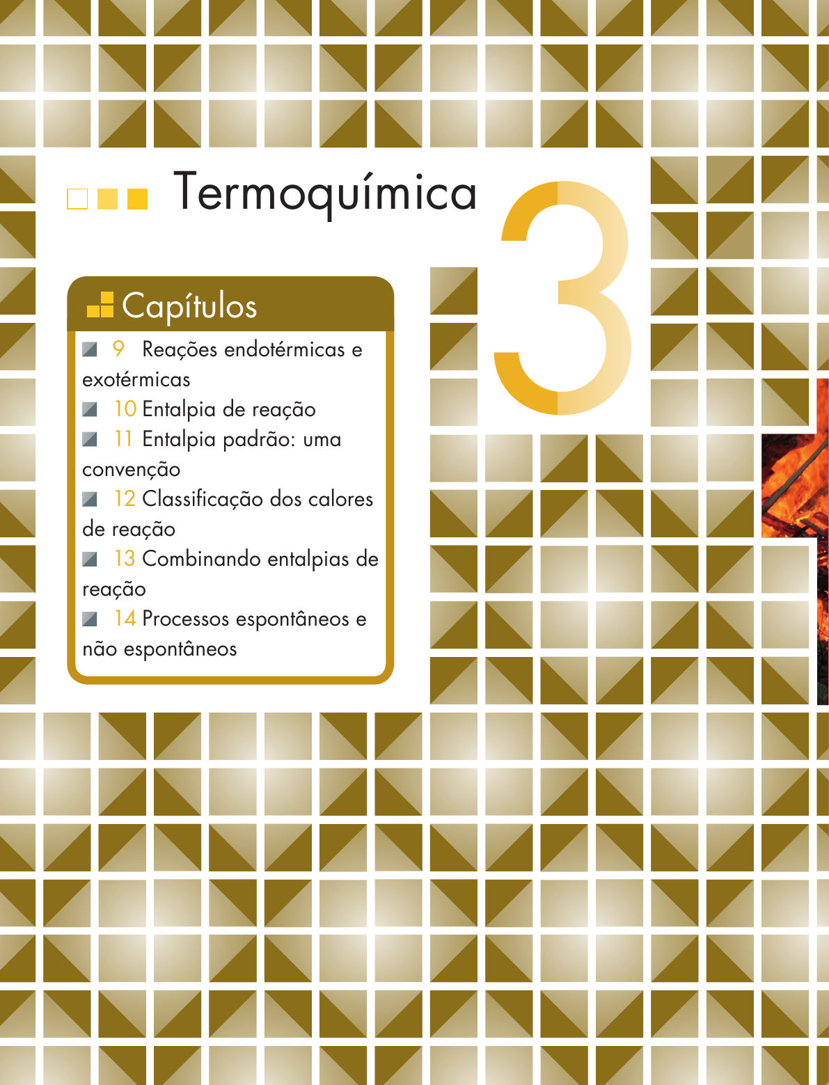 <p>3Termoquímica</p><p>9 Reações endotérmicas e</p><p>exotérmicas</p><p>10 Entalpia de reação</p><p>11 Entalpia padrão: uma</p><p>convenção</p><p>12 Classi!cação dos calores</p><p>de reação</p><p>13 Combinando entalpias de</p><p>reação</p><p>14 Processos espontâneos e</p><p>não espontâneos</p><p>Capítulos</p><p>Atualmente, ter acesso à energia é sinônimo</p><p>de conforto. Durante a Revolução Industrial,</p><p>na Inglaterra, as locomotivas, fábricas e tur-</p><p>binas eram movidas por vapor de água. No</p><p>entanto, o rápido crescimento populacional</p><p>durante o século XX, ocasionado principal-</p><p>mente pela maior produtividade de alimentos</p><p>e pelos avanços da medicina, tornou neces-</p><p>sário “produzir” cada vez mais energia para</p><p>o consumo. Na época da Revolução Indus-</p><p>trial, a Terra era habitada por centenas de</p><p>milhões de habitantes, hoje somos mais de</p><p>sete bilhões. Essa grande demanda de ener-</p><p>gia trouxe consigo uma série de riscos para</p><p>o meio ambiente, pois converteu-se em uma</p><p>força destrutiva em potencial para o planeta</p><p>Terra. O consumo de energia mundial é de</p><p>aproximadamente 12,7 trilhões de joules, ou</p><p>seja, 3,5 milhões de quilowatt-hora a cada</p><p>segundo. Atualmente, a maior parte da ener-</p><p>gia produzida provém da queima de com-</p><p>bustíveis fósseis, termoelétricas, hidroelétricas</p><p>e usinas nucleares. A produção energética</p><p>feita de maneira inadequada pode causar</p><p>contaminações irreversíveis no ambiente.</p><p>Nesse contexto, torna-se extremamente im-</p><p>portante aproveitar de forma sustentável a</p><p>energia acumulada nas ligações químicas</p><p>para a produção de energia, como, por</p><p>exemplo, o calor. Ao estudar essa unidade,</p><p>procure estabelecer um vínculo entre a ener-</p><p>gia na forma de calor, a química e as neces-</p><p>sidades sociais. Não economize sua ener-</p><p>gia e comece logo a estudar os fundamentos</p><p>da relação entre reações químicas e calor.</p><p>Termoquímica</p><p>Desde a Revolução Industrial no século XVIII, a sociedade começou a perceber a impor-</p><p>tância da produção de energia para abastecer as indústrias, os sistemas de comunicação</p><p>e as residências.</p><p>R</p><p>eprodução proibida Art. 184 do C</p><p>ódigo Penal e Lei 9.610 de fevereiro de 1998.</p><p>Reações endotérmicas e exotérmicas9</p><p>126</p><p>Observação</p><p>Introdução</p><p>As reações químicas são acompanhadas por variações de energia, e esse é um</p><p>dos aspectos mais importantes da química. A variação de energia pode ser apro-</p><p>veitada na realização de algum trabalho. A produção de energia é algo funda-</p><p>mental para a sociedade e cerca de 90 % da energia que consumimos é produzida</p><p>por reações químicas como, por exemplo, a combustão de combustíveis fósseis.</p><p>O estudo da energia e de suas transformações é realizado pela termodinâmica, um</p><p>ramo da física que surgiu durante a Revolução Industrial no intuito de melhorar</p><p>o desempenho das revolucionárias máquinas a vapor. Existem diversos tipos de</p><p>energia e transformações, entre elas:</p><p>■ Uma hidrelétrica transforma a energia potencial da água em energia elétrica.</p><p>■ Uma lâmpada !uorescente transforma energia elétrica em energia luminosa.</p><p>■ Uma bateria transforma energia química em energia elétrica.</p><p>■ A queima de combustíveis transforma energia química em energia calorí"ca.</p><p>Dentro da termodinâmica, existe um ramo que estuda as variações de</p><p>energia na forma de calor, que acompanham as reações químicas. Esse ramo é</p><p>denominado termoquímica.</p><p>A termoquímica estuda a variação do calor de um sistema diante da ocorrência</p><p>de uma reação química. Toda reação química absorve ou gera calor, ou seja, há</p><p>sempre uma troca de energia.</p><p>O calor é uma forma de energia em trânsito que passa de um corpo quente</p><p>(maior temperatura) para outro frio (menor temperatura). De acordo com a</p><p>Calorimetria, que é a parte da física que estuda e efetua a medição da quanti-</p><p>dade de calor liberado ou absorvido em um fenômeno, existem dois tipos de</p><p>calor que podem ser trocados: sensível e latente. A troca de calor sensível causa</p><p>variação de temperatura dos corpos e a troca de calor latente causa mudança de</p><p>estado físico. A quantidade de calor sensível e de calor latente pode ser calculada</p><p>pelas seguintes equações:</p><p>Qsensível = m ∙ c ∙ ∆T Qlatente = m ∙ L</p><p>■ Q: quantidade de calor.</p><p>■ m: massa da substância.</p><p>■ c: calor especí"co sensível da substância (quantidade de calor necessária para</p><p>variar em 1 ºC a temperatura de 1 g da substância).</p><p>■ ∆T: variação de temperatura (T"nal – Tinicial).</p><p>■ L: calor especí"co latente.</p><p>Muito cuidado para não</p><p>confundir temperatura com</p><p>calor. O calor só se manifes-</p><p>ta quando há diferença de</p><p>temperatura, que é a medi-</p><p>da do grau de agitação das</p><p>partículas.</p><p>R</p><p>ep</p><p>ro</p><p>du</p><p>çã</p><p>o</p><p>pr</p><p>oi</p><p>bi</p><p>da</p><p>A</p><p>rt.</p><p>1</p><p>84</p><p>d</p><p>o</p><p>C</p><p>ód</p><p>ig</p><p>o</p><p>Pe</p><p>na</p><p>l e</p><p>L</p><p>ei</p><p>9</p><p>.6</p><p>10</p><p>d</p><p>e</p><p>fe</p><p>ve</p><p>re</p><p>iro</p><p>d</p><p>e</p><p>19</p><p>98</p><p>.</p><p>127</p><p>ObservaçõesOs valores de c e L são característicos de cada substância. Os valores que mais</p><p>vamos utilizar são os da água.</p><p>Tipos de processos</p><p>Em relação ao calor, podemos classi"car os processos físicos e químicos em</p><p>exotérmicos ou endotérmicos. Nos processos físicos não ocorre formação de no-</p><p>vas substâncias, já nos químicos ocorre.</p><p>Proce