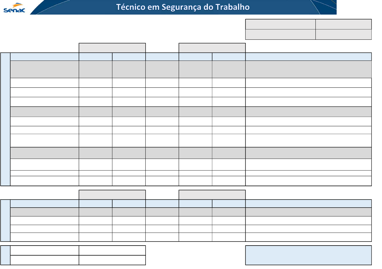 <p>2024 - 2º Ciclo Encontro com Tutor:</p><p>Terças-feiras - 11h às 12h</p><p>Quartas-feiras - 19h30 às 20h30</p><p>Aula inaugural - Bem-vindo!Conheça seu</p><p>curso:</p><p>terça-feira, 9 de abril de 2024</p><p>Início da Etapa I: 08/04/2024 Final da Etapa I: 21/04/2025</p><p>Unidades Curriculares Duração (Semanas)</p><p>Início de Envio das</p><p>Atividades</p><p>Prazo Final de Envio das</p><p>Atividades</p><p>Início Recuperações Término Recuperações</p><p>Aula inaugural - Bem-vindo! Conheça seu curso: 09/04/2024</p><p>Elaborar, implantar e implementar a Política de</p><p>Saúde e Segurança do Trabalho.</p><p>5 08/04/2024 06/05/2024 13/05/2024 20/05/2024</p><p>Realizar avaliação e medidas de controle de riscos</p><p>físicos, químicos e biológicos</p><p>7 13/05/2024 24/06/2024 01/07/2024 08/07/2024</p><p>Realizar avaliação e medidas de controle de riscos</p><p>ergonômicos e de acidentes</p><p>7 01/07/2024 12/08/2024 19/08/2024 26/08/2024</p><p>Projeto Integrador II 19 19/08/2024 16/12/2024 23/12/2024 30/12/2024</p><p>Monitorar riscos ocupacionais. 6 19/08/2024 23/09/2024 30/09/2024 07/10/2024</p><p>Planejar ações educativas em saúde e segurança do</p><p>trabalho</p><p>5 30/09/2024 28/10/2024 04/11/2024 11/11/2024</p><p>Executar ações educativas em saúde e segurança do</p><p>trabalho</p><p>7 04/11/2024 16/12/2024 23/12/2024 30/12/2024</p><p>Projeto Integrador III 17 23/12/2024 07/04/2025 14/04/2025 21/04/2025</p><p>Executar ações de investigação, registro e controle</p><p>de incidentes, acidentes de trabalho e doenças</p><p>ocupacionais.</p><p>7 23/12/2024 03/02/2025 10/02/2025 17/02/2025</p><p>Controlar Situações de Emergência. 3 10/02/2025 24/02/2025 03/03/2025 10/03/2025</p><p>Elaborar, implantar e implementar planos de</p><p>emergência /urgência.</p><p>6 03/03/2025 07/04/2025 14/04/2025 21/04/2025</p><p>Início da Etapa II: 12/05/2025 Final da Etapa II: 06/10/2025</p><p>Unidades Curriculares Duração (Semanas)</p><p>Início de Envio das</p><p>Atividades</p><p>Prazo Final de Envio das</p><p>Atividades</p><p>Início Recuperações Término Recuperações</p><p>Projeto Integrador IV 21 12/05/2025 22/09/2025 29/09/2025 06/10/2025</p><p>Auxiliar e executar ações de elaboração dos</p><p>programas de saúde e segurança do trabalho.</p><p>7 12/05/2025 23/06/2025 30/06/2025 07/07/2025</p><p>Implantar e implementar os programas de saúde e</p><p>segurança do trabalho.</p><p>6 30/06/2025 04/08/2025 11/08/2025 18/08/2025</p><p>Auxiliar a gestão integrada da organização 7 11/08/2025 22/09/2025 29/09/2025 06/10/2025</p><p>UC</p><p>PI</p><p>Et</p><p>ap</p><p>a</p><p>II</p><p>LE</p><p>G</p><p>EN</p><p>D</p><p>AS</p><p>:</p><p>UNIDADE CURRICULAR</p><p>NÃO HÁ PRÉ-REQUISITOS ENTRE AS UCs DESTE CURSO</p><p>PROJETO INTEGRADOR</p><p>Nesta Unidade Curricular a Carga Horaria presencial é ofertada através de recursos tecnológicos</p><p>Nesta Unidade Curricular a Carga Horaria presencial é ofertada através de recursos tecnológicos</p><p>Modalidade de oferta da Carga Horária Presencial da UC</p><p>Et</p><p>ap</p><p>a</p><p>I</p><p>12/08/202408/04/202420Projeto Integrador I</p><p>Modalidade de oferta da Carga Horária Presencial da UC</p><p>Nesta Unidade Curricular a Carga Horaria presencial é ofertada através de recursos tecnológicos</p><p>Nesta Unidade Curricular a Carga Horaria presencial é ofertada através de recursos tecnológicos</p><p>Nesta Unidade Curricular a Carga Horaria presencial é ofertada através de recursos tecnológicos</p><p>Nesta Unidade Curricular a Carga Horaria presencial é ofertada através de recursos tecnológicos</p><p>Nesta Unidade Curricular a Carga Horaria presencial é ofertada através de recursos tecnológicos</p><p>Nesta Unidade Curricular a Carga Horaria presencial é ofertada através de recursos tecnológicos</p><p>Nesta Unidade Curricular a Carga Horaria presencial é ofertada através de recursos tecnológicos</p><p>26/08/202419/08/2024</p><p>Nesta Unidade Curricular a Carga Horaria presencial é ofertada através de recursos tecnológicos</p><p>Nesta Unidade Curricular a Carga Horaria presencial é ofertada através de recursos tecnológicos</p><p>Não há encontro presencial nesta Unidade Curricular</p><p>Nesta Unidade Curricular a Carga Horaria presencial é ofertada através de recursos tecnológicos</p><p>Nesta Unidade Curricular a Carga Horaria presencial é ofertada através de recursos tecnológicos</p><p>Nesta Unidade Curricular a Carga Horaria presencial é ofertada através de recursos tecnológicos</p><p>Nesta Unidade Curricular a Carga Horaria presencial é ofertada através de recursos tecnológicos</p>