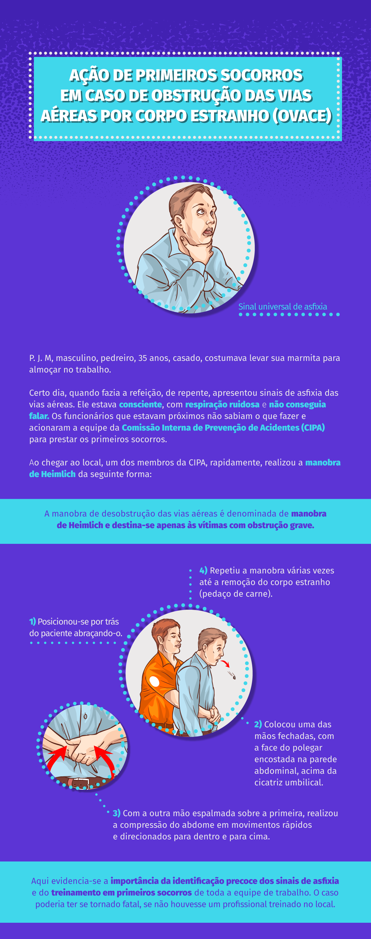 <p>AÇÃO DE PRIMEIROS SOCORROS EM CASO DE OBSTRUÇÃO DASVIAS AÉREAS POR CORPO ESTRANHO (OVACE) Sinal universal de asfixia masculino, pedreiro, 35 anos, casado, costumava levar sua marmita para almoçar no trabalho. Certo dia, quando fazia a refeição, de repente, apresentou sinais de asfixia das vias aéreas. Ele estava consciente, com respiração ruidosa e não conseguia falar. Os funcionários que estavam próximos não sabiam o que fazer e acionaram a equipe da Comissão Interna de Prevenção de Acidentes (CIPA) para prestar os primeiros socorros. Ao chegar ao local, um dos membros da CIPA, rapidamente, realizou a manobra de Heimlich da seguinte forma: A manobra de desobstrução das vias aéreas é denominada de manobra de Heimlich e destina-se apenas às vítimas com obstrução grave. 4) Repetiu a manobra várias vezes até a remoção do corpo estranho (pedaço de carne). 1) Posicionou-se por trás do paciente abraçando-o. 2) Colocou uma das mãos fechadas, com a face do polegar encostada na parede abdominal, acima da cicatriz umbilical. 3) Com a outra mão espalmada sobre a primeira, realizou a compressão do abdome em movimentos rápidos e direcionados para dentro e para cima. Aqui evidencia-se a importância da identificação precoce dos sinais de asfixia e do treinamento em primeiros socorros de toda a equipe de trabalho. o caso poderia ter se tornado fatal, se não houvesse um profissional treinado no local.</p>