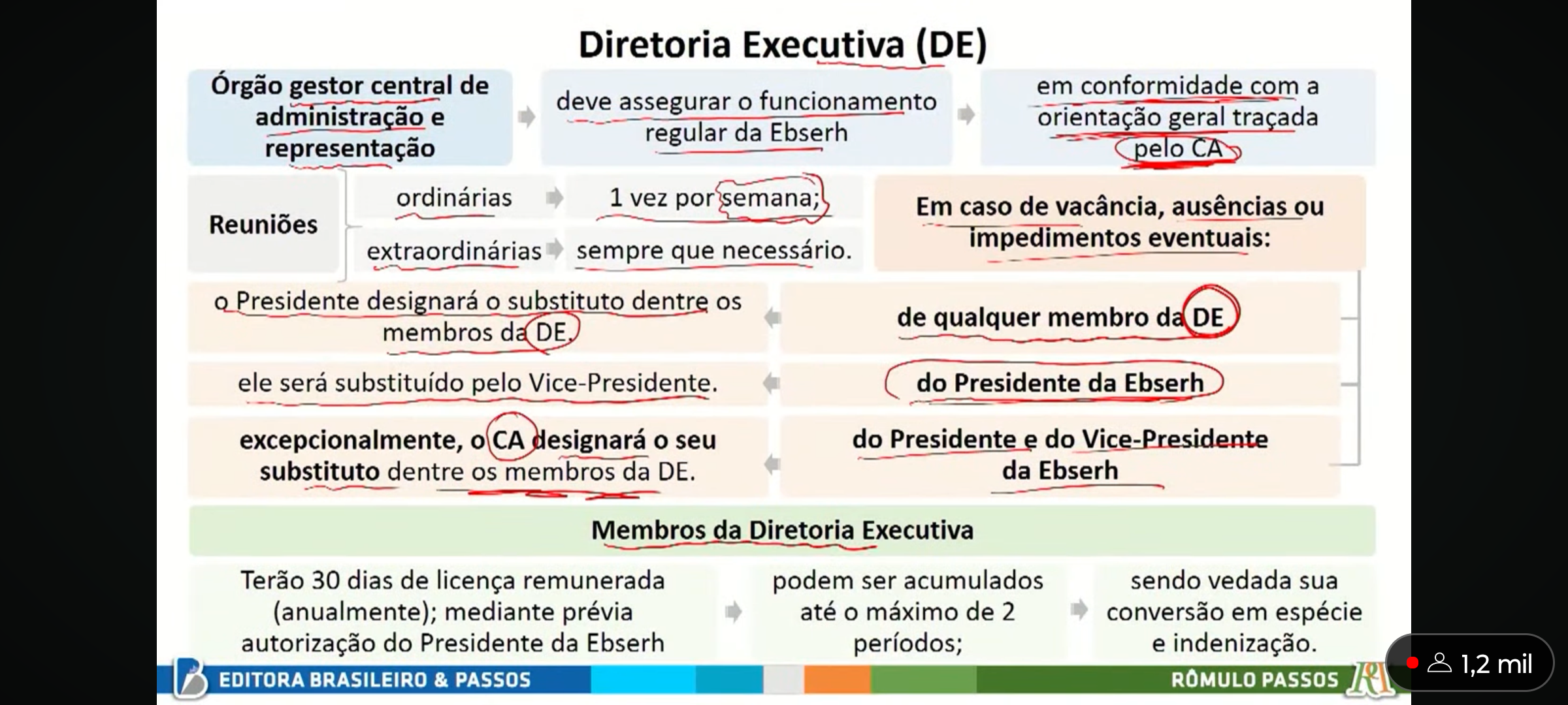 <p>Diretoria Executiva (DE) Órgão gestor central de em conformidade com a deve assegurar funcionamento administração e orientação geral traçada regular da Ebserh representação pelo CA ordinárias 1 vez por semana; Em caso de vacância, ausências ou Reuniões extraordinárias sempre que necessário. impedimentos eventuais: Presidente designará o substituto dentre os membros da DE de qualquer membro da DE ele será substituído pelo Vice-Presidente. do Presidente da Ebserh excepcionalmente, o CA designará o seu do Presidente e do Vice-Presidente substituto dentre os membros da DE. da Ebserh Membros da Diretoria Executiva Terão 30 dias de licença remunerada podem ser acumulados sendo vedada sua (anualmente); mediante prévia até máximo de 2 conversão em espécie autorização do Presidente da Ebserh períodos; e indenização. EDITORA BRASILEIRO & PASSOS RÔMULO PASSOS R</p>