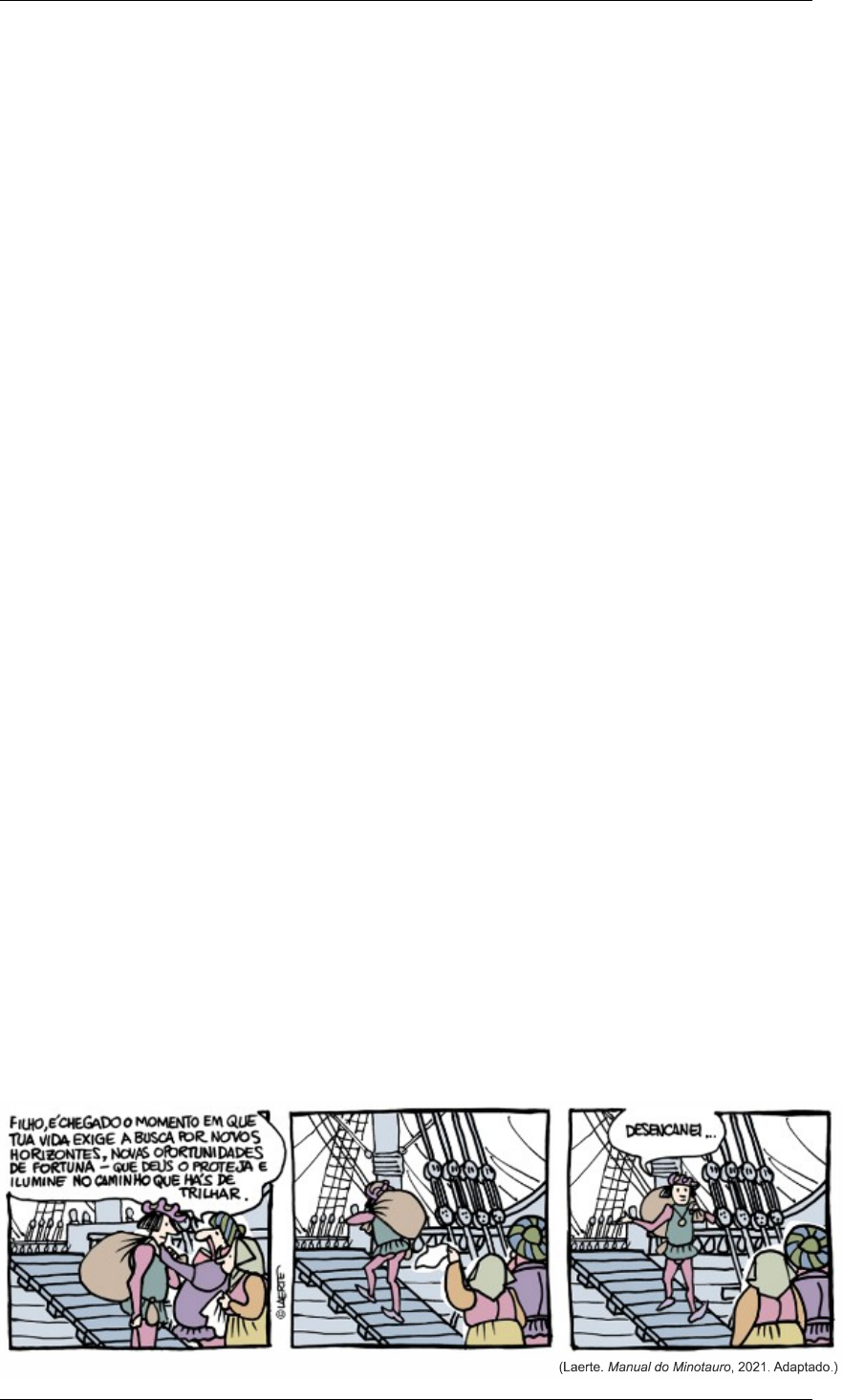 <p>Interbits – SuperPro ® Web</p><p>TEXTO PARA AS PRÓXIMAS 2 QUESTÕES:</p><p>Leia o soneto “Descreve o que era naquele tempo a cidade da Bahia”, do poeta Gregório de Matos (1636-1696)</p><p>A cada canto um grande conselheiro,</p><p>Que nos quer governar cabana e vinha;</p><p>Não sabem governar sua cozinha,</p><p>E podem governar o mundo inteiro.</p><p>Em cada porta um bem frequente olheiro,</p><p>Que a vida do vizinho e da vizinha</p><p>Pesquisa, escuta, espreita e esquadrinha,</p><p>Para o levar à praça e ao terreiro.</p><p>Muitos mulatos desavergonhados,</p><p>Trazidos sob os pés os homens nobres¹,</p><p>Posta nas palmas toda a picardia,</p><p>Estupendas usuras nos mercados,</p><p>Todos os que não furtam muito pobres:</p><p>E eis aqui a cidade da Bahia.</p><p>(Gregório de Matos. Poemas escolhidos, 2010.)</p><p>1 Trazidos sob os pés os homens nobres: na visão de Gregório de Matos, os mulatos em ascensão subjugam com esperteza os verdadeiros “homens nobres”.</p><p>1. (Unesp 2023) No soneto, o pronome “o” refere-se a</p><p>a) “mundo”.</p><p>b) “terreiro”.</p><p>c) “conselheiro”.</p><p>d) “olheiro”.</p><p>e) “vizinho”.</p><p>2. (Unesp 2023) No soneto, verifica-se rima entre palavras de classes gramaticais diferentes</p><p>a) em “vizinha”/“esquadrinha” (2ª estrofe) e em “nobres”/“pobres” (3ª /4ª estrofes).</p><p>b) em “vinha”/“cozinha” (1ª estrofe) e em “olheiro”/“terreiro” (2ª estrofe).</p><p>c) em “conselheiro”/“inteiro” (1ª estrofe) e em “olheiro”/“terreiro” (2ª estrofe).</p><p>d) em “conselheiro”/“inteiro” (1ª estrofe) e em “vizinha”/“esquadrinha” (2ª estrofe).</p><p>e) em “desavergonhados”/“mercados” (3ª /4ª estrofes) e em “nobres”/“pobres” (3ª /4ª estrofes).</p><p>TEXTO PARA A PRÓXIMA QUESTÃO:</p><p>Examine a tirinha da cartunista Laerte.</p><p>3. (Unesp 2023) Na fala do pai, os dois pronomes relativos “que” referem-se, respectivamente, a</p><p>a) “vida” e “Deus”.</p><p>b) “momento” e “caminho”.</p><p>c) “Deus” e “caminho”.</p><p>d) “momento” e “Deus”.</p><p>e) “vida” e “fortuna”.</p><p>TEXTO PARA A PRÓXIMA QUESTÃO:</p><p>Leia o trecho do ensaio “O filtro da leitura”, de Luís Augusto Fischer</p><p>Num exemplo esquemático: imaginemos que, quando menino, um filho tenha um momento de raiva contra o pai, uma daquelas raivas radicais que qualquer um tem, mas não confessa; e suponhamos que, bem na hora em que o menino esteja vivendo essa raiva, chegue a notícia de que o pai sofreu um acidente de carro, um terrível acidente, que o deixa estragado, que talvez até o mate. Na cabeça do menino, se estabelece uma relação de causa e consequência entre a raiva e o acidente, de forma que ele passe a viver, inconscientemente, como um culpado pelo problema todo. Será capaz de viver décadas carregando essa culpa, arrastando-a para onde for, sem sequer saber que ela existe, porque a relação de causa e efeito se estabeleceu num nível totalmente inconsciente, inacessível para a consciência racional, salvo, segundo Freud, pela análise. Análise que, nesse exemplo, trataria de trazer tal nexo causal para a consciência, para desfazê-lo, para mostrar que ele não tem cabimento, porque é uma falsa crença.</p><p>(Filosofia mínima: ler, escrever, ensinar, aprender, 2011.)</p><p>4. (Famema 2023) Os dois termos sublinhados no texto referem-se, respectivamente, a</p><p>a) “menino” e “pai”.</p><p>b) “hora” e “carro”.</p><p>c) “menino” e “acidente”.</p><p>d) “hora” e “pai”.</p><p>e) “hora” e “acidente”.</p><p>TEXTO PARA A PRÓXIMA QUESTÃO:</p><p>A taxação de livros tem um efeito cascata que acaba custando caro não apenas ao leitor, como também ao mercado editorial – que há anos não anda bem das pernas – e, em última instância, ao desenvolvimento econômico do país. A gente explica. Taxar um produto significa, quase sempre, um aumento no valor do produto final. Isso porque ao menos uma parte desse imposto será repassada ao consumidor, especialmente se considerarmos que as editoras e livrarias enfrentam há anos uma crise que agora está intensificada pela pandemia e não poderiam retirar o valor desse imposto de seu já apertado lucro. Livros mais caros também resultam em queda de vendas, que, por sua vez, enfraquece ainda mais editoras e as impede de investir em novas publicações – especialmente aquelas de menor apelo comercial, mas igualmente importantes para a pluralidade de ideias. Já deu para perceber a confusão, não é? Mas, além disso, qual seria o custo de uma sociedade com menos leitores e menos livros?</p><p>Taís Ilhéu. “Por que taxar os livros pode gerar retrocesso social e econômico no país”. Guia do Estudante. Setembro/2020. Adaptado.</p><p>5. (Fuvest 2022) No texto, os pronomes em negrito referem-se, respectivamente, a:</p><p>a) taxação de livros, mercado editorial, crise, queda de vendas.</p><p>b) taxação de livros, leitor, crise, queda de vendas.</p><p>c) efeito cascata, mercado editorial, crise, queda de vendas.</p><p>d) efeito cascata, mercado editorial, livrarias, livros.</p><p>e) efeito cascata, leitor, crise, livros.</p><p>TEXTO PARA A PRÓXIMA QUESTÃO:</p><p>Leia o texto de Eduardo Bueno.</p><p>No Brasil, como no restante do Novo Mundo, o que separa a história da pré-história é mais do que um mero prefixo. Existe, entre os dois períodos, um abismo de desconhecimento e incompreensão. Embora o trabalho dos arqueólogos literalmente se aprofunde cada vez mais, restam ainda imensas lacunas a respeito dos habitantes que, em tempos remotos, ocuparam o território que viria a ser o Brasil. O que já se sabe, porém, permite afirmar que a herança “pré-histórica” – ou seja, o legado dos povos que por no mínimo dez milênios aqui viveram – é bem mais sólida e está muito mais presente do que o sens