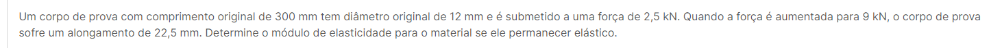 <p>Um corpo de prova com é aumentada para 9 kN, O corpo de prova sofre um alongamento de 22,5 mm. Determine módulo de elasticidade para material se</p>