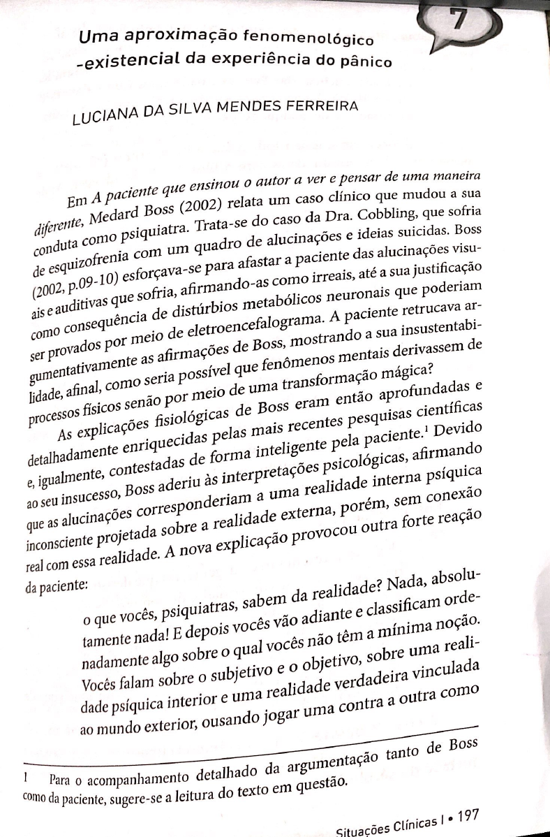 <p>7 Uma aproximação -existencial da experiência do pânico LUCIANA DA SILVA MENDES FERREIRA A paciente que ensinou o autor a ver e pensar de uma maneira Em Medard Boss (2002) relata do um caso caso da Dra. clínico Cobbling, que mudou que sofria a sua conduta diferente, como psiquiatra. com um quadro Trata-se de alucinações a e das ideias alucinações suicidas. visu- Boss de esquizofrenia esforçava-se para afastar paciente até justificação (2002, p.09-10) sofria, afirmando-as como irreais, neuronais a sua que poderiam como ais e consequência meio de eletroencefalograma. A paciente a sua insustentabi- retrucava auditivas que de distúrbios metabólicos ar- provados por afirmações de Boss, mostrando derivassem de gumentativamente ser afinal, como as seria possível que fenômenos transformação mentais mágica? processos lidade, físicos senão por meio de de uma Boss eram então aprofundadas científicas e detalhadamente As explicações enriquecidas fisiológicas forma pelas mais inteligente recentes pela pesquisas afirmando Devido e, igualmente, contestadas aderiu de às interpretações psicológicas, interna psíquica que ao seu as insucesso, alucinações Boss corresponderiam sobre realidade a uma externa, realidade porém, sem forte conexão reação inconsciente real com essa projetada realidade. A nova a explicação provocou outra da paciente: vocês, psiquiatras, sabem da realidade? e classificam Nada, absolu- orde- nadamente tamente nada! E sobre o qual vocês não têm sobre a mínima uma reali- o que depois vocês vão adiante noção. Vocês algo subjetivo e o objetivo, vinculada falam sobre o uma realidade verdadeira como ao dade mundo psíquica exterior, interior ousando e jogar uma contra a outra Boss 1 Para acompanhamento detalhado da argumentação tanto de como da paciente, sugere-se a leitura do texto em questão. Situações Clínicas I 197</p><p>fosse verdadeira e a outra puramente dizer com fictícia e alu- se uma Mas o que é que você quer a palavra alucinação, cinatória. já que você ignora totalmente o que é a chamada realidade alucinatória? Palavras, nada mais que palavras atrás delas não há nada, precisamente nada; nenhuma com- e preensão real de qualquer espécie! (Boss, 2002, p. Boss colocou em questão toda a sua atitude como psiquiatra iniciou um diálogo aprofundado com a filosofia de Após e uma revisão de sua conduta, disse à paciente: Você está perfeitamente certa. Não faz sentido dar realidade prioridade sobre a outra. Seria bastante a uma nossa do parte sustentar que esta mesa diante de nós é fútil da eles que iludirem os seus a espiões de simplesmente mais real mente minha percepção e serem por os a você. Por que não os deixamos se fenômenos que revelam ser? Existe somente manterem como digna se de nossa atenção, que é considerar o sentido uma coisa que piões a desvela para nós. Se você continua encontrando daquilo cada esquina e se um psiquiatra tenta reduzir es- percepções de a meras alucinações fictícias [...] então essas concordar com você plenamente, que ele eu teria de coisas sem sentido, que absolutamente não estaria falando nossa compreensão das suas (Boss, 2002, promovem p. 14). a Boss defende ainda: Nada se apresenta mais urgente, do que desistir de uma vez por todas, e com sinceridade, de 0 ser humano de respeito psicológicas. sempre decompor com a ajuda de teorias Antes trata- se recuperar o devido diante da autenticidade originalidade dada de cada fenômeno humano. Temos que permitir que exista o que se manifesta, como aquilo que ele mesmo revela. (1988, p. 25). A crise de Boss retrata bem a profunda transformação pela qual segunda psiquiatria, a psicologia e a psicopatologia passaram durante de a Husserl metade do século XX, por influência das fenomenologias 198 Luciana da Silva Mendes Ferreira</p><p>e Heidegger. que há em comum entre as diferentes fundamentação filosófica da compreensão das psicopatologias iniciativas e do é a humano, e a adoção da fenomenologia para esclarecimento do ser vivenciado pelo paciente. Assim, não se adota a orientação das ciências que é naturais, ciências (Cardinalli, 2002, p. 76-77). recusando-se, portanto, modelo explicativo causal típico dessas Sob a influência da filosofia e das iniciativas da psiquiatria, em de Binswanger e Boss, surgiram diversas abordagens em particular, que buscavam uma alternativa ao modelo das ciências natu- psicologia a prática psicoterápica. De acordo com Feijoo (2011a, p. 21), rais para e o behaviorismo representam as vertentes do idealismo a psicanálise empirismo e o positivismo, contra as quais se orientava a fenomenologia diante das restrições dessas psicologias, nascem May: as moderno, o de Husserl e, posteriormente, a de Heidegger. Posicio- psicolo- gias nando-se humanista e existencial-humanista. Como afirma nova proposta] não nega, entretanto, a validade estudo do de condicionamento, [essa a formulação de impulsos, o so- mecanismos individualizados, e assim por diante. Ela mente sustenta que nós nunca podemos explicar ou enten- der qualquer ser humano existente, em tais bases. E o pe- baseada em tais métodos. Parece que existe a seguinte lei rigo surge quando a imagem do homem é exclusivamente atividade: quanto mais acurada e pormenorizadamente pudermos em descrever um dado mecanismo, tanto mais per- deremos de vista a pessoa existente. 16-17). Porém, argumenta Feijoo: "Embora essas perspectivas critiquem a posição da psicanálise e behaviorismo clássicos pelo modo como pensaram o psíquico por meio de uma estrutura e funcionamento mecanizados -, elas continuam partindo de uma forma ou de outra da noção de sujeito interiorizado". (2011a, p. 17-18). Isso se dá por meio da noção de pessoa que preserva o valor de der um "eu" ou "mundo psíquico". Ora, como Boss (1988) ajuda a enten- pois, em Angústia, culpa e libertação, é propriamente esse o problema, todos eles se fundam 